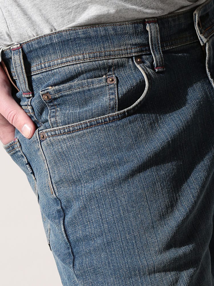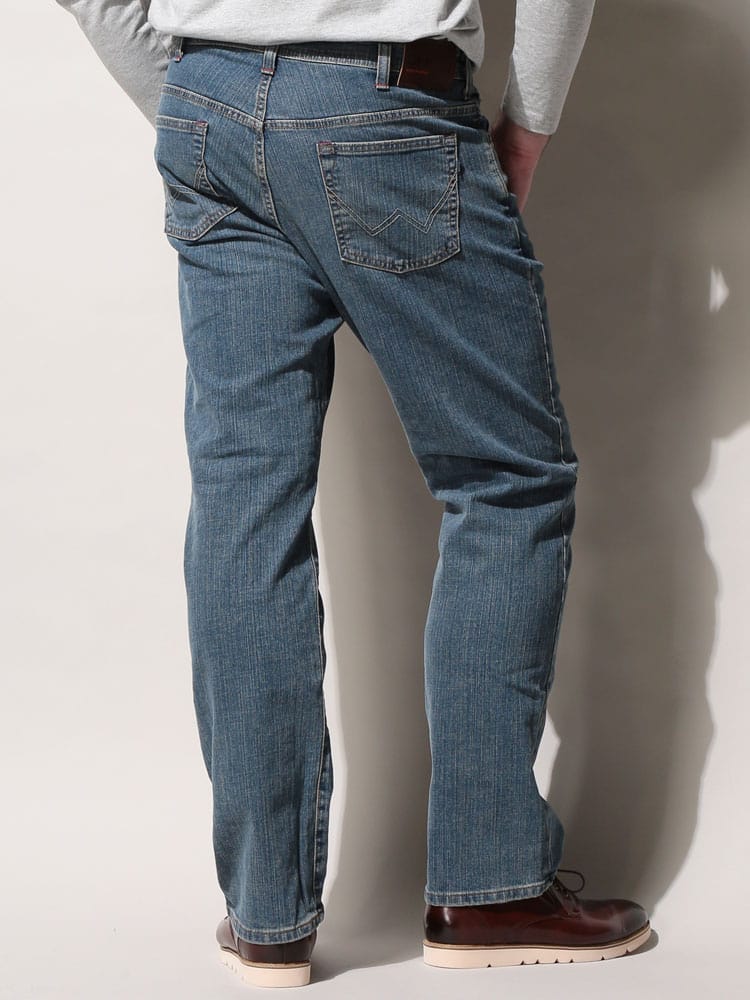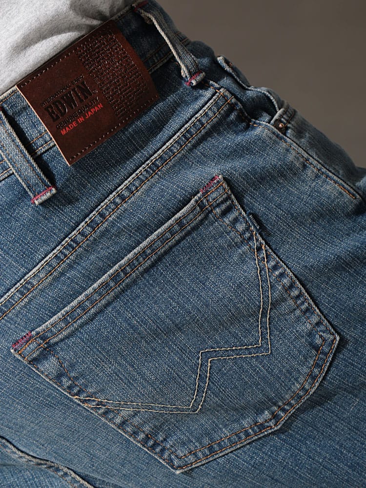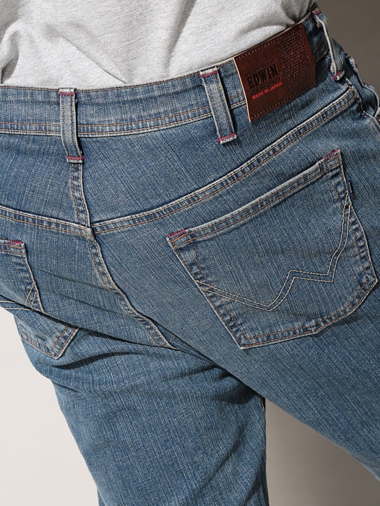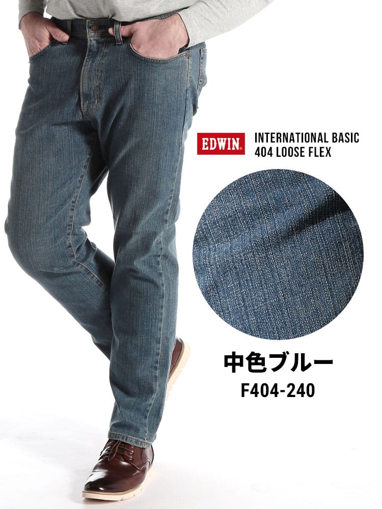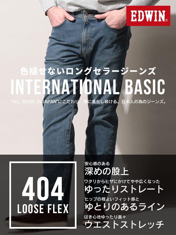 EDWIN 404 FLEX INTERNATIONAL BASIC ジーンズ。伸縮性のあるデニム生地を使用。ヒップ周りや股上にもゆとりを持たせたシルエットです。立つ、座るなど体の動きに合わせた快適な穿き心地を実現したEDWINのロングセラージーンズです。