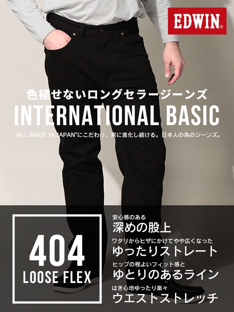 EDWIN 404 FLEX INTERNATIONAL BASIC ジーンズ。伸縮性のあるデニム生地を使用。ヒップ周りや股上にもゆとりを持たせたシルエットです。立つ、座るなど体の動きに合わせた快適な穿き心地を実現したEDWINのロングセラージーンズです。