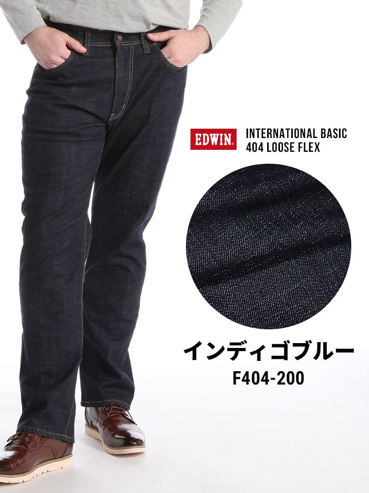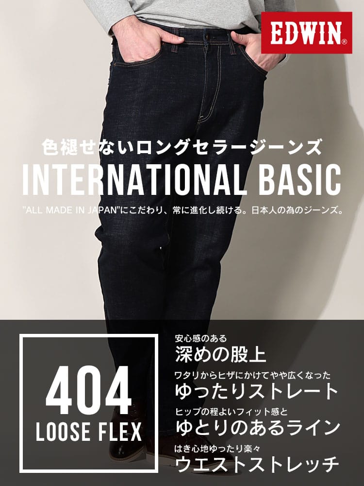 EDWIN 404 LOOSE FLEX INTERNATIONAL BASIC ジーンズ。伸縮性のあるデニム生地を使用。ヒップ周りや股上にもゆとりを持たせたゆったりルーズシルエットです。立つ、座るなど体の動きに合わせた快適な穿き心地を実現したEDWINのロングセラージーンズです。