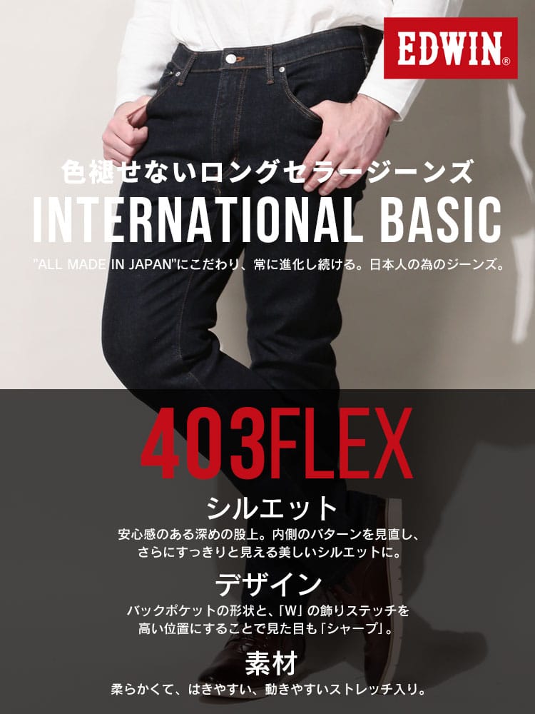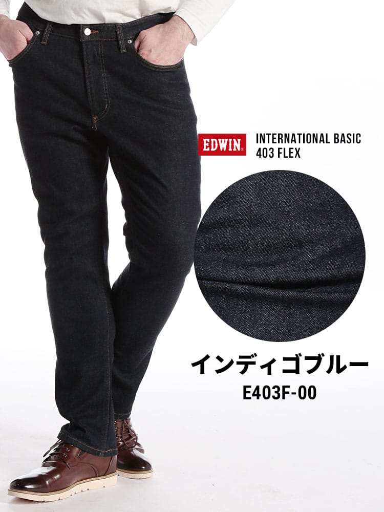 EDWINのやわらかストレッチ ストレート ジーンズ 403 FLEX ONEWASH。すっきりとしたストレートシルエットがきれいめな印象のパンツ。やわらかストレッチで快適な履き心地を提供します。オンスタイルの外しから、カジュアルダウンコーデまでラクにこなす1本です。