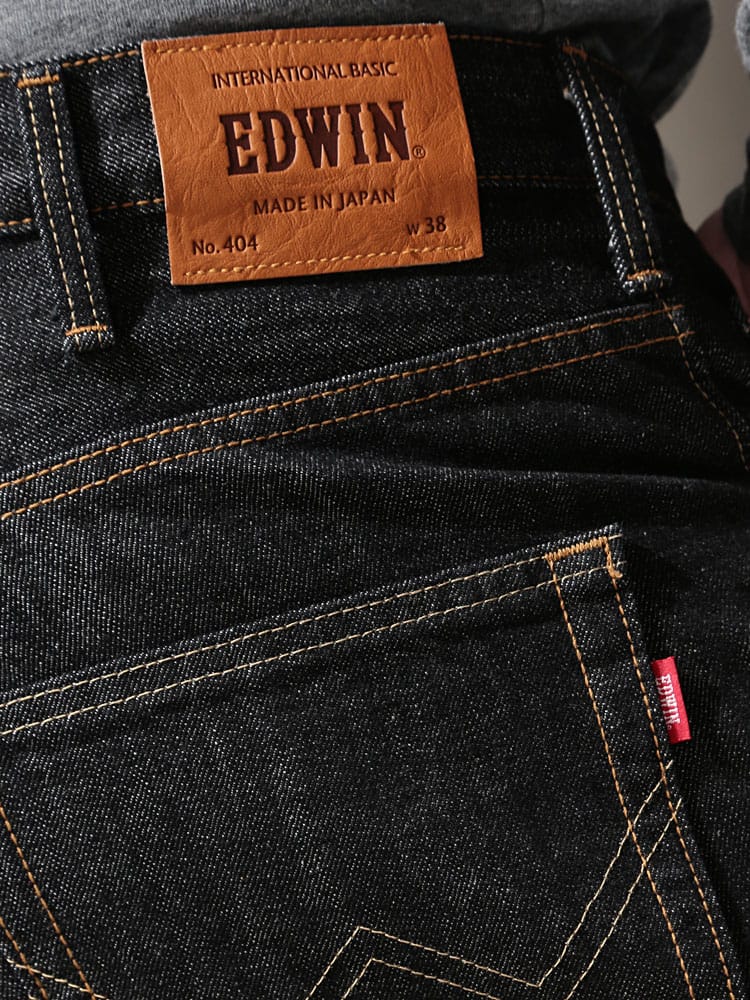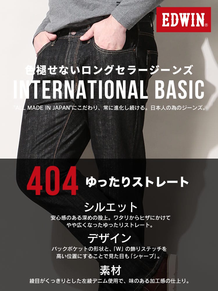 EDWINの404ゆったりストレートジーンズです。幅広いシルエットに対応したEDWINのロングセラーシリーズINTERNATIONAL BASIC。股上深めでゆったりとした快適な穿き心地。膝から下まですっきりとしたシルエットをだすシンプルなストレートタイプ。被せリベット仕様。コインポケットはトライアングル形状。右ヒップポケットにはタブ。フロントサイドのポケットは幅を広くし手の出し入れが楽々。長年愛用したかのようなヴィンテージ感のあるジーンズです。