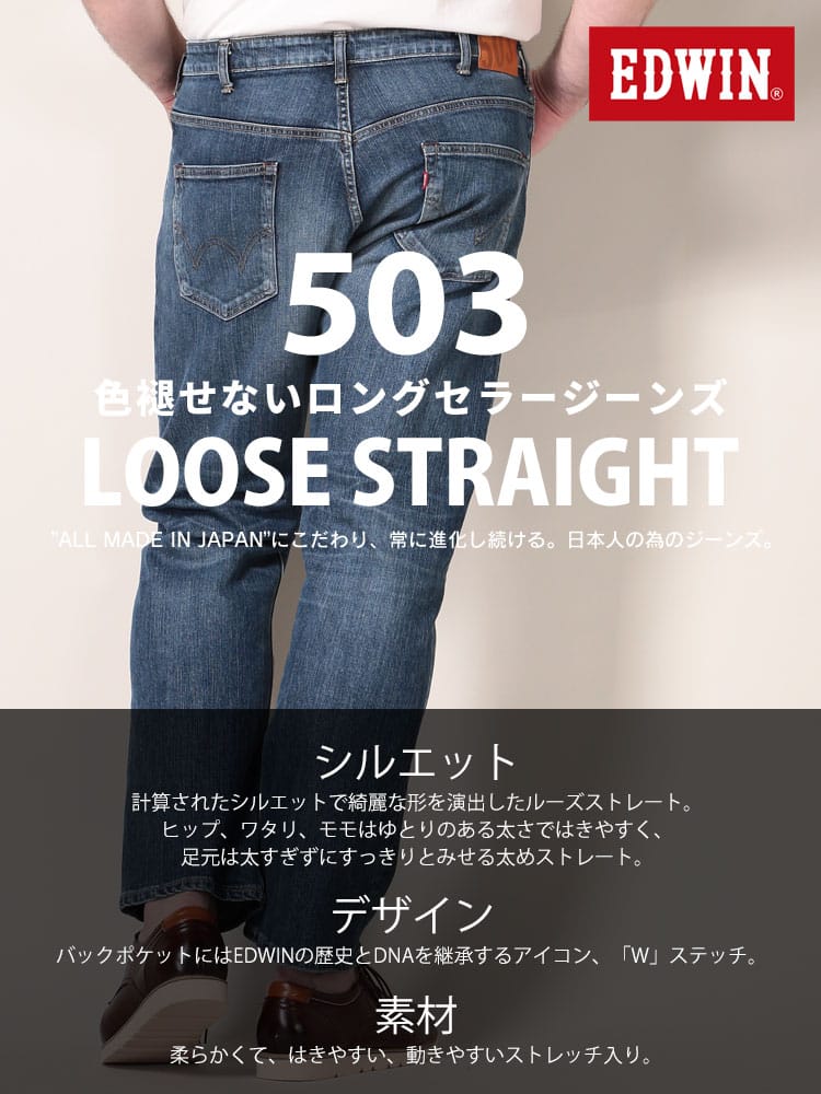 履く人を選ばないEDWINのルーズ ストレート ジーンズ 503です。ヒップ周りや股上にもゆとりを持たせたゆったりルーズシルエット。牛革ラベル、ポケットのステッチ&赤ラベルが、定番ながらもバックスタイルのポイント。正統派なデザインでどんなトップスともコーディネートできます。