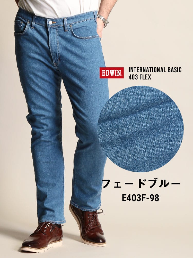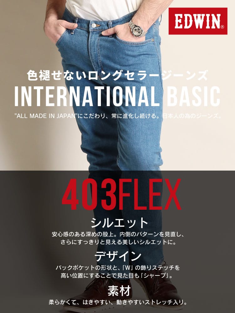 EDWINのやわらかストレッチ ストレート ジーンズ 403 FLEX。すっきりとしたストレートシルエットがきれいめな印象のパンツ。やわらかストレッチで快適な履き心地を提供します。オンスタイルの外しから、カジュアルダウンコーデまでラクにこなす1本です。