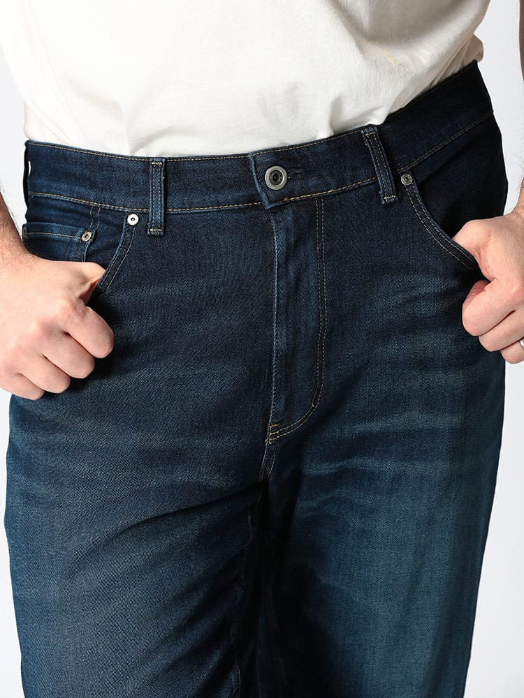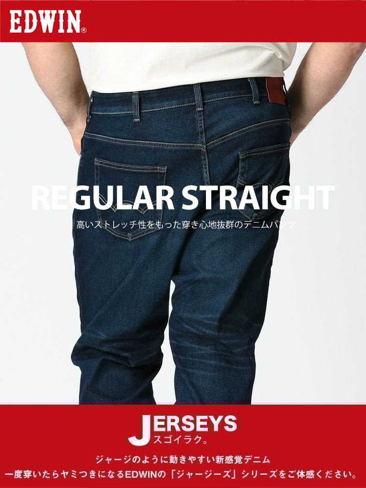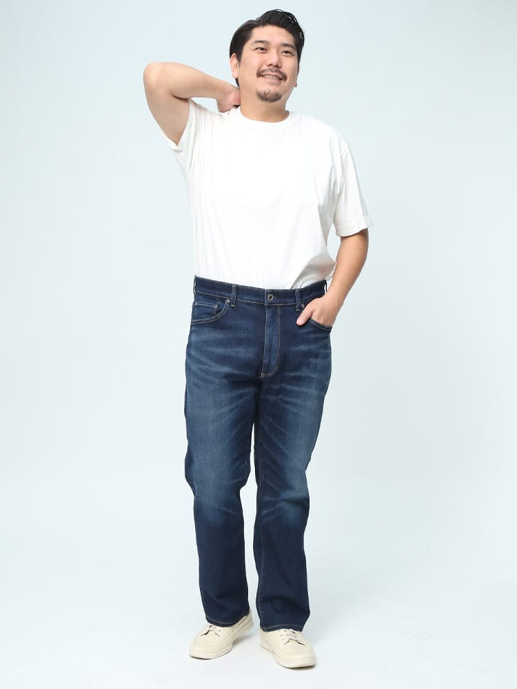 【生地・加工】JERSEYS史上最高のストレッチ性を誇る日本のカイハラ社製 MOTION DENIMを採用。抜群の伸長回復率をもったデニム『MOTION DENIM』をJERSEYS用によりデニムらしさを追求した素材にグレードアップ。変則繻子組織を応用し横糸には特性の違う二種類の糸を打ち込むことで、デニムらしい表面感とニットの様な穿き心地に加え、年間快適に着用できる肌触りをプラスしました。環境面を配慮したオゾン脱色加工を工程に組み入れることで、今までよりも少ない水で表面の無駄なインディゴを除去し、クリーンな表面感を実現。【シルエット】ストンとまっすぐ落ちるルーズなシルエットながら、裾幅を少し細く設定することで野暮ったくならないすっきりストレートロールアップでも楽しめるような少し長めのレングス設定。【仕様】伸びるウエスト仕様!JERSEYS用に開発したストレッチ性のある接着芯地を使用することで、伸びる仕様ながら、ウエストの安定性も両立。着用時のウエストサイズの変動や体を動かす際の十分な可動域を確保できる新しい仕様です。