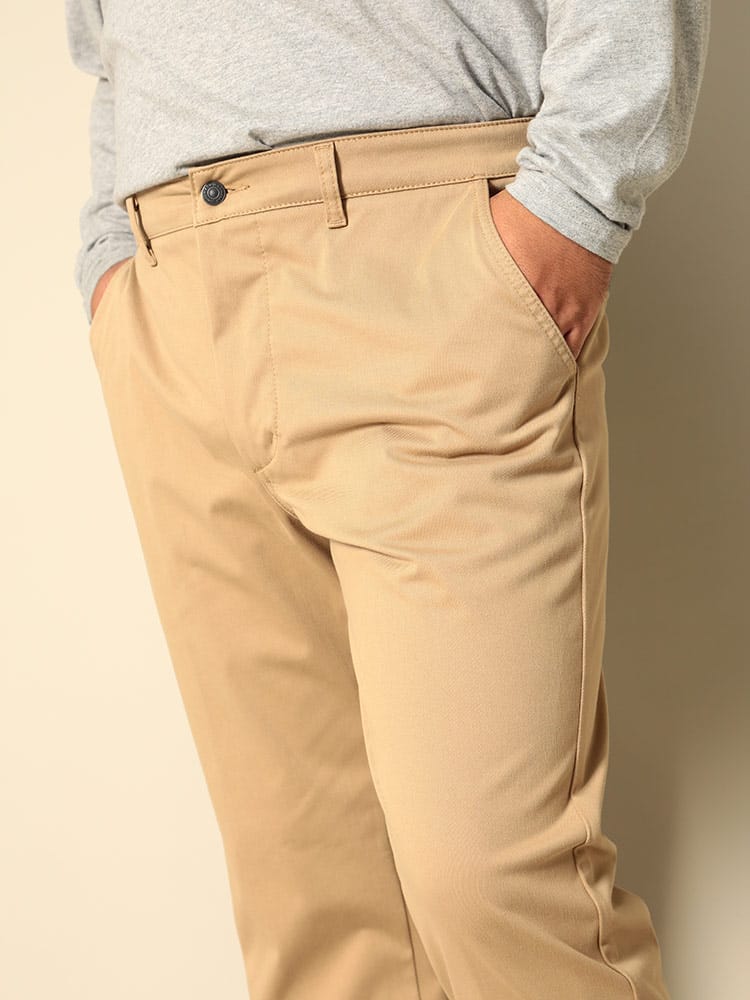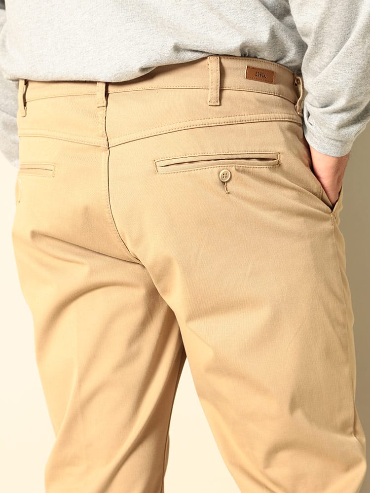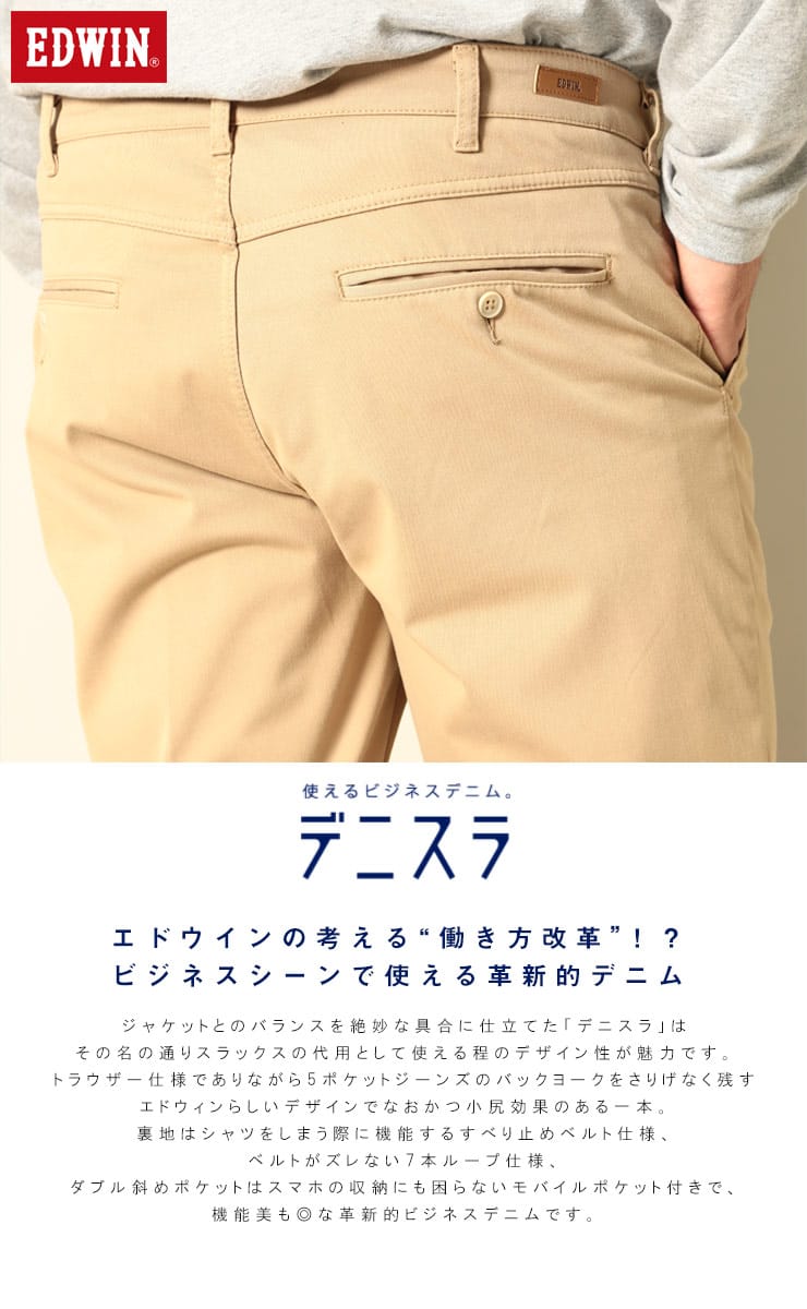 エドウインの考える”働き方改革”は”穿き方改革”です。使えるビジネスデニム「デニスラ」の挑戦!ハイパフォーマンス オリジナルニットデニム。ジャケットとのバランスも絶妙なビジネスシーンに映えるデニム。トラウザー仕様でありながら5ポケットジーンズのバックヨークをさりげなく残すオリジナルデザインがヒップをバランスよく小尻に演出します。裏地はシャツをしまう際に機能するすべり止めベルト仕様。ベルトがズレない7本ループ仕様。ダブル斜めポケットはスマホの収納にも困らないモバイルポケット付き。バックスタイルがキレイに見えるようにポケットにボタンを付けました。スマートなテーパードフィットは、ジャケットコーデのために開発された新フィット。穿きやすくシワの出ないヒップラインで、裾にかけてスッキリはいていただけるスリムテーパード。