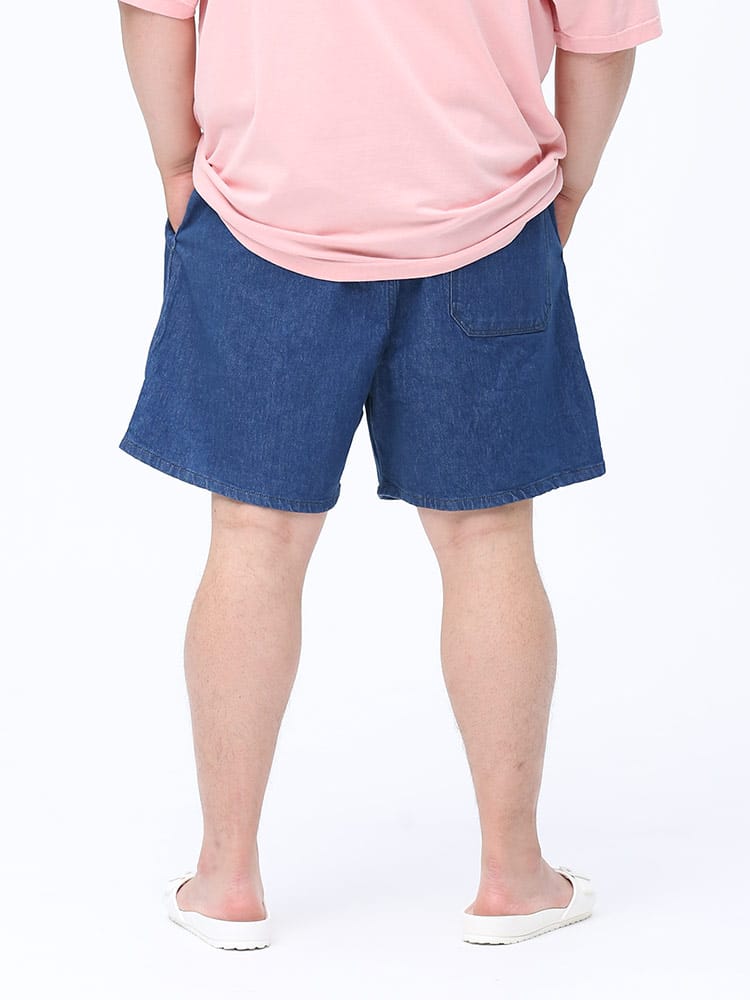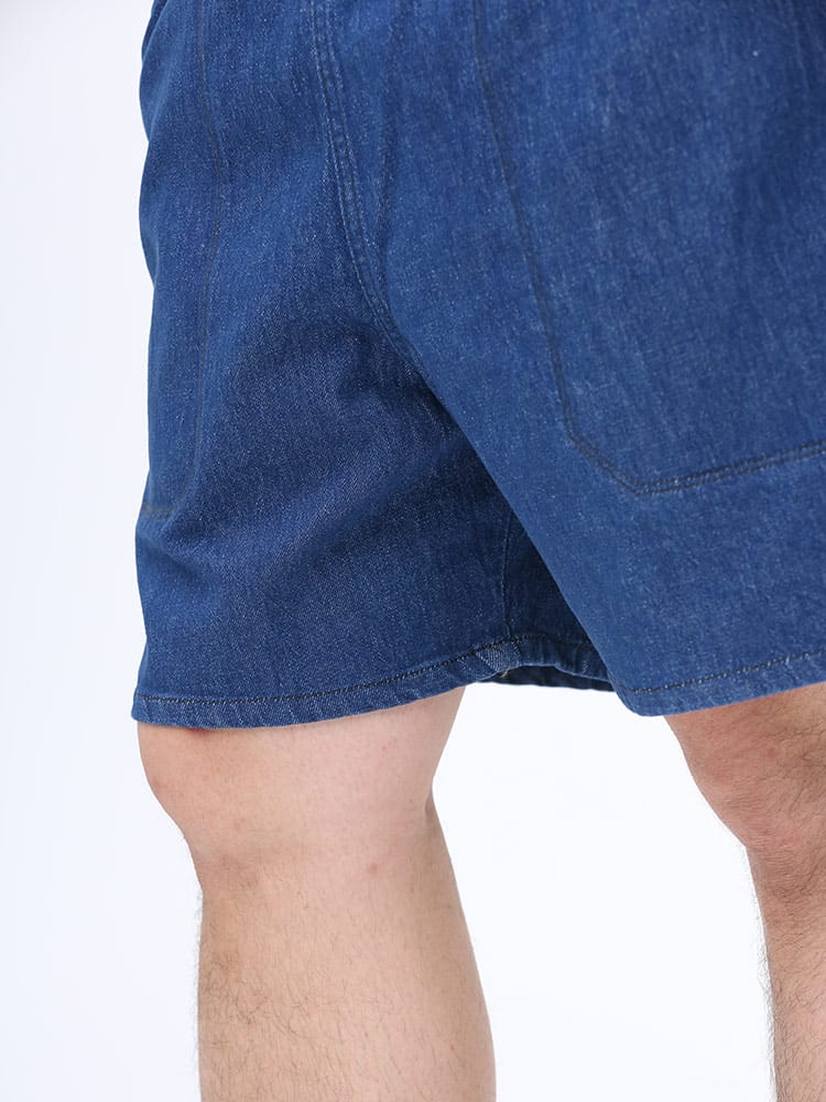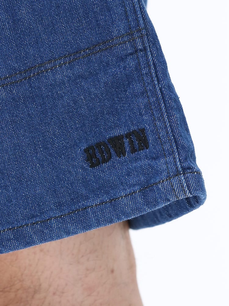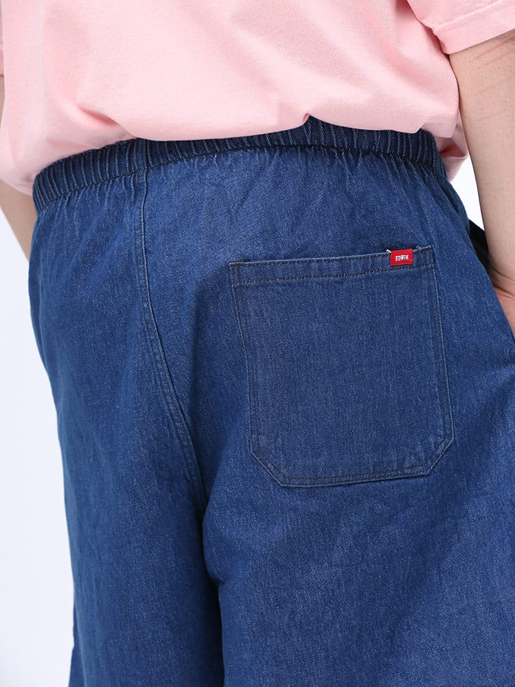 EDWINのデニム ショートパンツ ATHLETIC。ガシガシ洗えて気楽に穿ける休日に大活躍のショートパンツです。ウエストゴムで脱ぎ穿きも簡単。内側にドローコードが付いており、微調整もできます。ストレッチが入っているので、部屋でも外でもノンストレス。ベーシックなTシャツとの相性抜群です。左裾にロゴ刺繍。