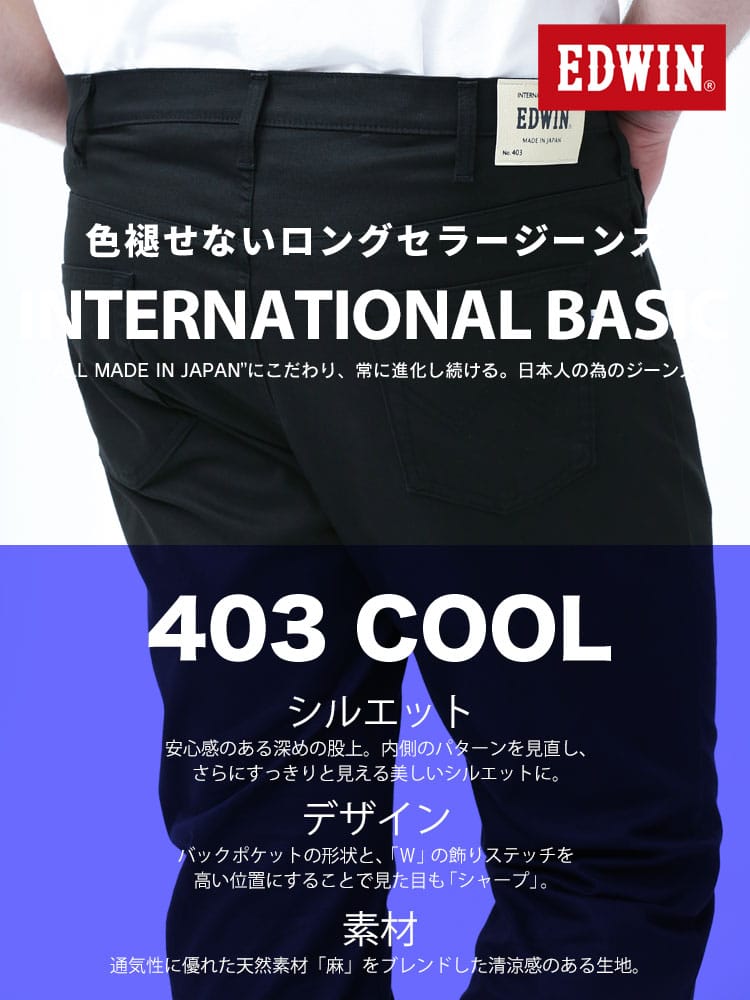 EDWINの麻混 ジップフライ ストレート ジーンズ 403 COOLCOOL。デビュー時から約20年!毎年進化を続けるオンオフ使えるEDWINの「夏のロングセラーシリーズ」。生地に麻を織り交ぜる事により、軽く風合がいいパンツに仕上がってます。さらに肌に触れる生地には『吸水速乾性』に優れ、『接触冷感』効果もある素材を使用。機能満載の夏にかかせない定番パンツ。シルエットは足元すっきりストレート。