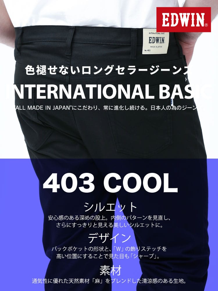 EDWINの麻混 ジップフライ ストレート ジーンズ 403 COOLCOOL。デビュー時から約20年!毎年進化を続けるオンオフ使えるEDWINの「夏のロングセラーシリーズ」。生地に麻を織り交ぜる事により、軽く風合がいいパンツに仕上がってます。さらに肌に触れる生地には『吸水速乾性』に優れ、『接触冷感』効果もある素材を使用。機能満載の夏にかかせない定番パンツ。シルエットは足元すっきりストレート。
