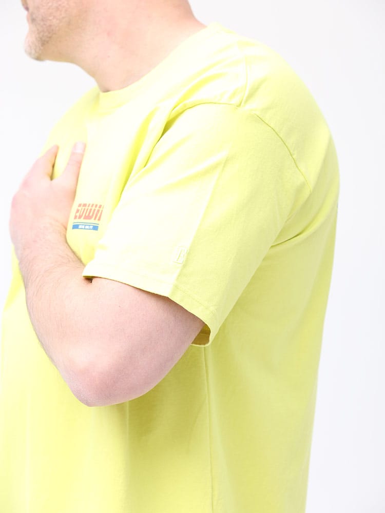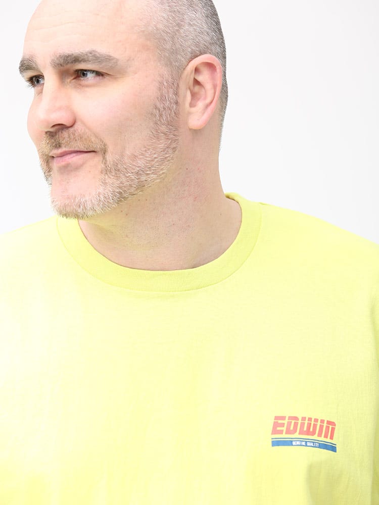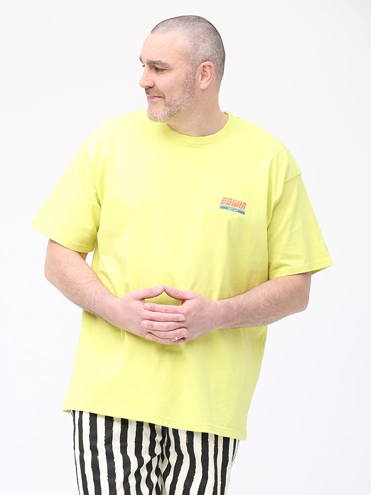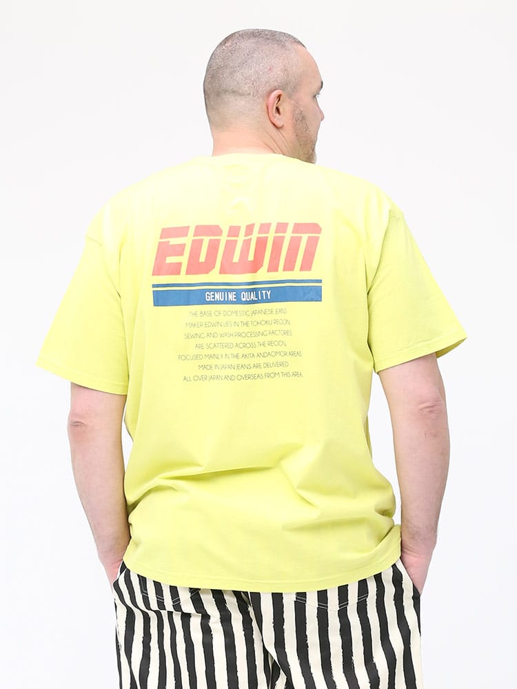 ストリートシーンに映えるバックプリントデザインのEDWINのクルーネック 半袖 Tシャツです。フロント左胸にロゴプリント。左袖にEの刺繍。首元はベーシックなクルーネック。肌触りの良いしっかりとしたコットン生地を使用し、着心地抜群です。