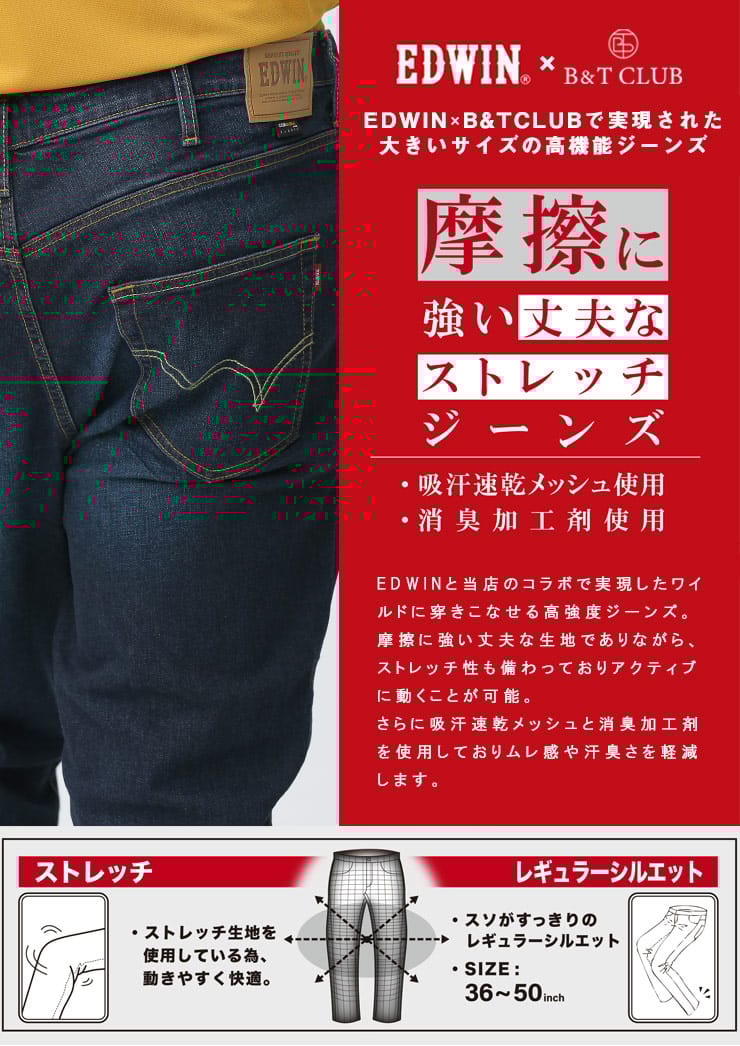 EDWINとB&T CLUBで実現したストレッチ ジップフライ ジーンズ レギュラーストレート。摩擦に強い丈夫なストレッチジーンズ。吸汗速乾メッシュを使用。消臭加工剤を使用し、気になる臭いをブロック。レギュラーストレートでどんなスタイルにもマッチするおすすめの一本。
