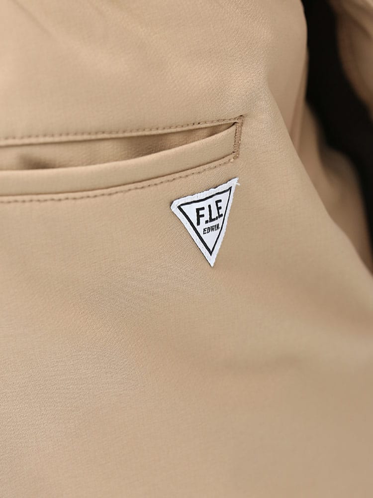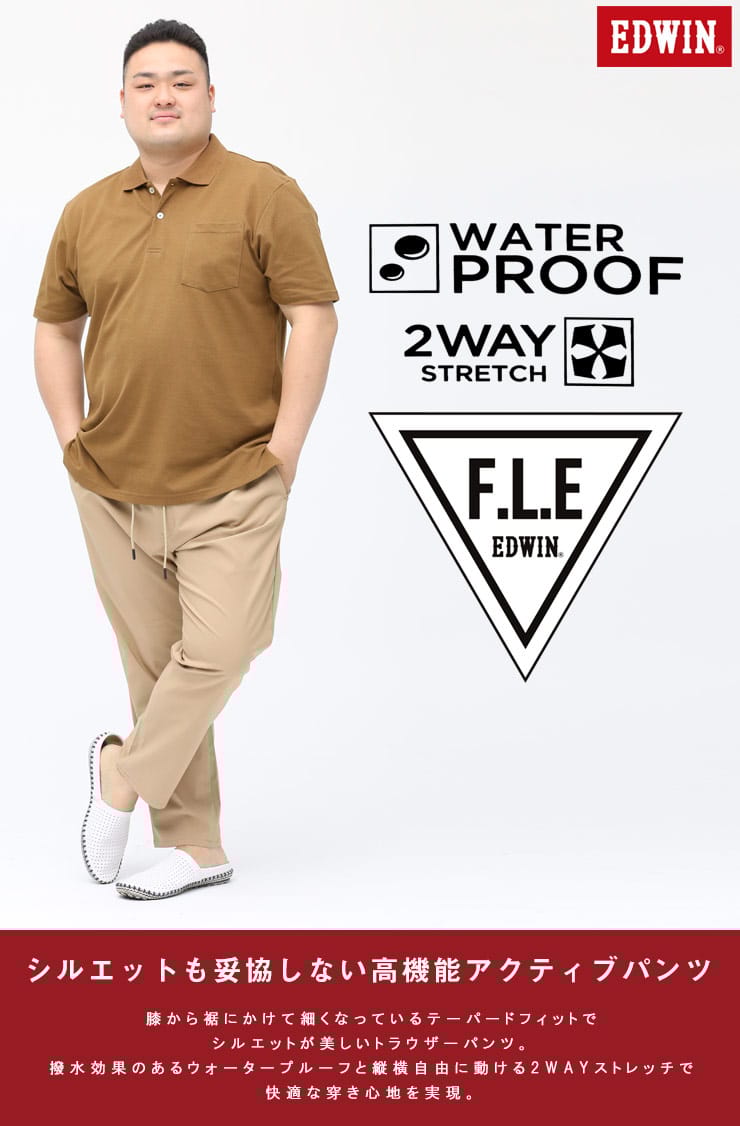 EDWINのF.L.E 撥水 2WAYストレッチ 722 トラウザーパンツ。イージーパンツ感覚の履き心地ときれいめなルックスがポイント。ドロストで微調節可能な全周ゴム入りのウエストと、ジップフライ×ベルトループを備えたノータックトラウザー。ストレスを軽減するリラックス&イージーな穿き心地が魅力になっています。シルエットはヒザからスソにかけて細くしぼったテーパードフィットですっきりとしたスタイルを演出。撥水機能搭載でで水や雨を弾きます。