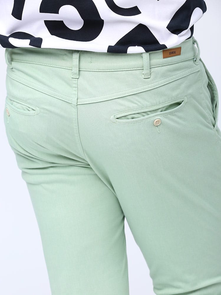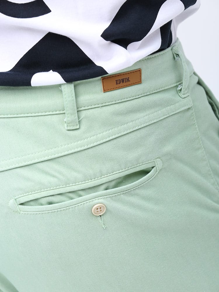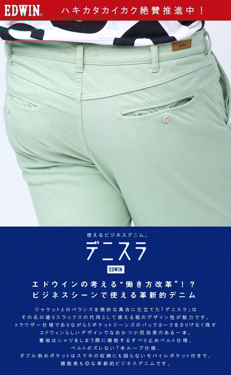 EDWINのデニスラ ストレッチ 無地 スリム デニム テーパードパンツ。ジャケットとのバランスも絶妙なビジネスシーンに映えるデニム。トラウザー仕様でありながら5ポケットジーンズのバックヨークをさりげなく残すオリジナルデザインがヒップをバランスよく小尻に演出します。シャツが出にくいように、ウエスト周りの裏地には伸縮性のあるすべり止め付き。ベルトがズレない7本ループ仕様。ダブル斜めポケットはスマホの収納にも困らないモバイルポケット付き。