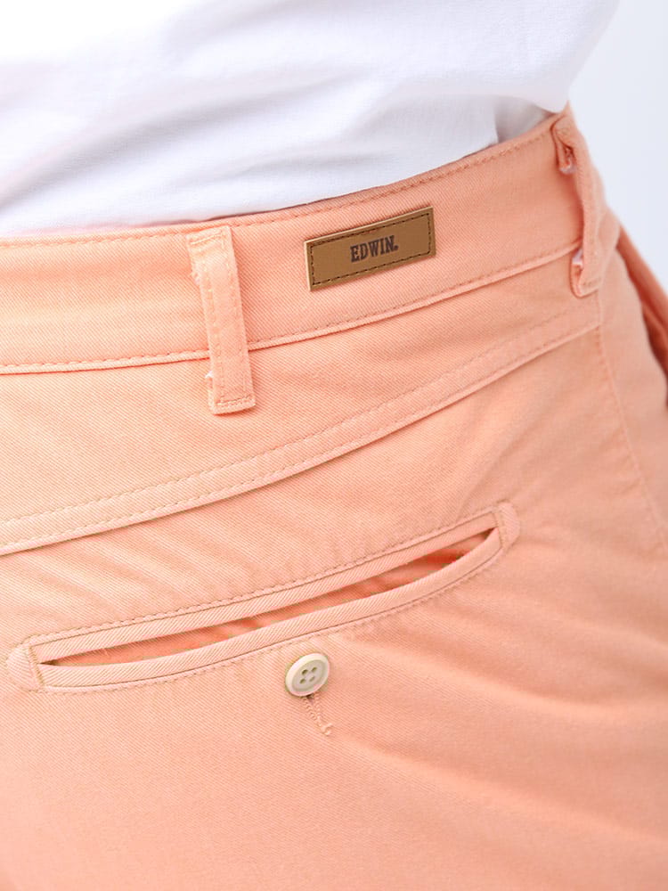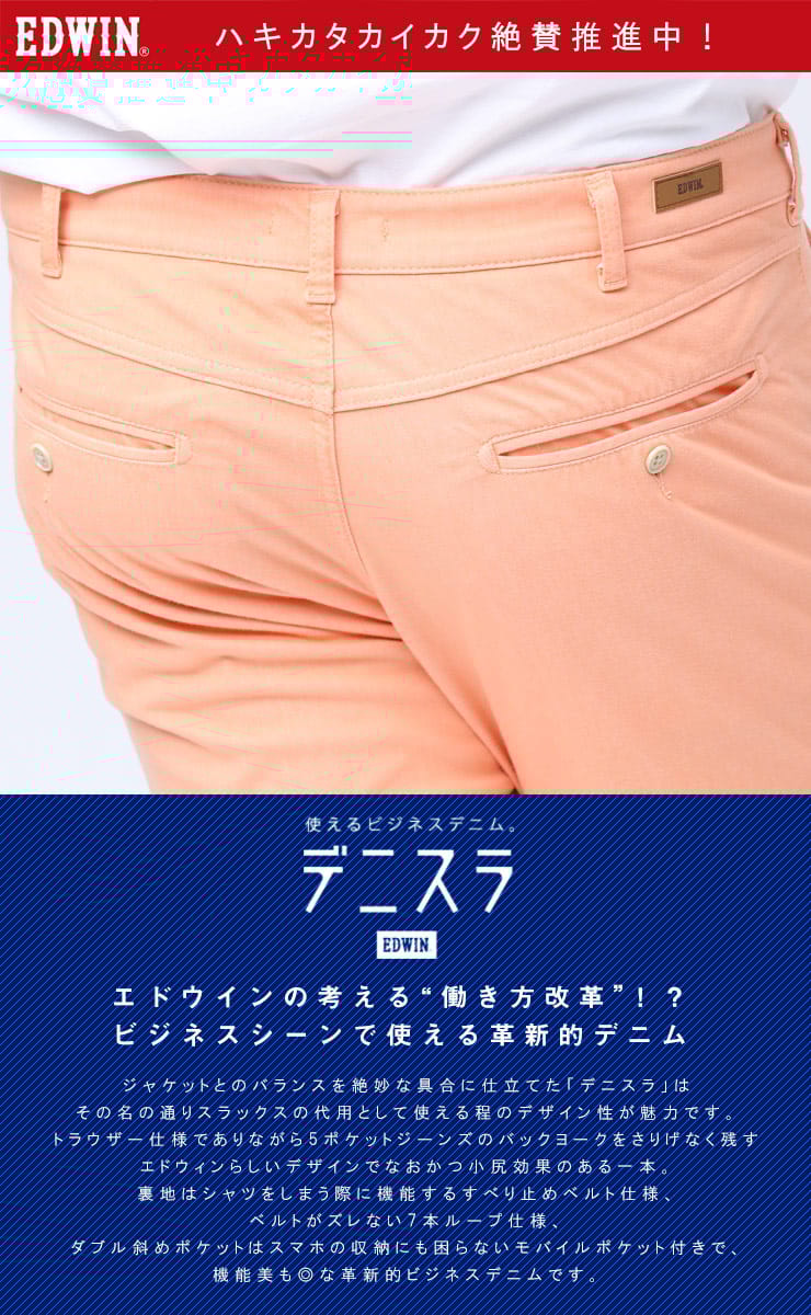EDWINのデニスラ ストレッチ 無地 スリム デニム テーパードパンツ。ジャケットとのバランスも絶妙なビジネスシーンに映えるデニム。トラウザー仕様でありながら5ポケットジーンズのバックヨークをさりげなく残すオリジナルデザインがヒップをバランスよく小尻に演出します。シャツが出にくいように、ウエスト周りの裏地には伸縮性のあるすべり止め付き。ベルトがズレない7本ループ仕様。ダブル斜めポケットはスマホの収納にも困らないモバイルポケット付き。