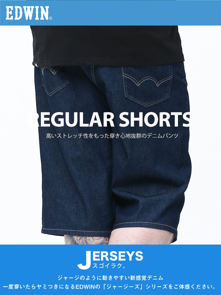 EDWINのJERSEYS ストレッチ ジップフライ ストレート デニム ショートパンツ。JERSEYS史上最高のストレッチ性を誇る日本のカイハラ社製MOTION DENIMを採用。抜群のストレッチ性をもったデニム『MOTION DENIM』の組織にCOOL素材として麻・テンセルを糸に織り込むことで、軽量・ドレ―プ性を加えた涼しい夏用パンツ。さらに、織組織の隙間に通気ポイントを作る特殊な織方法により、ムレ感無く快適な穿き心地を実現。
