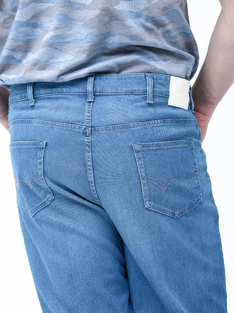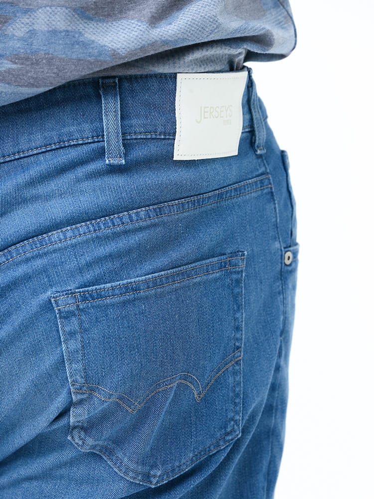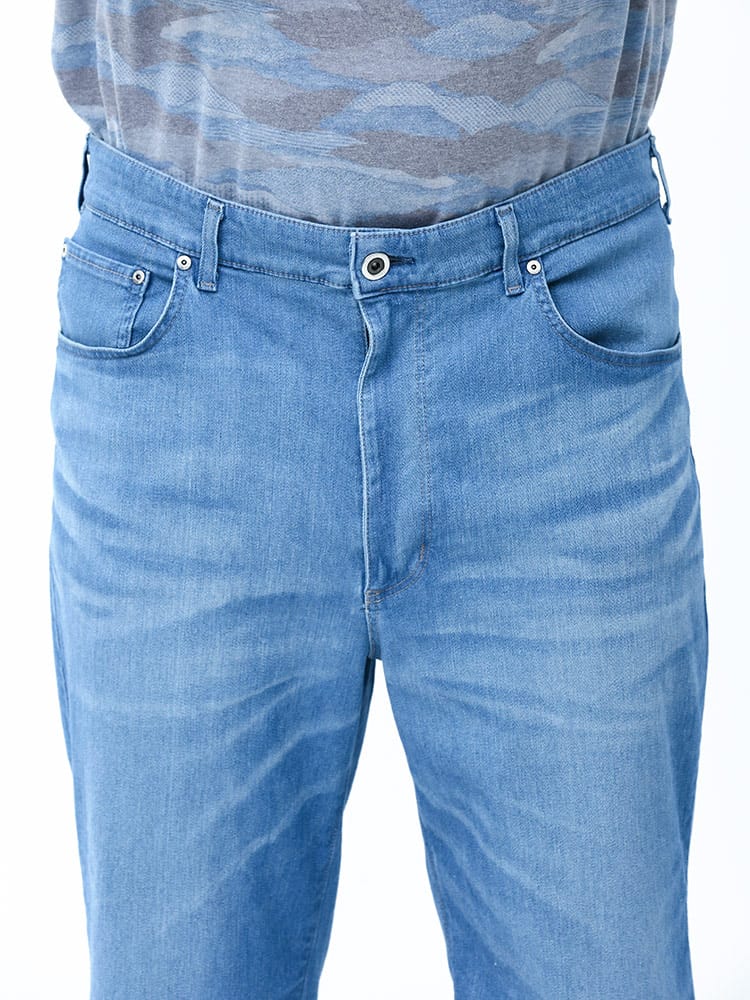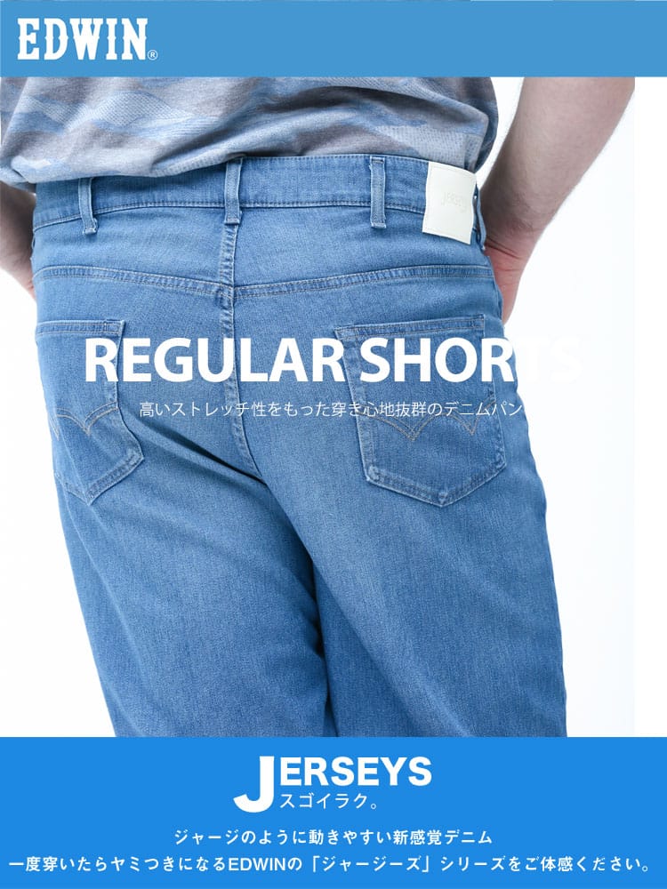 EDWINのJERSEYS ストレッチ ジップフライ ストレート デニム ショートパンツ。JERSEYS史上最高のストレッチ性を誇る日本のカイハラ社製MOTION DENIMを採用。抜群のストレッチ性をもったデニム『MOTION DENIM』の組織にCOOL素材として麻・テンセルを糸に織り込むことで、軽量・ドレ―プ性を加えた涼しい夏用パンツ。さらに、織組織の隙間に通気ポイントを作る特殊な織方法により、ムレ感無く快適な穿き心地を実現。