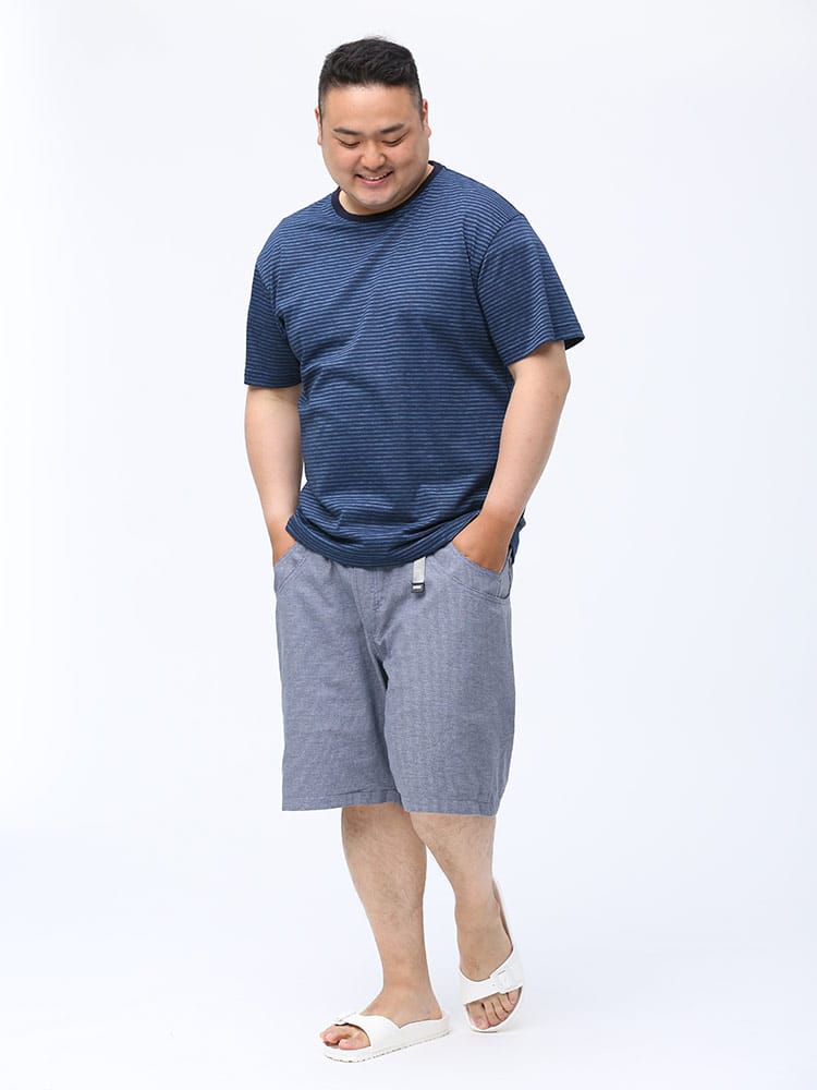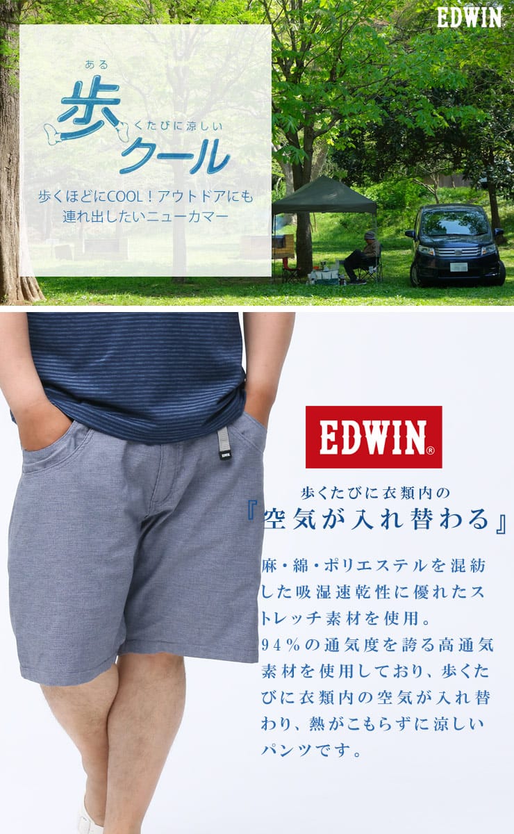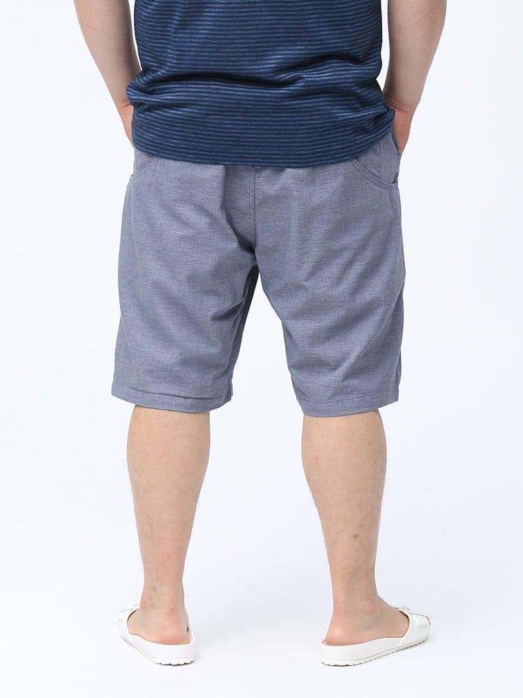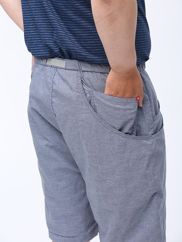 歩くたびに涼しい「歩クール」素材を使用したイージーショートパンツ。片手でフィット感の調節が可能なウェビングベルトを備えるイージーショートパンツ。左右の前ポケットと腰ポケットがそれぞれつながったワークパンツ風の大型ポケット。休日の手回り品ほどの量であれば、バックを持つまでもなく、このショーツのポケットに収納でき、アウトドアやビーチにもおすすめです。風通しの良いメッシュ構造と三者混紡(麻・綿・ポリエステル)の素材で、一日中快適に過ごせます。