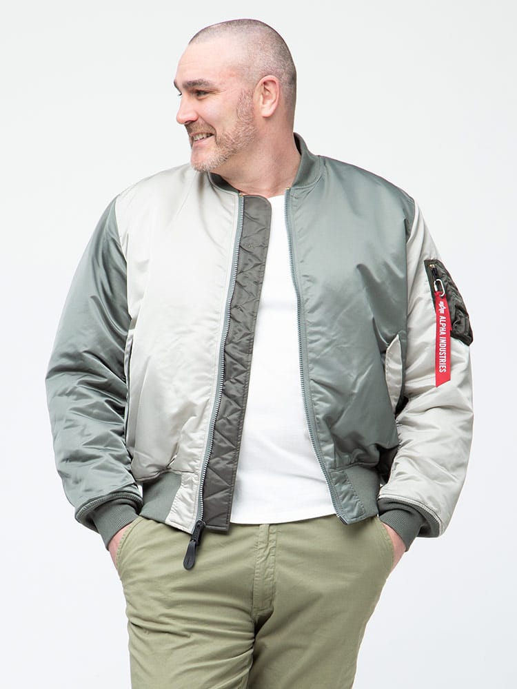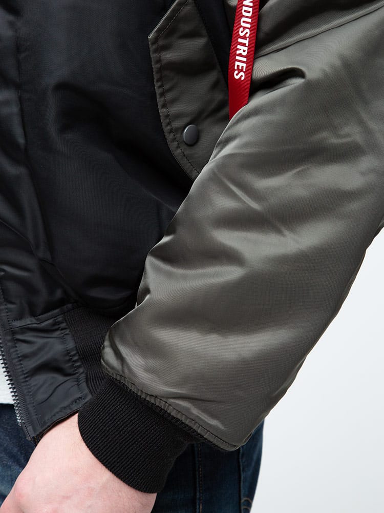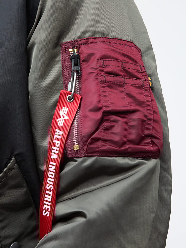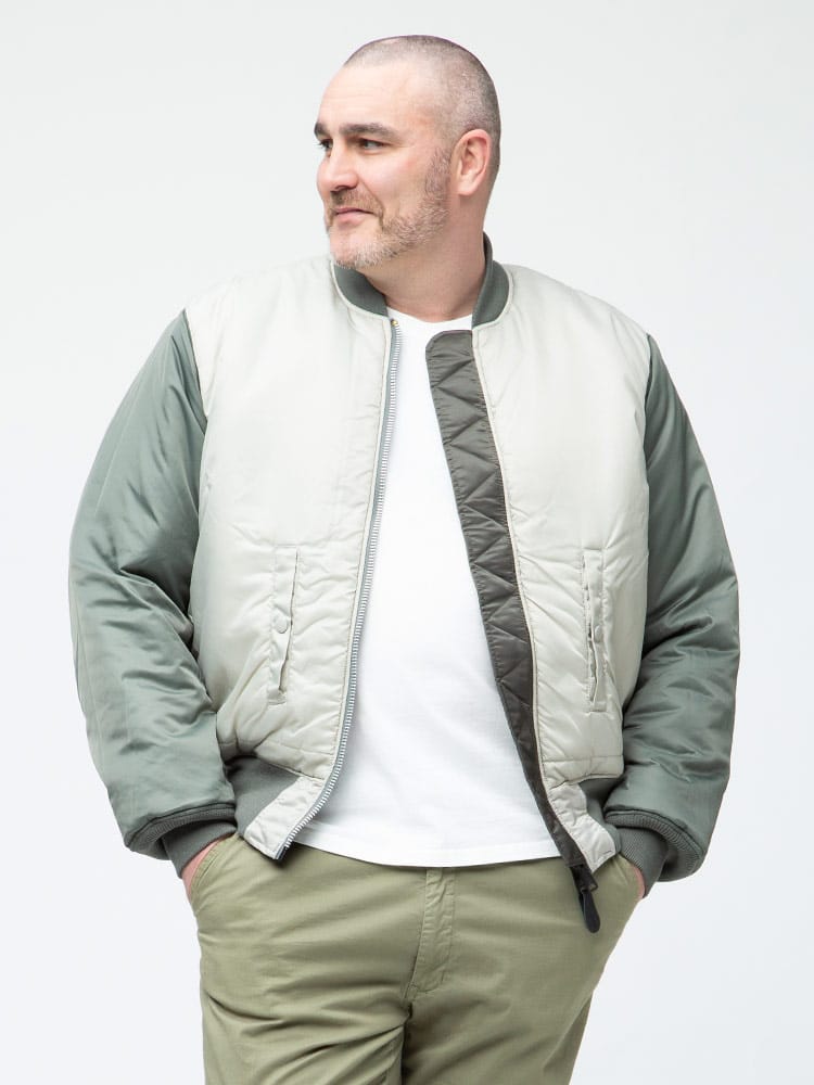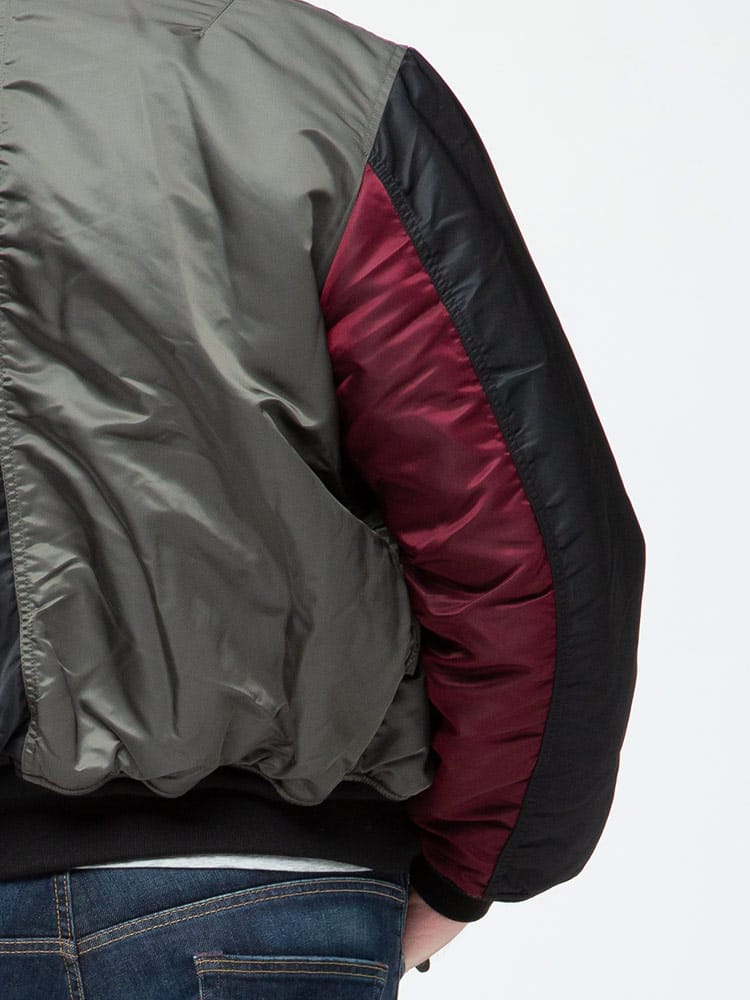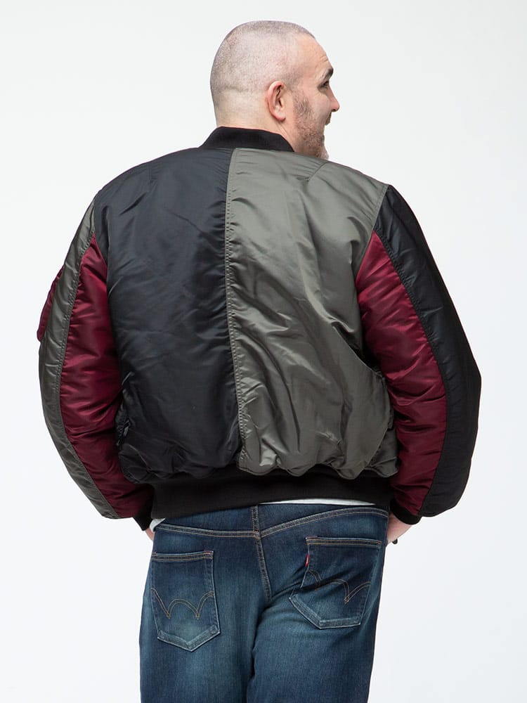 3色のFLIGHT NYLONで10箇所切り替えた、クレイジーパターンのMA-1です。リバーシブル仕様になっていて、裏側は身頃と袖で切り替えになっています。2つの顔があり、どちらを表にするかによって大きく印象が変わるジャケット。