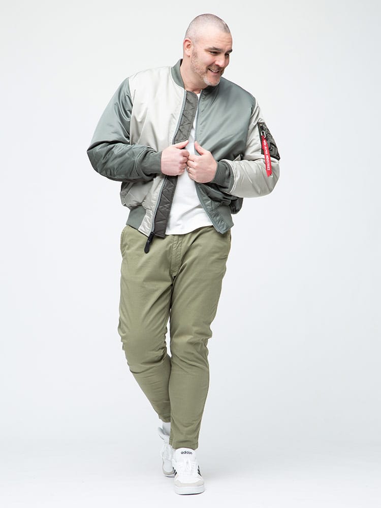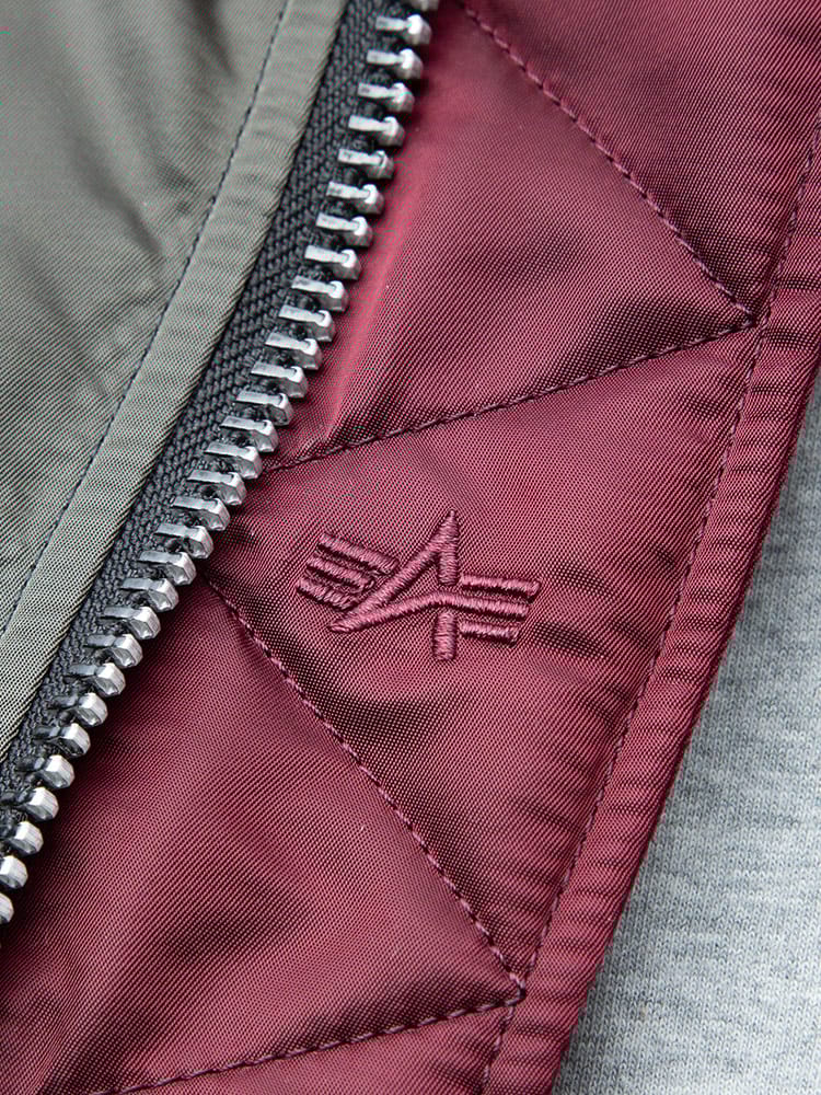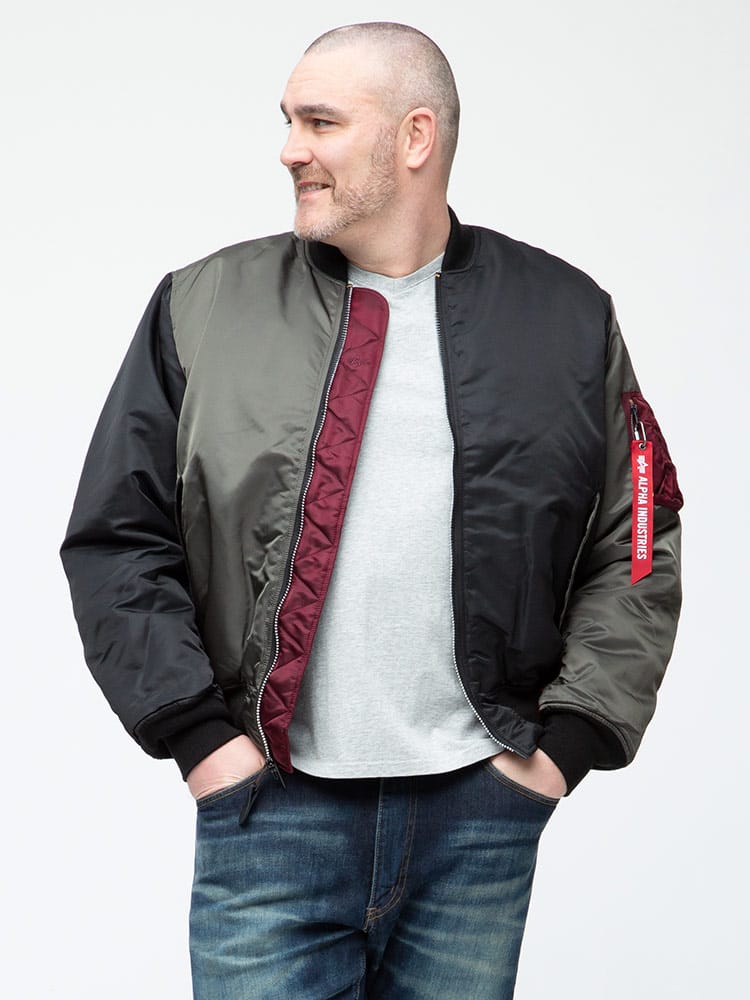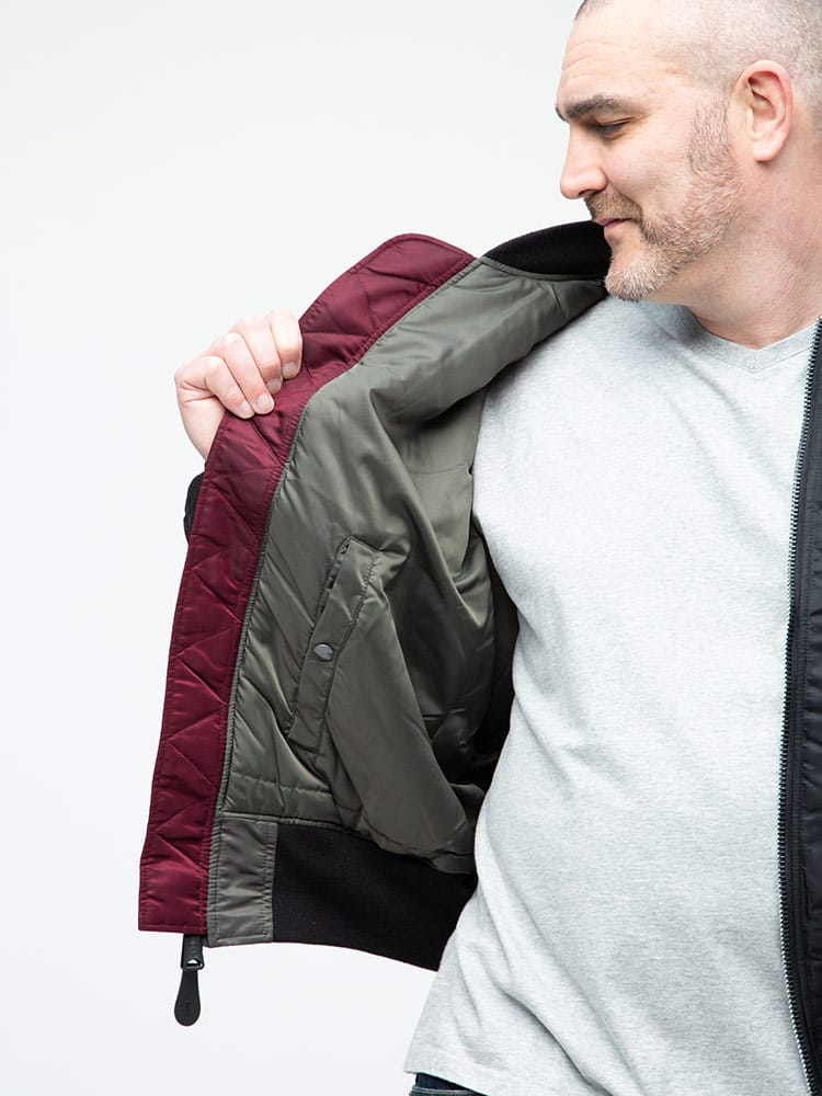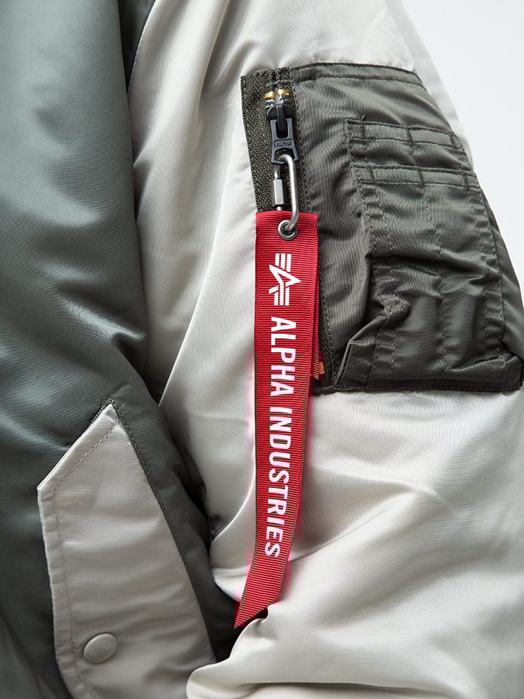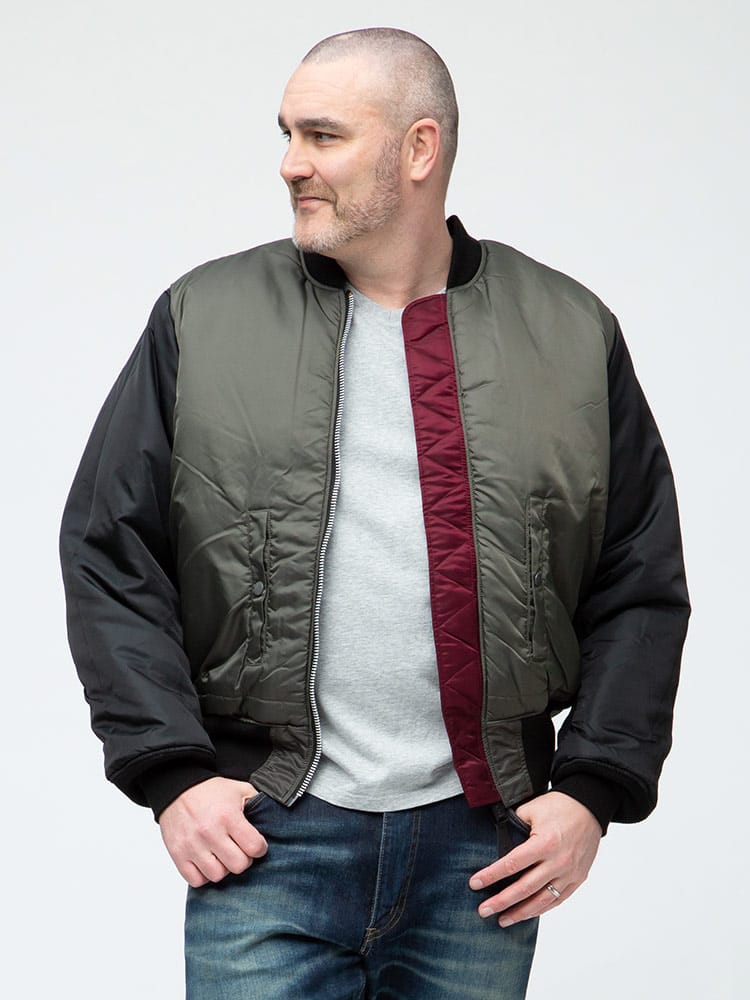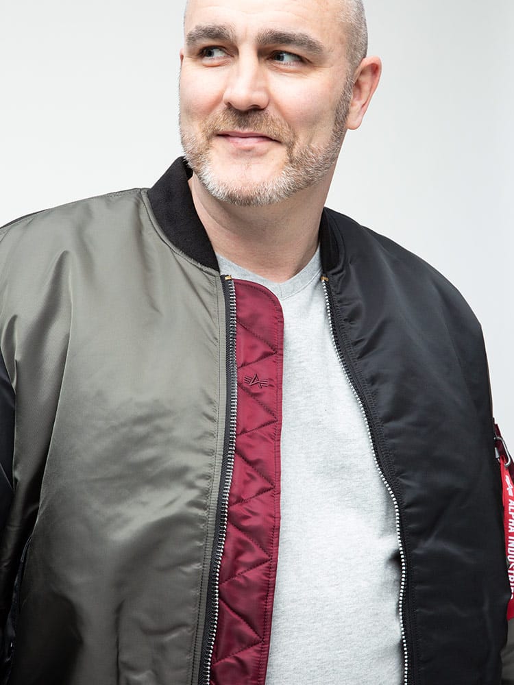 3色のFLIGHT NYLONで10箇所切り替えた、クレイジーパターンのMA-1です。リバーシブル仕様になっていて、裏側は身頃と袖で切り替えになっています。2つの顔があり、どちらを表にするかによって大きく印象が変わるジャケット。