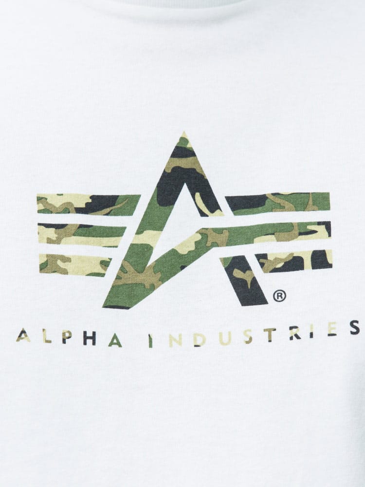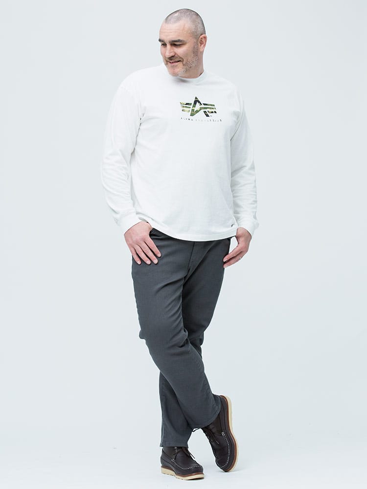 大きいサイズ メンズ ALPHA INDUSTRIES INC (アルファインダストリーズ) 迷彩ロゴ クルーネック 長袖 Tシャツ ロンT A-MARK WHITE