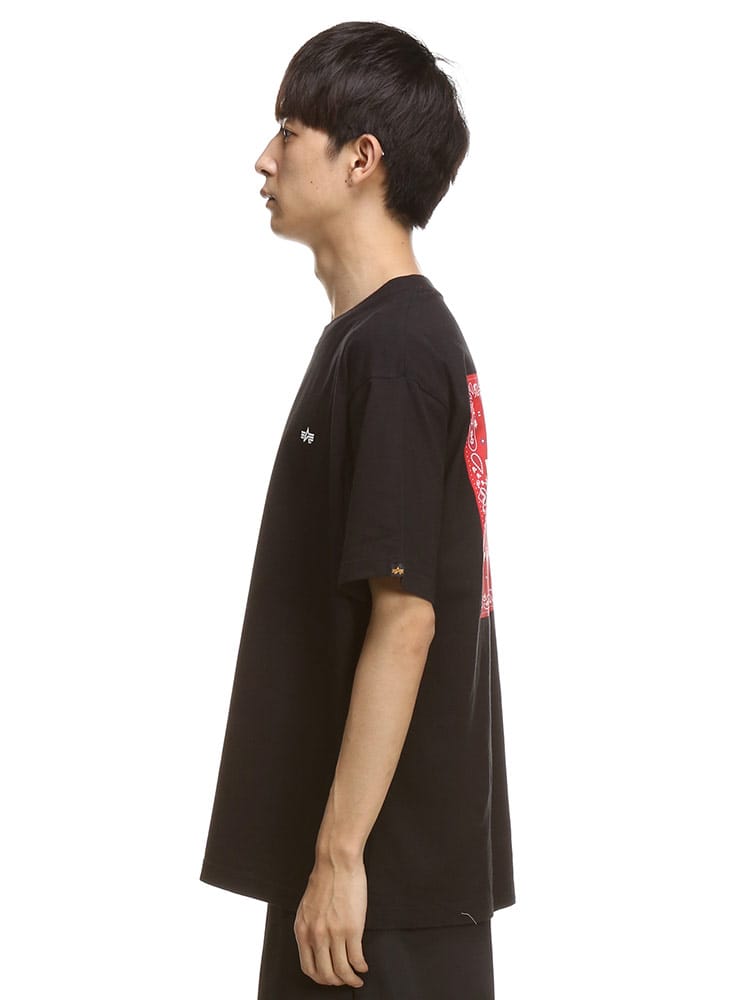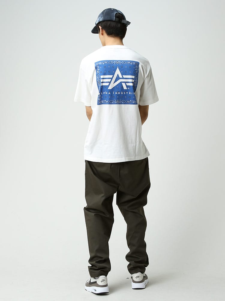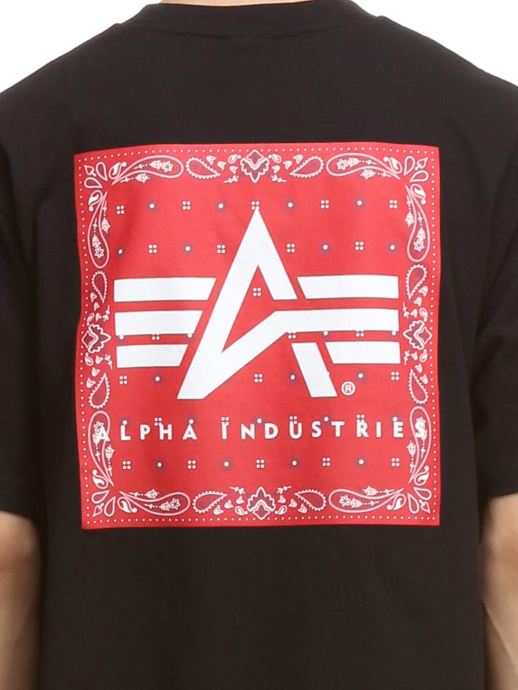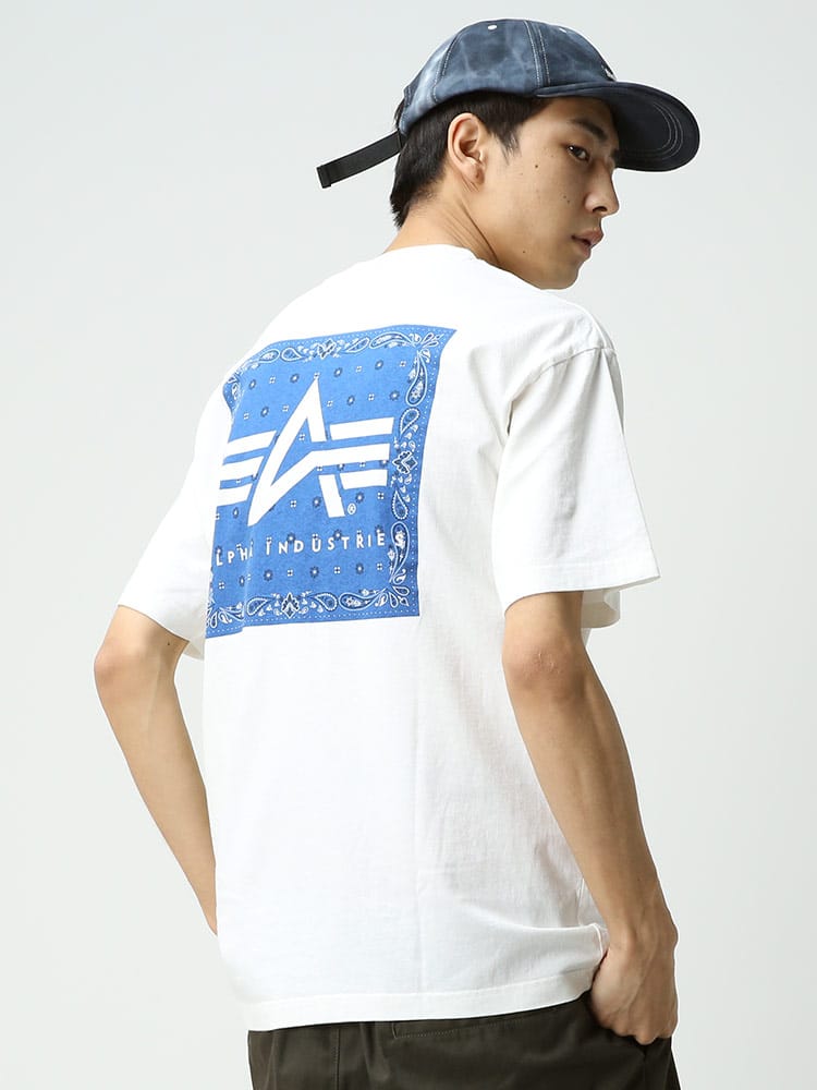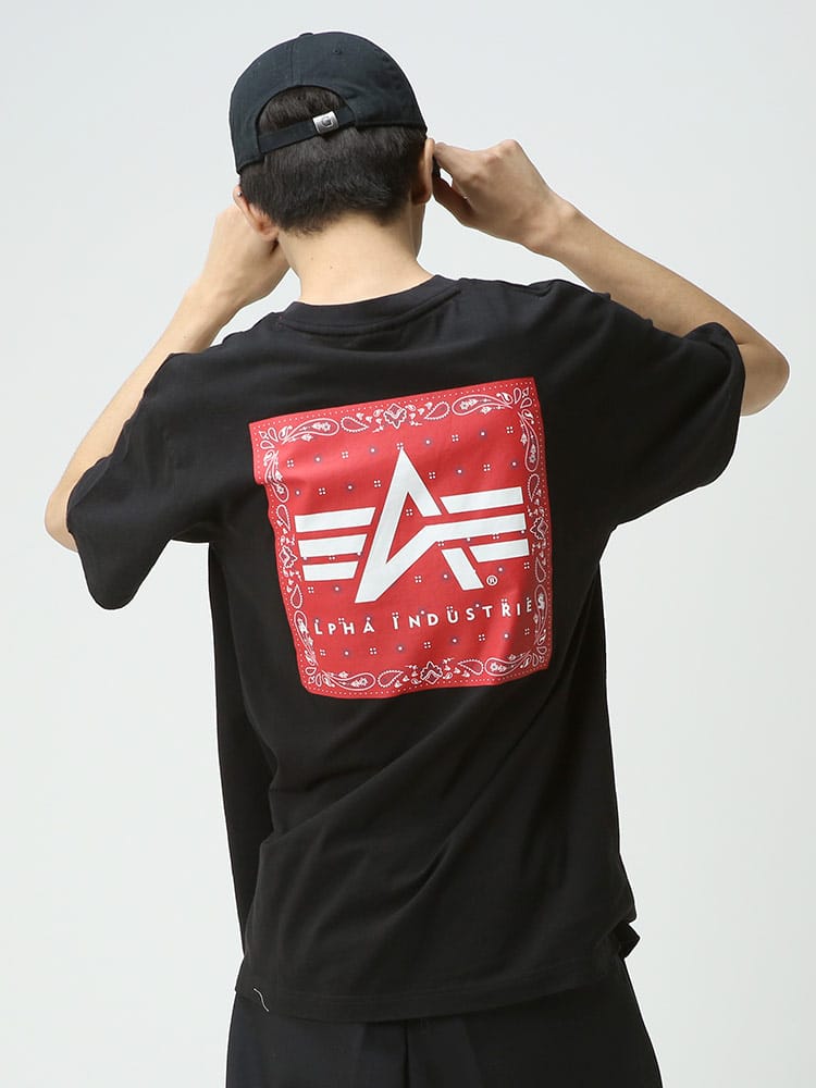 アメカジやアーミースタイルにマッチするALPHA INDUSTRIES INCのバックプリント BOXロゴ クルーネック 半袖 Tシャツです。バックに大きくバンダナ柄のBOXロゴプリント。フロント左胸に小さくロゴプリント。左袖にタグ付き。首元はベーシックなクルーネック。肌触りの良いコットン生地を使用し、着心地抜群のアイテムです。