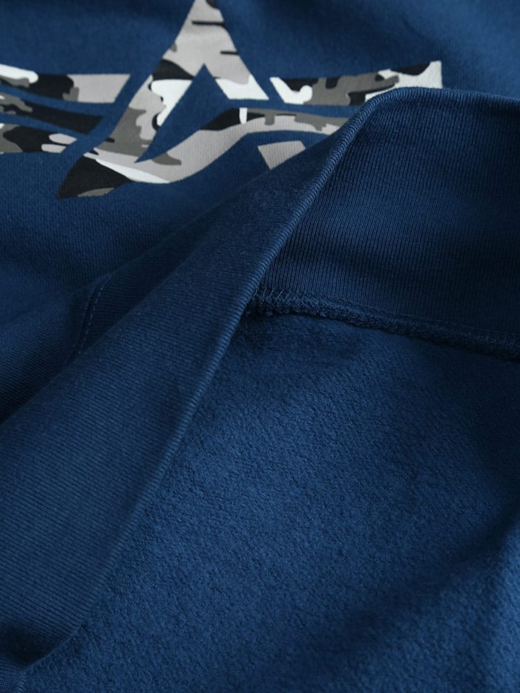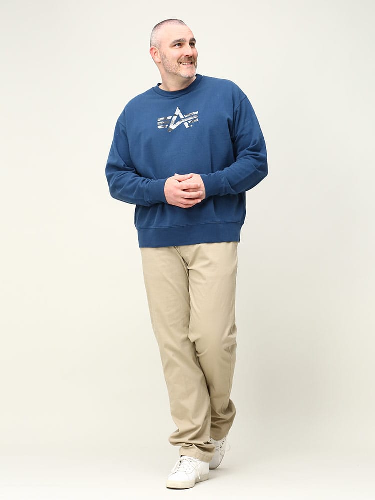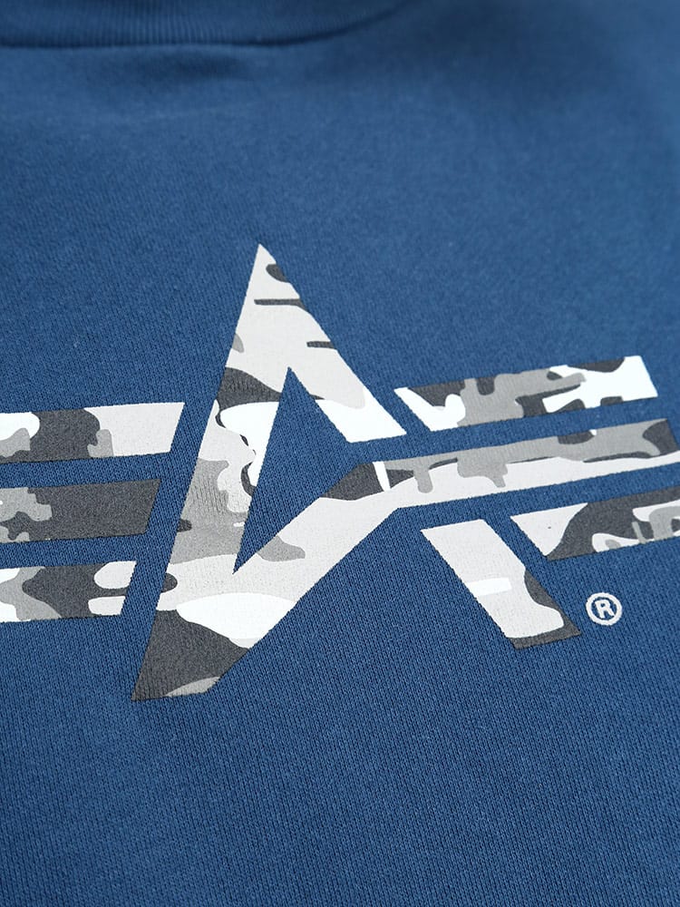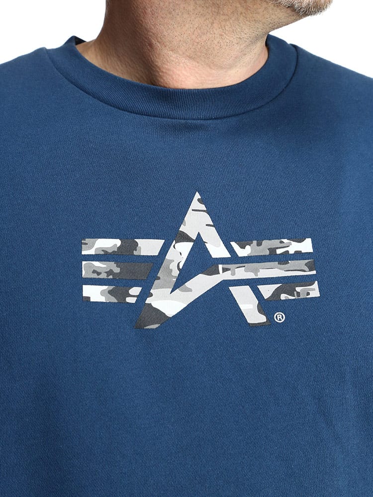 アルファインダストリーズの裏起毛 迷彩マーク クルーネック スウェット トレーナーです。裏起毛であたたかなスウェットトレーナーのフロントには、象徴的なアルファインダストリーズのロゴマークに迷彩柄が乗ってプリントされています。