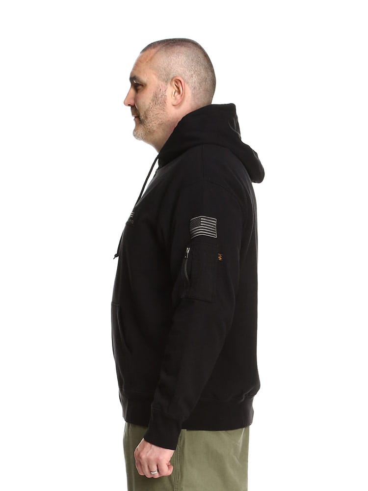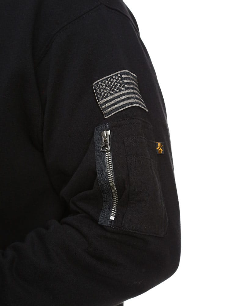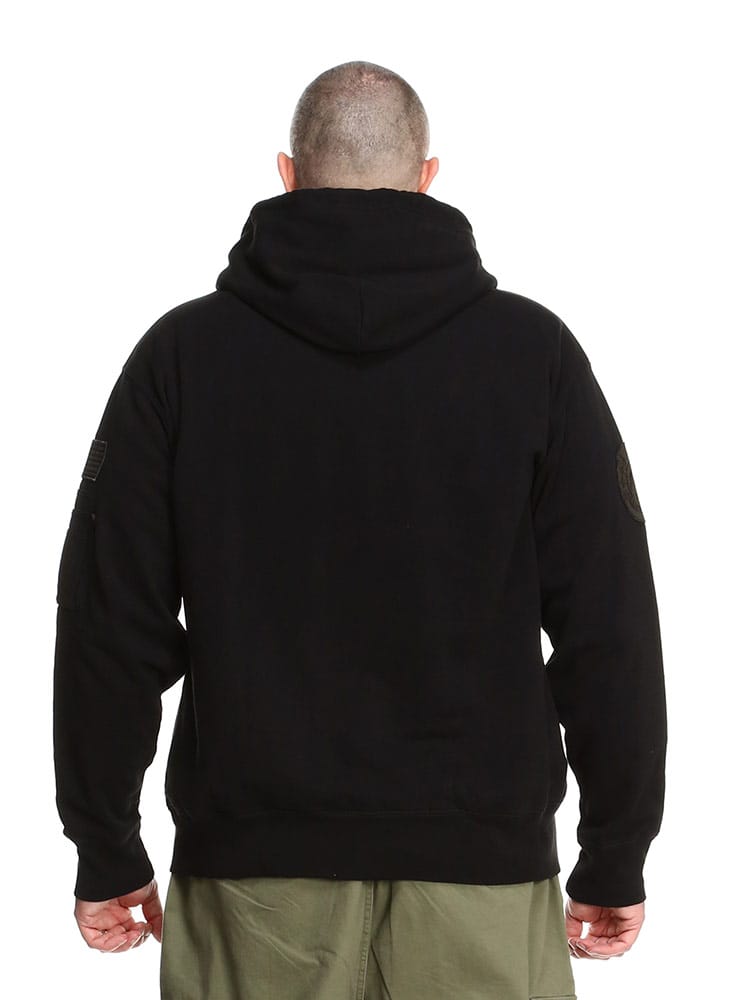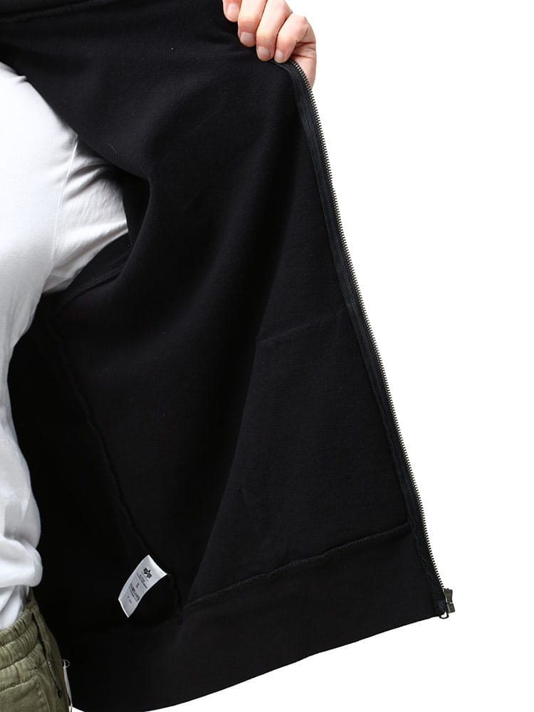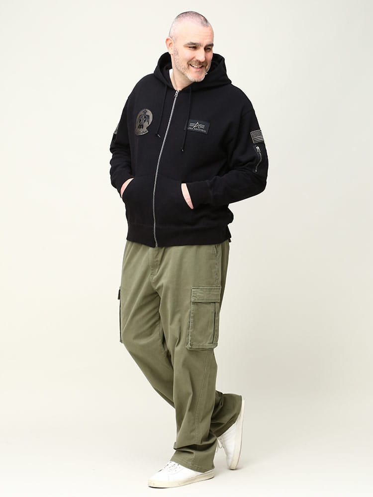 アルファインダストリーズの裏起毛 ワッペン フルジップ パーカーです。裏起毛であたたかなスウェットフルジップパーカーをベースに、胸などのワッペンや腕の装飾がMA-1などフライトジャケットを思わせるデザインに仕上がった、アルファらしい一着です。