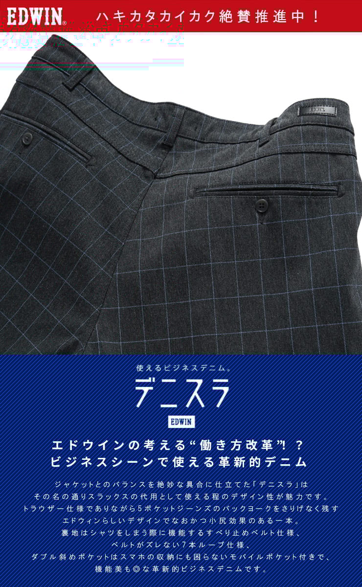 スマートさを演出するデニスラ。ジャケットとのバランスも絶妙なビジネスシーンに映えるデニム。シャツなどへ色移りせず、色あせしにくいので、キレイめのコーディネイトが楽しめます。また適度なストレッチ性と張りのある生地感が上品なスタイルを演出します。トラウザー仕様でありながら5ポケットジーンズのバックヨークをさりげなく残すオリジナルデザインがヒップをバランスよく小尻に演出します。シャツが出にくいように、ウエスト周りの裏地には伸縮性のあるすべり止め付き。穿きやすくシワの出ないヒップラインで、裾にかけてスッキリはいていただけるスリムテーパード。