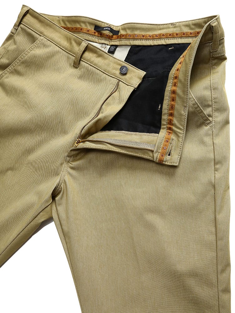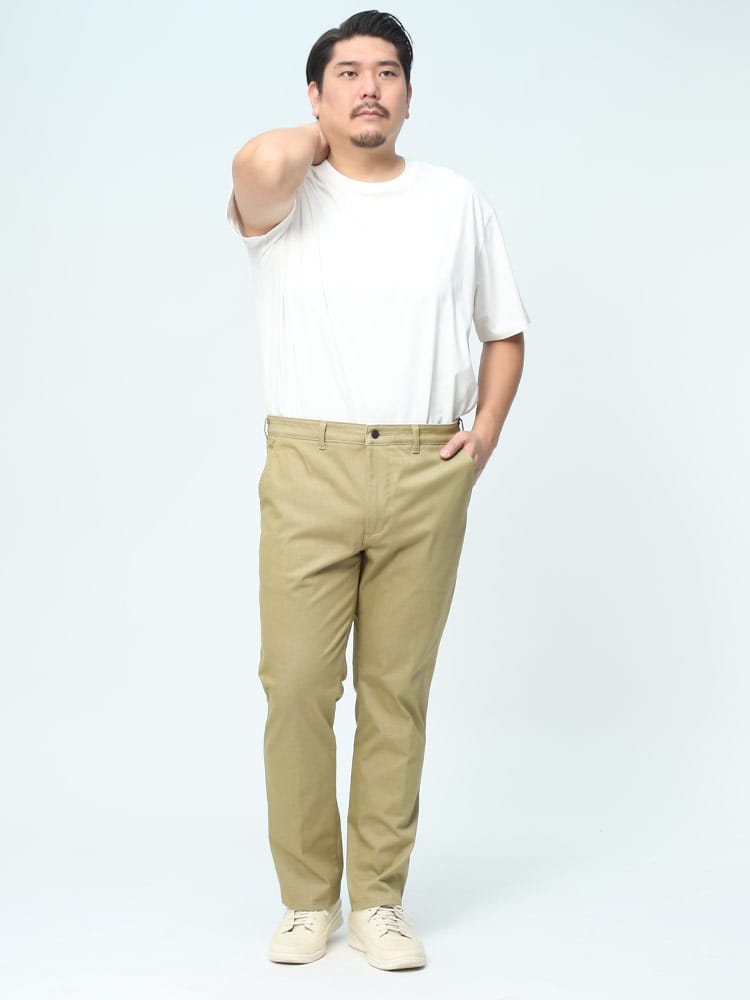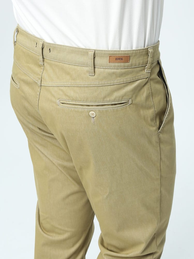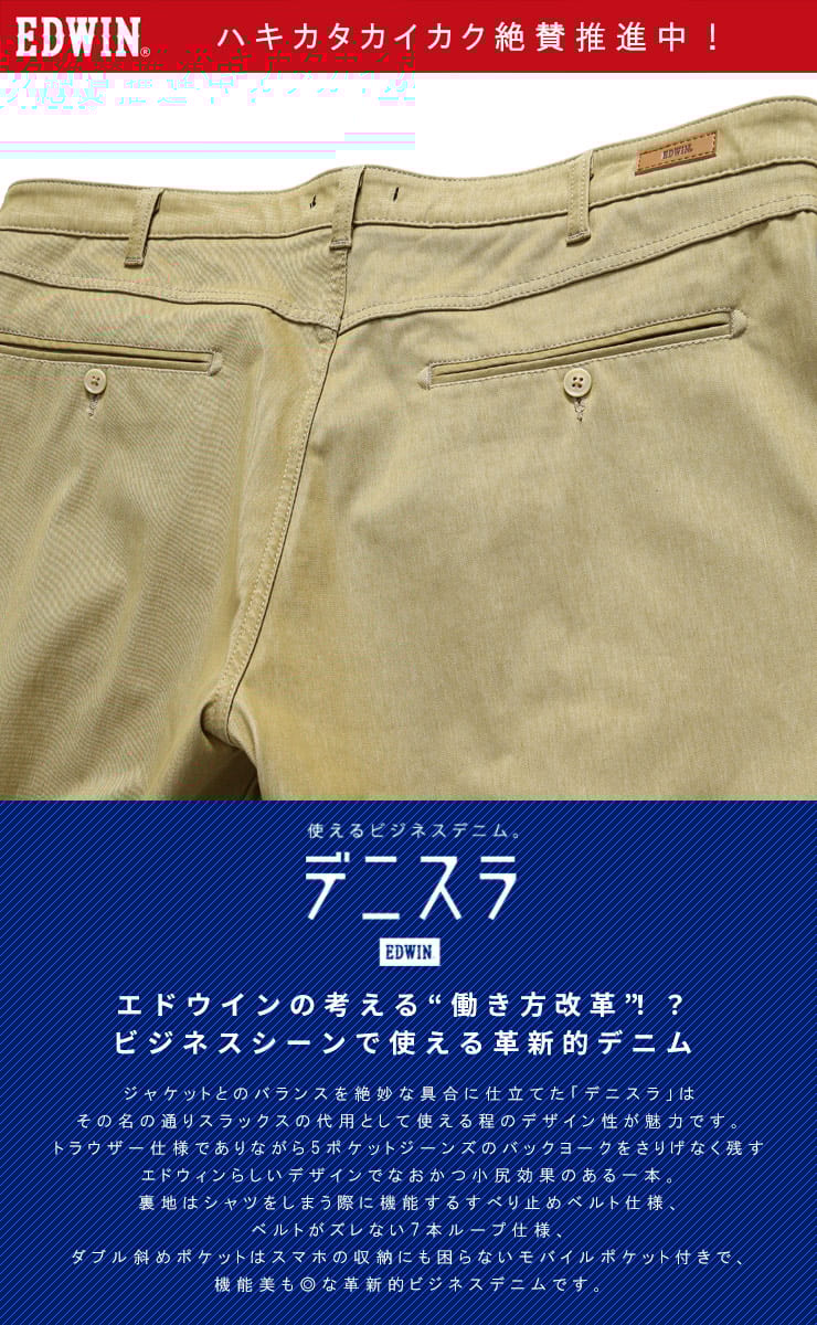 スマートさを演出するデニスラ。ジャケットとのバランスも絶妙なビジネスシーンに映えるデニム。シャツなどへ色移りせず、色あせしにくいので、キレイめのコーディネイトが楽しめます。また適度なストレッチ性と張りのある生地感が上品なスタイルを演出します。トラウザー仕様でありながら5ポケットジーンズのバックヨークをさりげなく残すオリジナルデザインがヒップをバランスよく小尻に演出します。シャツが出にくいように、ウエスト周りの裏地には伸縮性のあるすべり止め付き。穿きやすくシワの出ないヒップラインで、裾にかけてスッキリはいていただけるスリムテーパード。