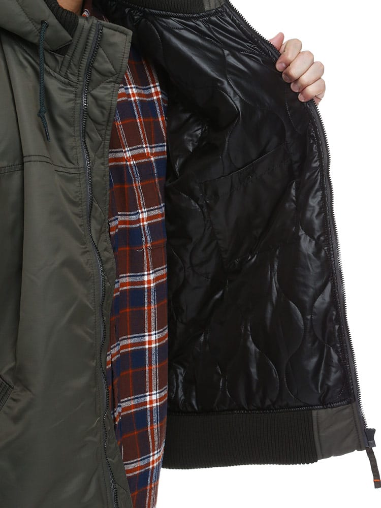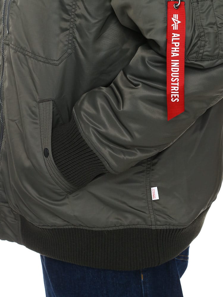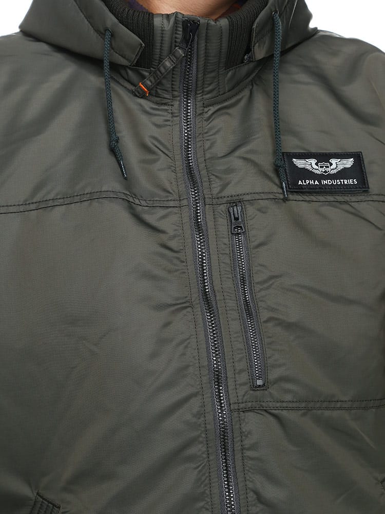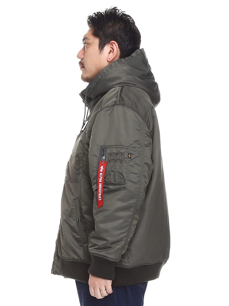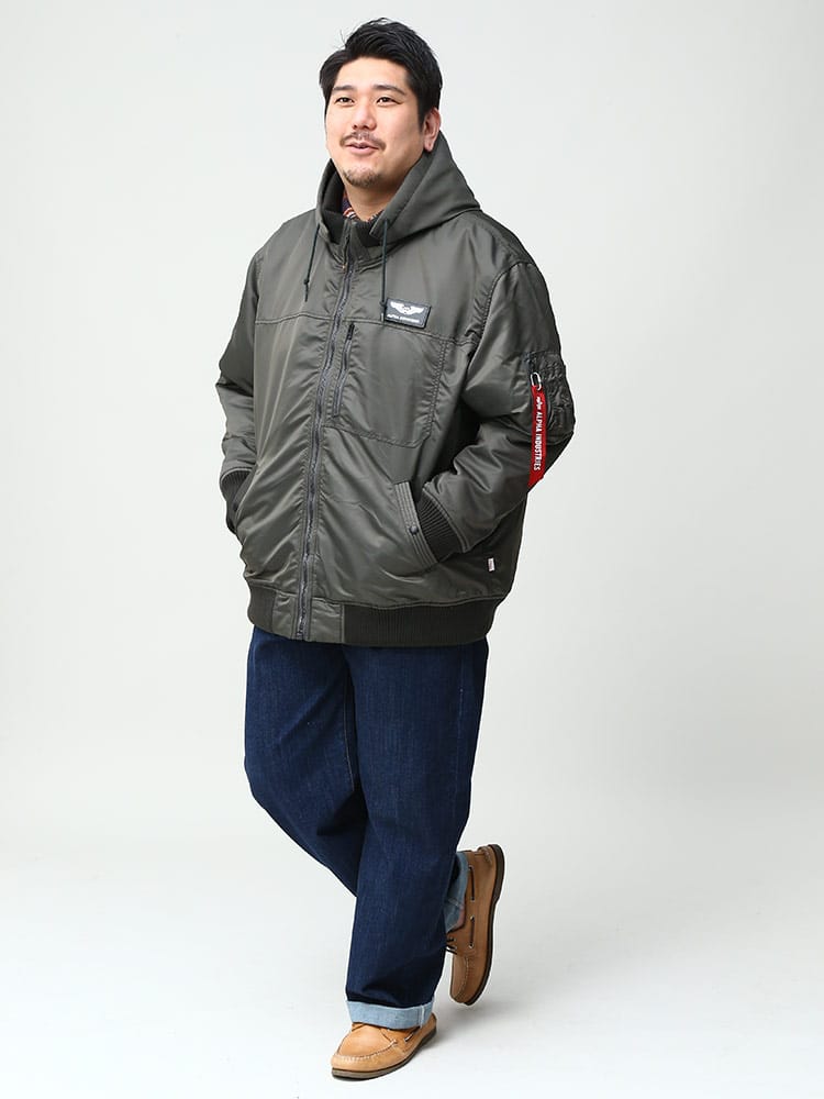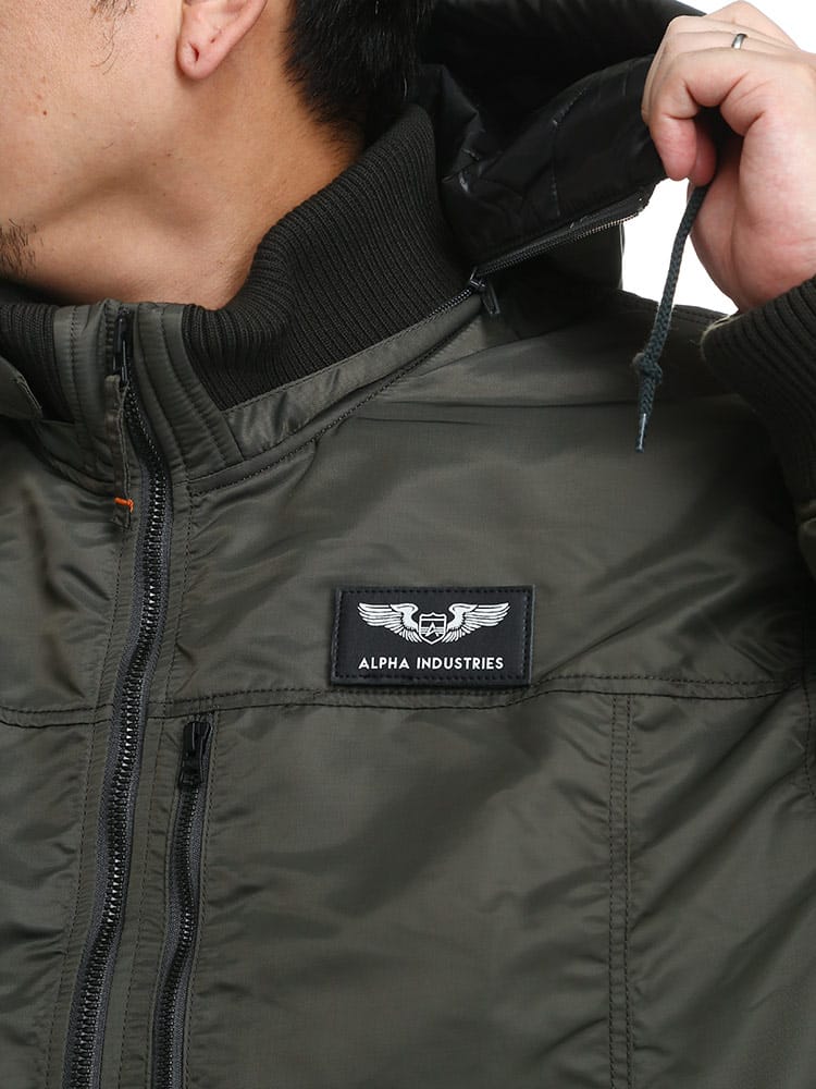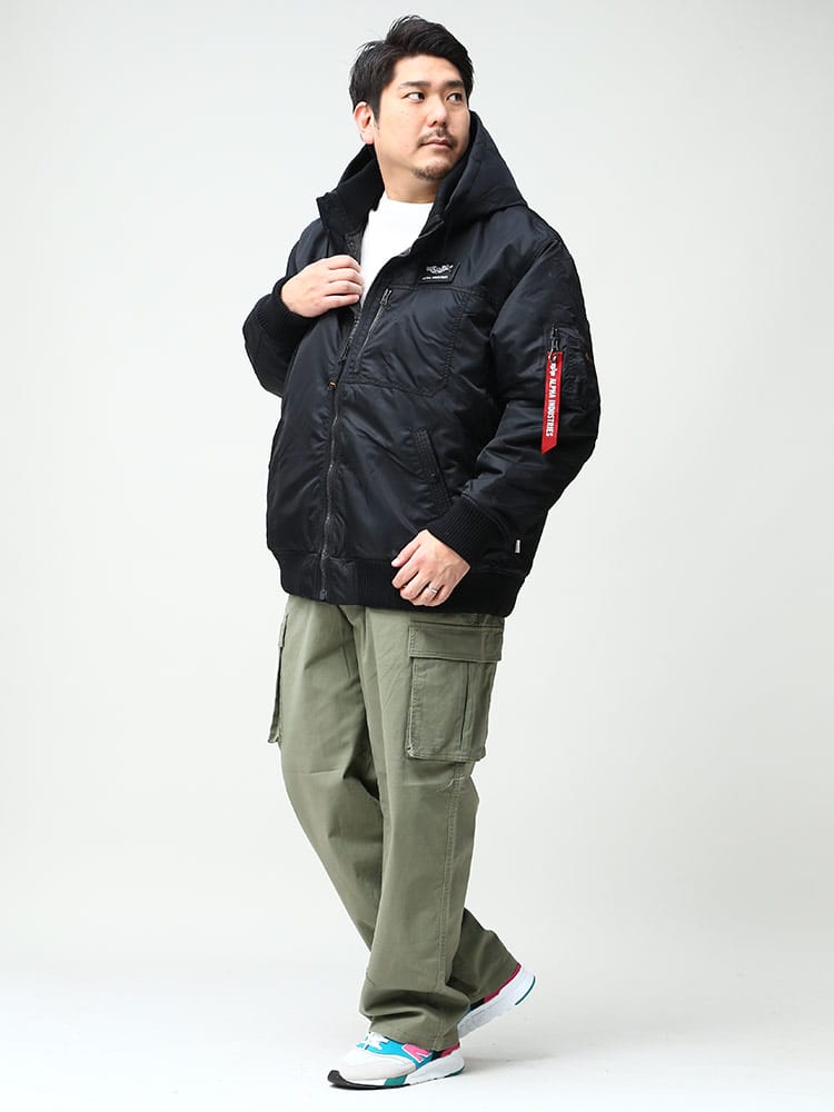 Alphaらしさを詰め込んだフーデッドリブジャケットです。軽量・保温性の高機能素材「Thermolite」を使用。左胸に取り外しが出来るワッペンが付き、シンプルで何にでも合わせやすいため、ヘビロテすること間違いなし。襟元は立ち襟になっていて、首回りまで暖かい仕様になっています。フードは取り外し可能なので2WAYの着こなしが楽しめる仕様。カーゴパンツやデニムパンツにはもちろんキレイめパンツに合わせて大人カジュアルコーデにおすすめなアウターです。
