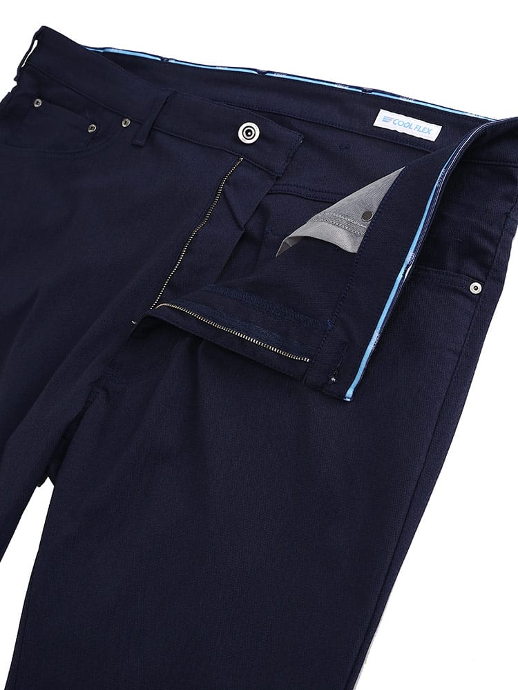 JERSEYS史上最高のストレッチ性を誇る日本のカイハラ社製 MOTION DENIMを採用。抜群のストレッチ性をもったデニム「MOTION DENIM」の組織にCOOL素材として麻・テンセル糸を織り込むことで、軽量・ドレープ性を加えた涼しい夏用パンツ。さらに、織組織の隙間に通気ポイントを作る特殊な織方法により、ムレ感無く快適な穿き心地を実現。日本製。