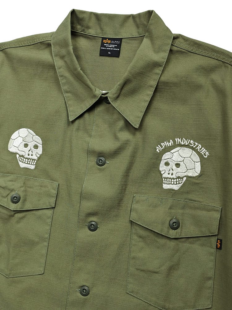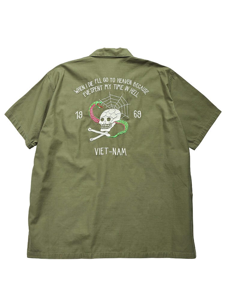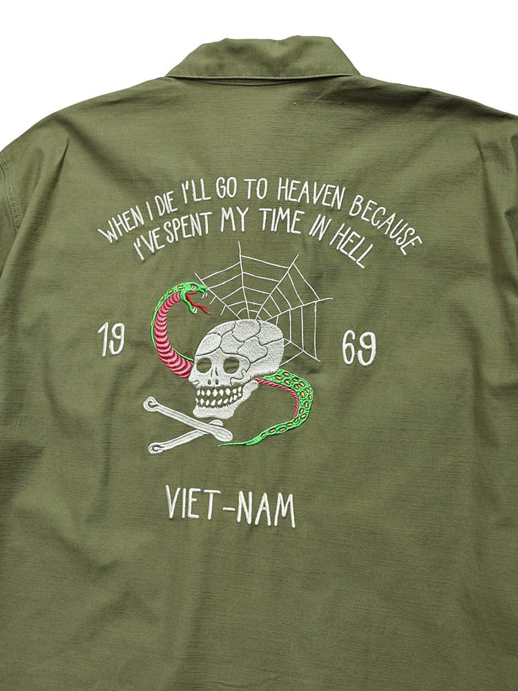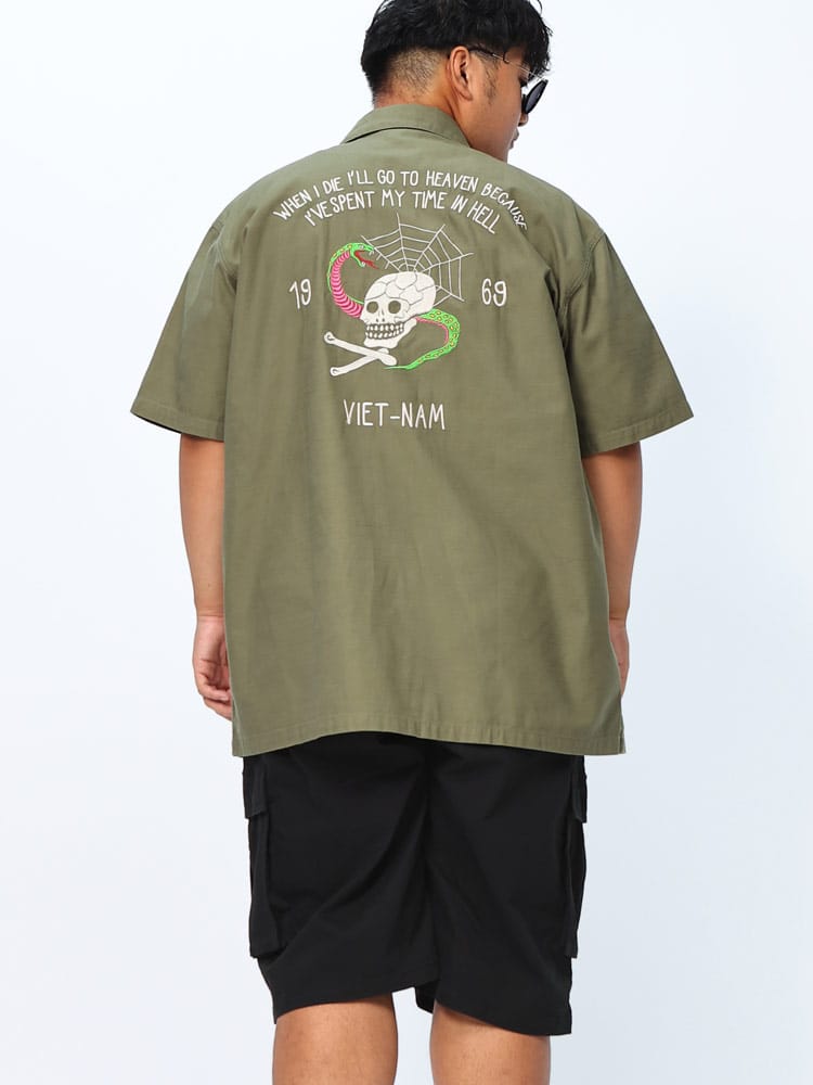 背中に施された刺繍デザインが存在感抜群のスーベニアシャツ。U.S ARMY ユーティリティーシャツを基にサイズ感をアレンジ。スーベニアジャケットなどで使用されるスカルx蜘蛛x蛇の刺繍を施した雰囲気抜群のアイテムです。素材には、コットン100%の肉厚で着込む程にあたりや風合いのでるバックサテンを使用しています。オーバーサイズなので、Tシャツをインナーにしジャケットのような着こなしも可能です。カジュアルダウンしすぎない刺繍デザインなので、渋い大人カジュアルコーデにぴったりです。
