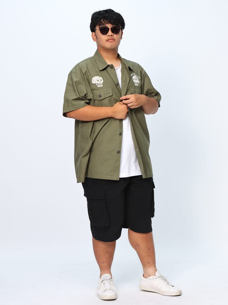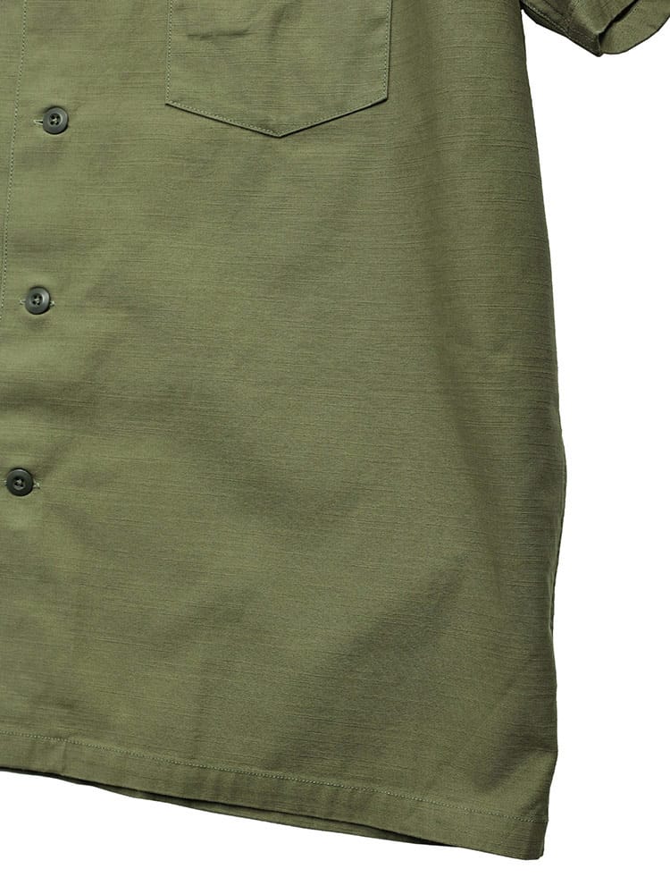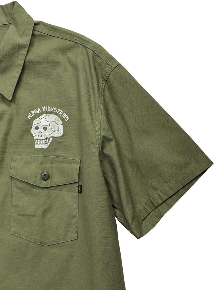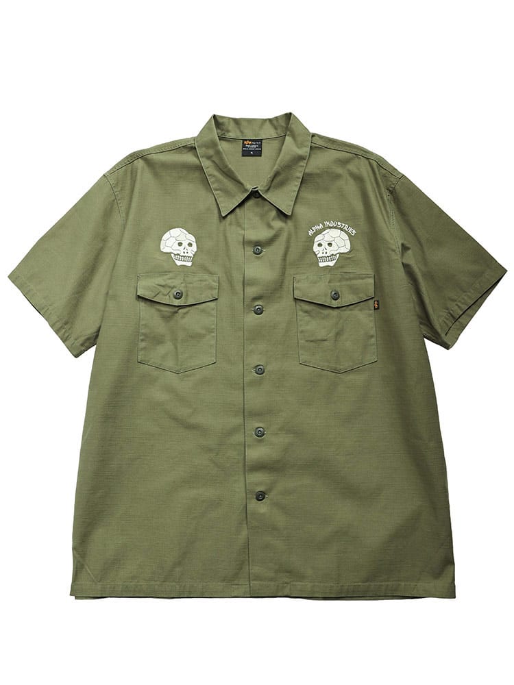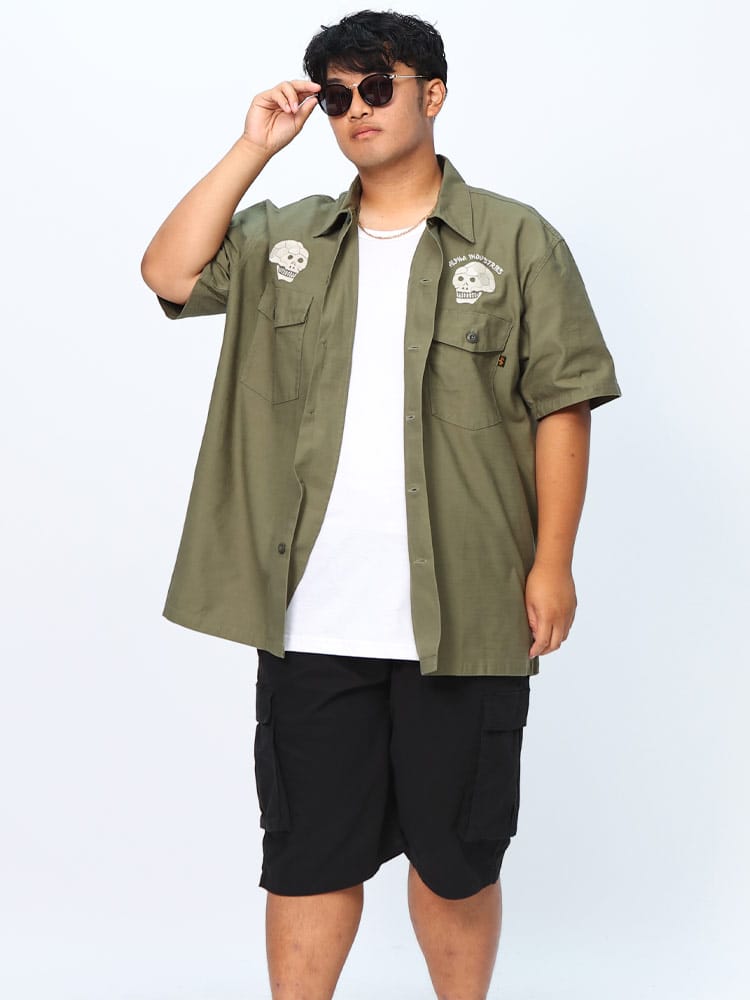 背中に施された刺繍デザインが存在感抜群のスーベニアシャツ。U.S ARMY ユーティリティーシャツを基にサイズ感をアレンジ。スーベニアジャケットなどで使用されるスカルx蜘蛛x蛇の刺繍を施した雰囲気抜群のアイテムです。素材には、コットン100%の肉厚で着込む程にあたりや風合いのでるバックサテンを使用しています。オーバーサイズなので、Tシャツをインナーにしジャケットのような着こなしも可能です。カジュアルダウンしすぎない刺繍デザインなので、渋い大人カジュアルコーデにぴったりです。