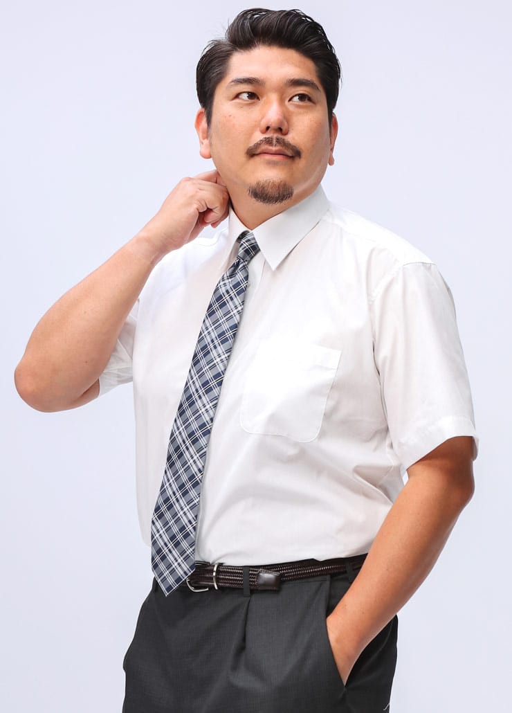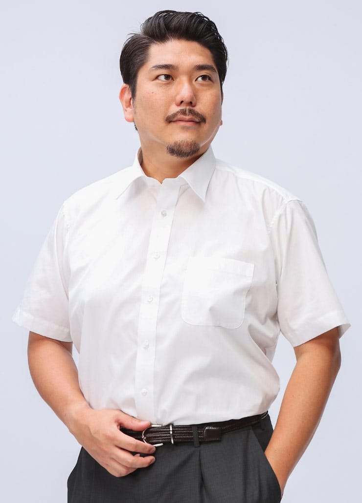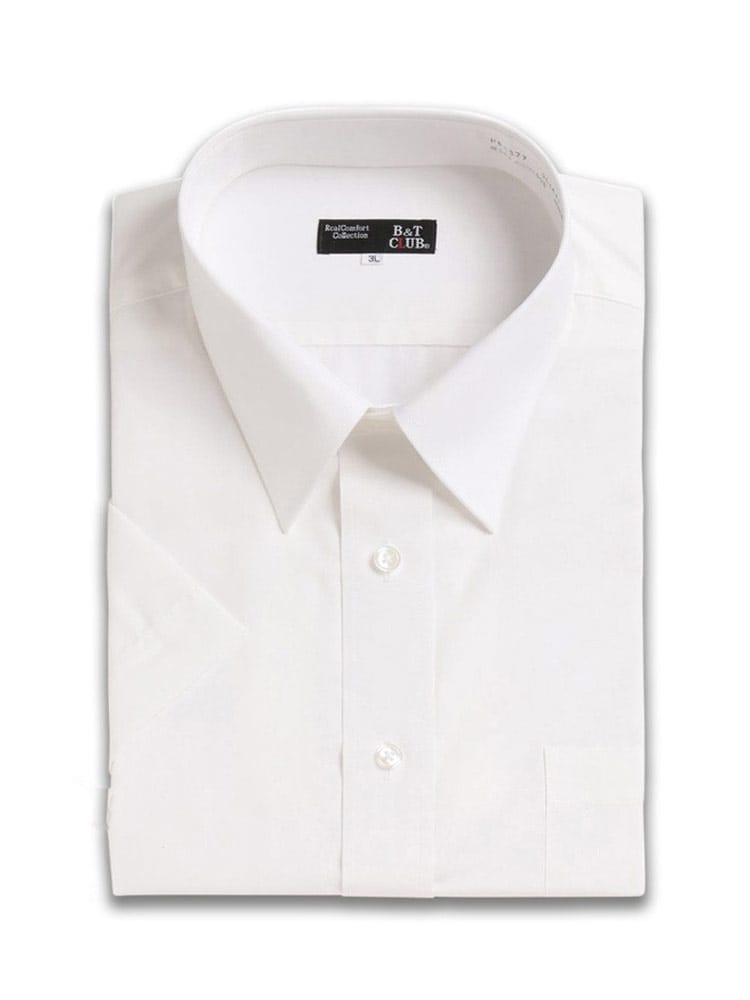 大きいサイズのサカゼンの展開する 形態安定 レギュラーカラー 半袖 ワイシャツです。形態安定のシワになりにくい半袖ワイシャツです。襟はシンプルなレギュラーカラー。コットンとポリエステルをブレンドし着心地を重視しながら機能性も追求。防汚加工で汚れもやや落ちやすいワイシャツになっています。