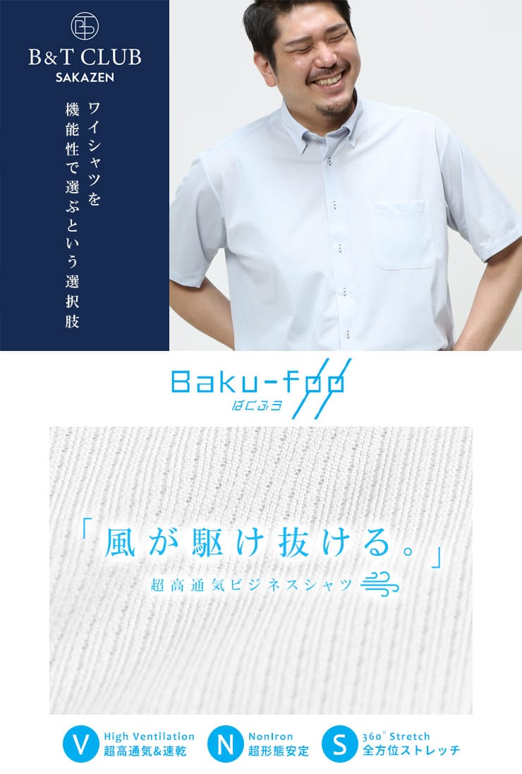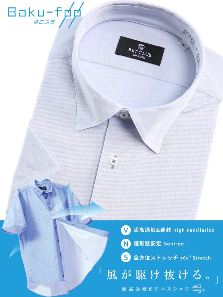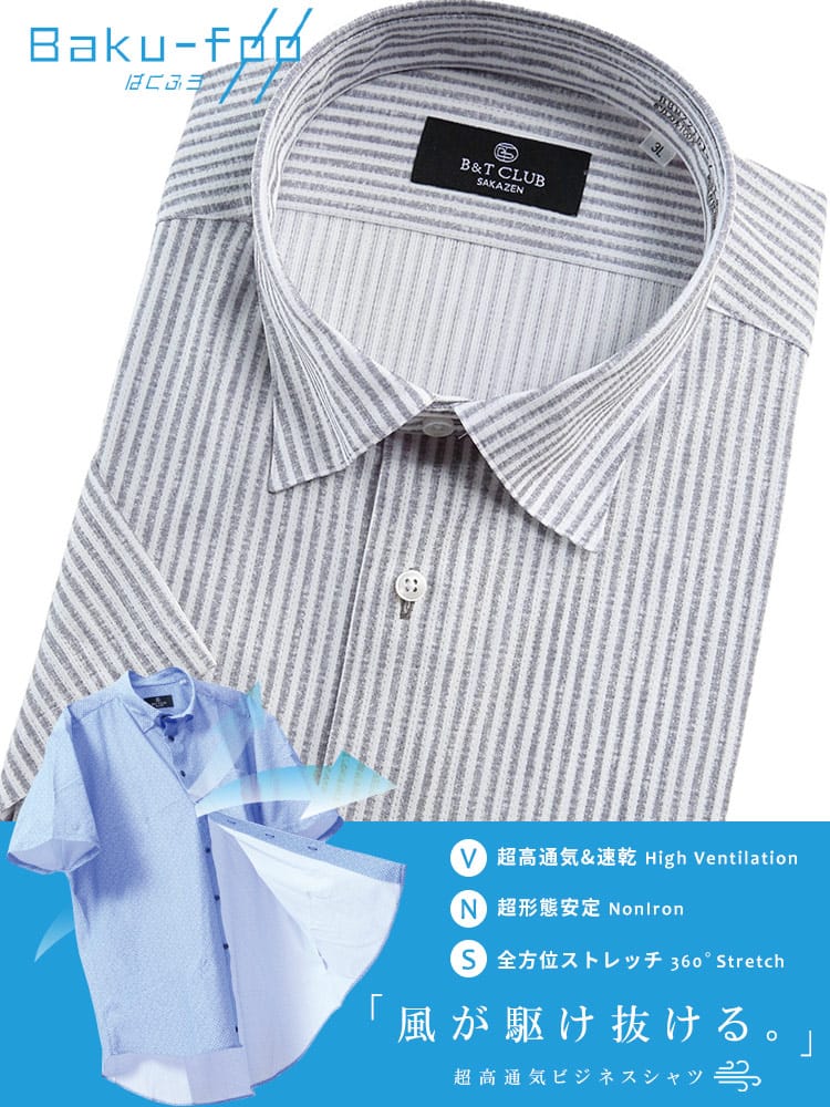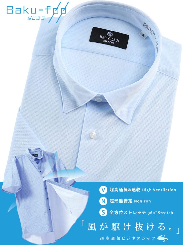 快適機能のBaku-Foo(ばくふう)を搭載した形態安定 ストレッチ スナップダウン 半袖 ワイシャツ SLIMBODYです。高通気性、ノンアイロン、360度ストレッチでお手入れがラクラクで快適な着心地が魅力です。首元はスナップボタンでスッキリとした印象のアイテム。きれいなシルエットのSLIMBODY。