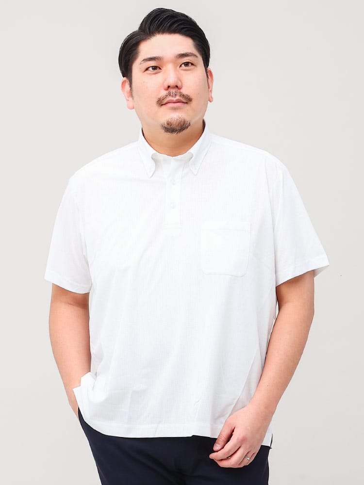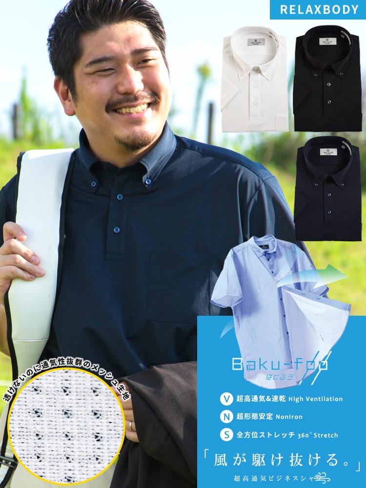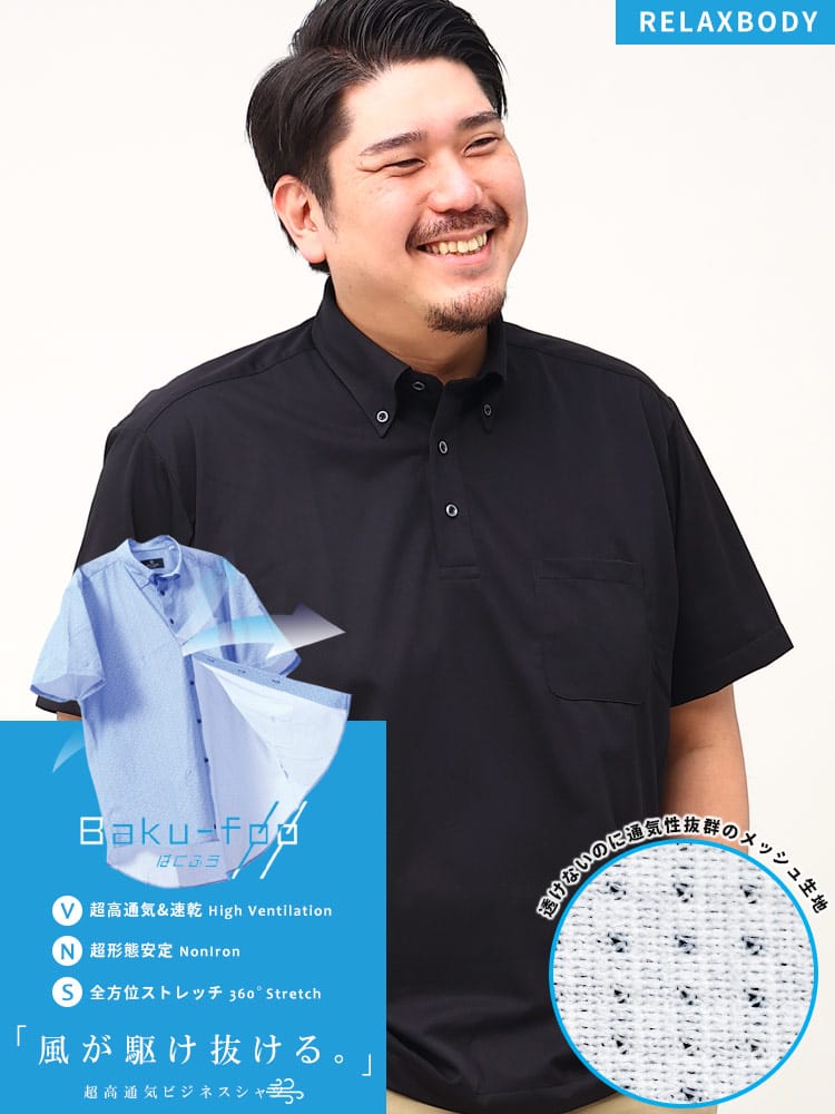 快適機能のBaku-Foo(ばくふう)を搭載した形態安定 ストレッチ ボタンダウン 半袖 ポロシャツ RELAXBODYです。高通気性、ノンアイロン、360度ストレッチでお手入れがラクラクで快適な着心地が魅力です。首元はボタンダウンでスッキリとした印象のアイテム。ゆったり着れるRELAXBODY。
