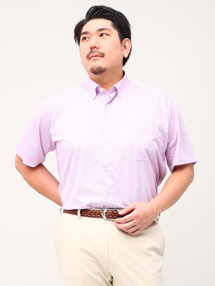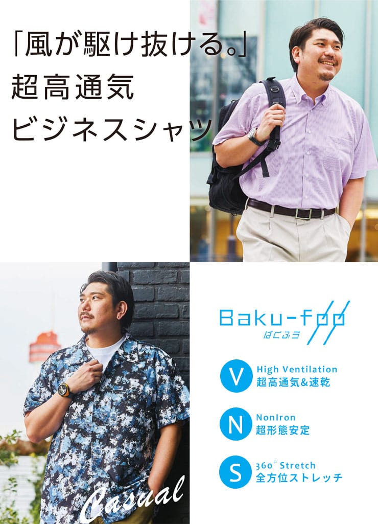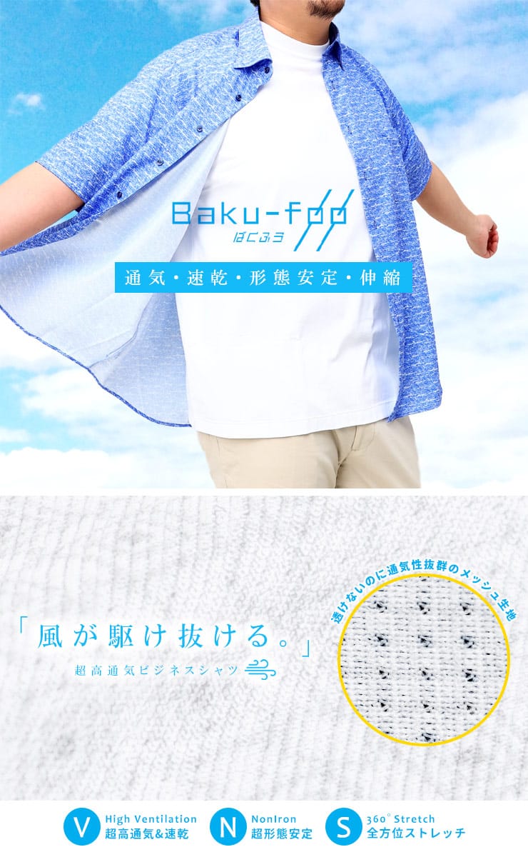快適機能のBaku-Foo(ばくふう)を搭載した形態安定 ストレッチ スナップダウン 半袖 ワイシャツ RELAXBODYです。高通気性、ノンアイロン、360度ストレッチでお手入れがラクラクで快適な着心地が魅力です。首元はスナップダウンでスッキリとした印象のアイテム。ゆったり着れるRELAXBODY。
