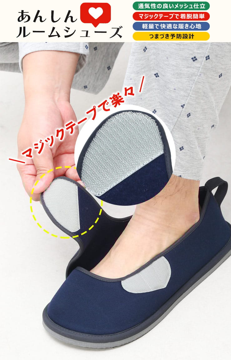 軽量 メッシュ あんしん ルームシューズは、つま先アップ設計でちょっとしたつまづきを防止してくれます。立体型メッシュ仕様のため、通気性が良く、快適は履き心地となっています。マジックテープを使用しているので脱ぎ履きもカンタン。