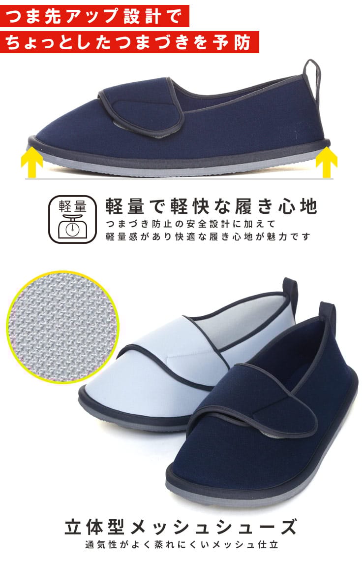 仕様 :立体型メッシュシューズ / マジックテープで着脱簡単 / 軽量 / つま先アップ設計でつまづき設計