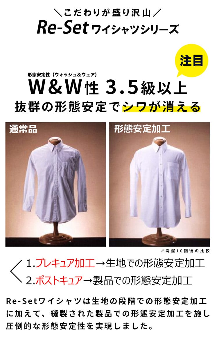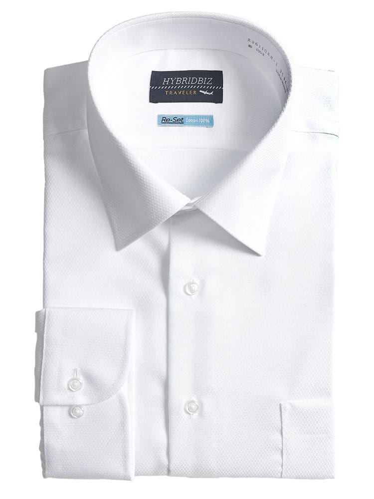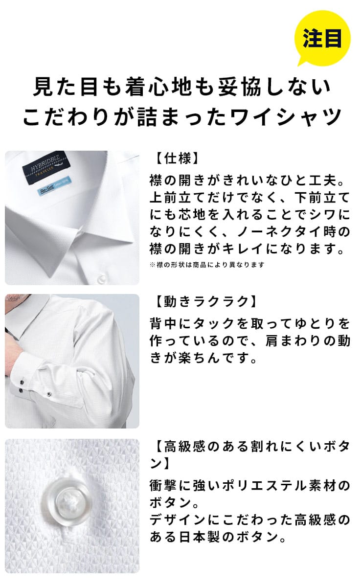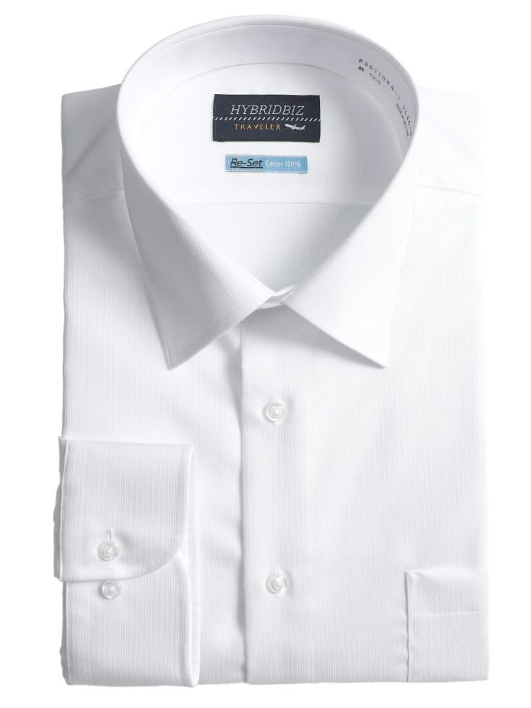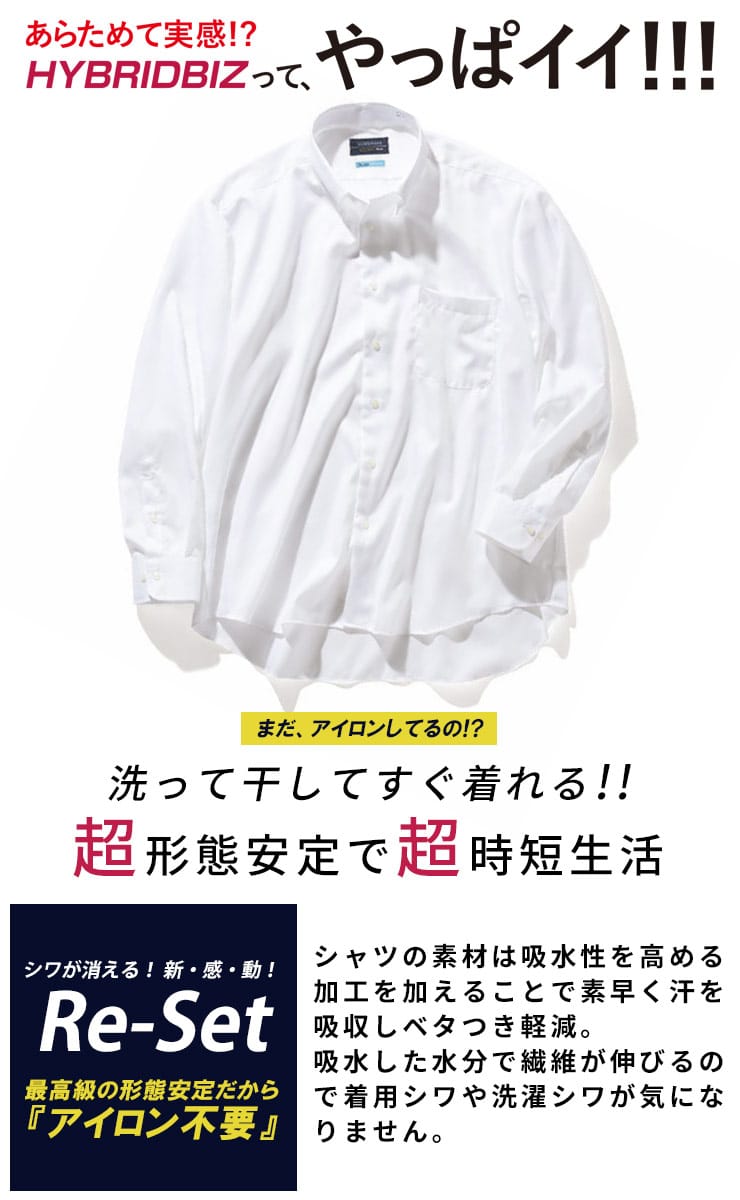 綿100%の天然素材ならではの柔らかな肌触りと、驚異の超形態安定機能を両立させたHYBRIDBIZの長袖ワイシャツです。洗って干すだけでシワが伸びるノンアイロン仕様のため、忙しい毎日のアイロン掛けから解放されます。ゆったりとした「RELAX BODY」設計を採用しており、大きいサイズをお探しの方でも窮屈感なく快適な着心地をキープ。清潔感のあるワイドカラーのデザインは、タイドアップはもちろん、ノーネクタイでも首元を美しく見せます。ビジネスシーンに欠かせない「上質感」と「手入れの楽さ」を兼ね備えた、オールシーズン活躍する一着です。