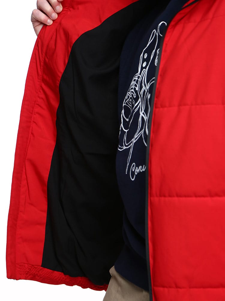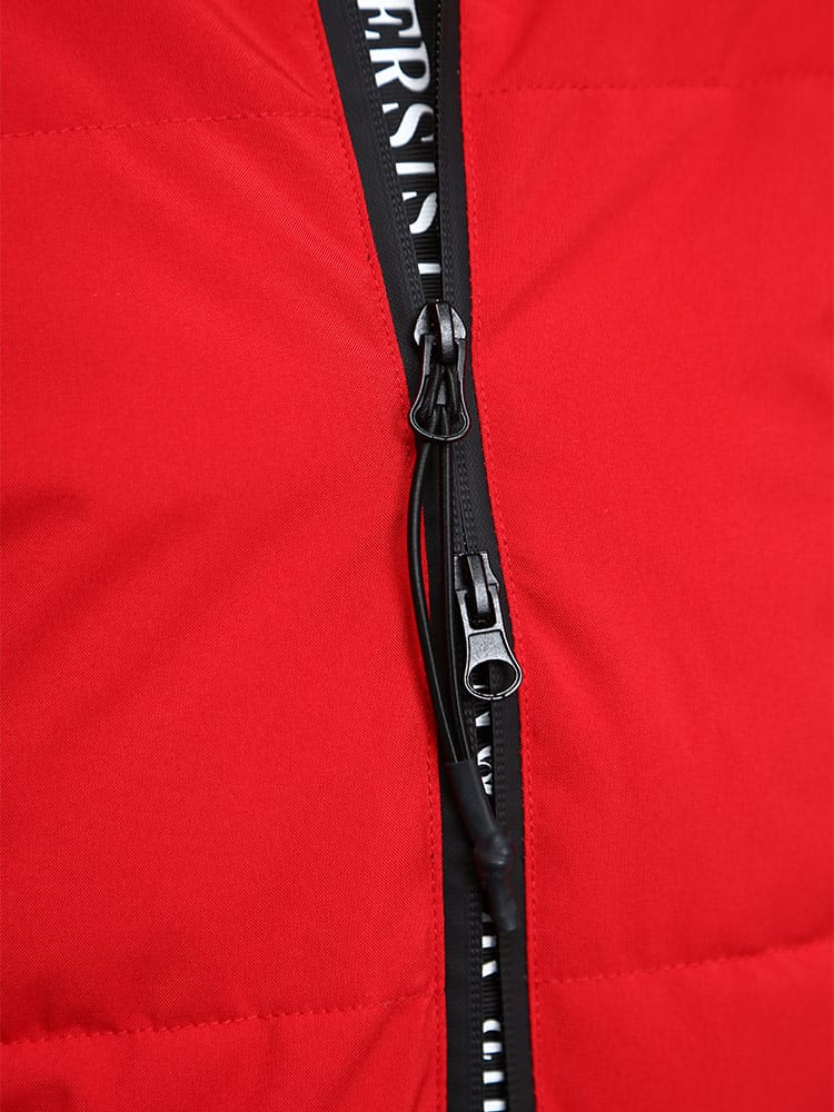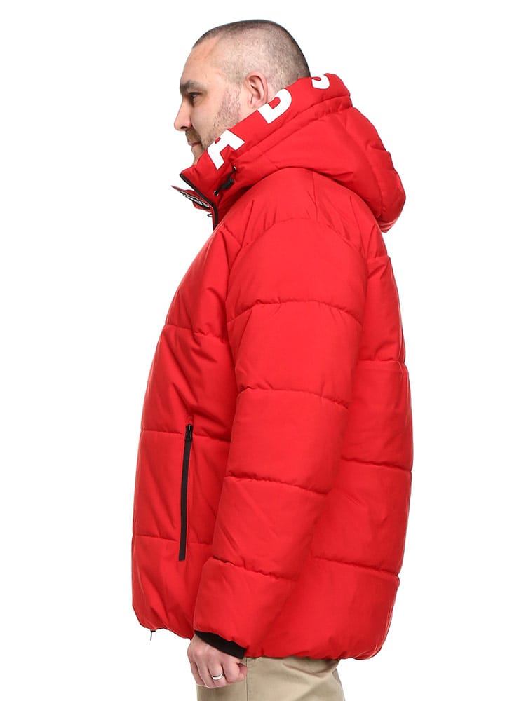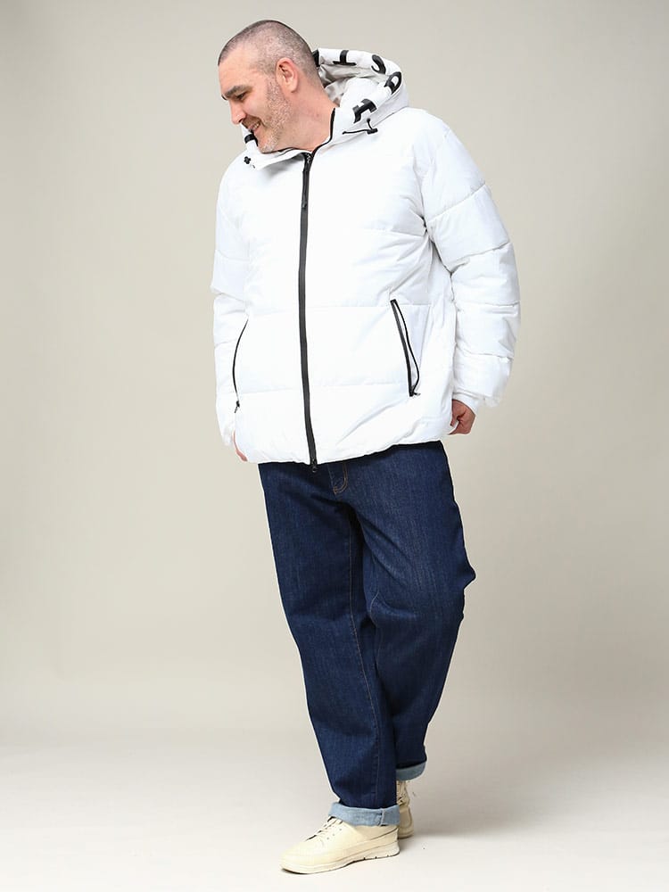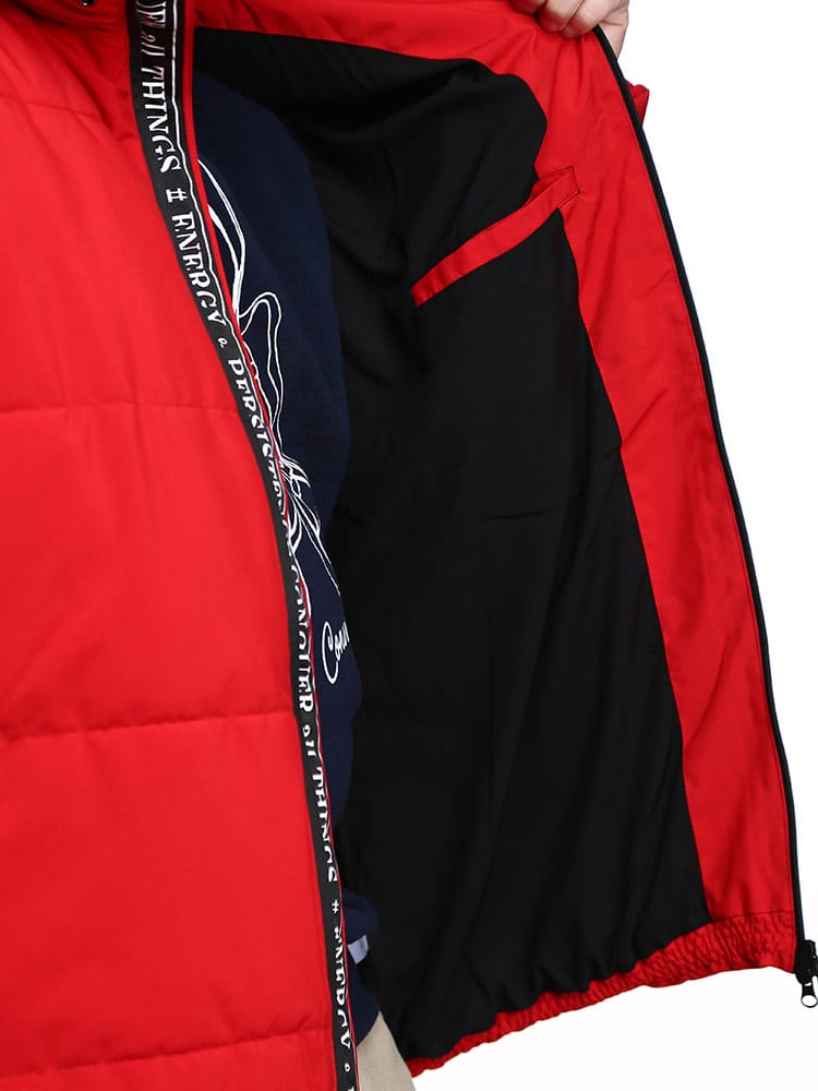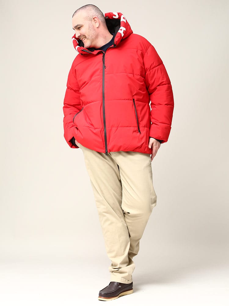 プリント フード フルジップ 中綿 ジャケット。伸縮性が動きやすさをサポートしてくれ、アクティブに楽しめます。更に防風・撥水加工を搭載しているので、急な悪天候でも安心。フードと裾部分はドローコード付き。フロントはダブルジップ。ジップ裏にはロゴラインテープ採用で、いいアクセント。止水ファスナーなので、浸水も防止できます。表ポケットの裏地は裏起毛で、あったか仕様。内側にもポケットが付いています。寒い日でも快適に過ごせるジャケットです。