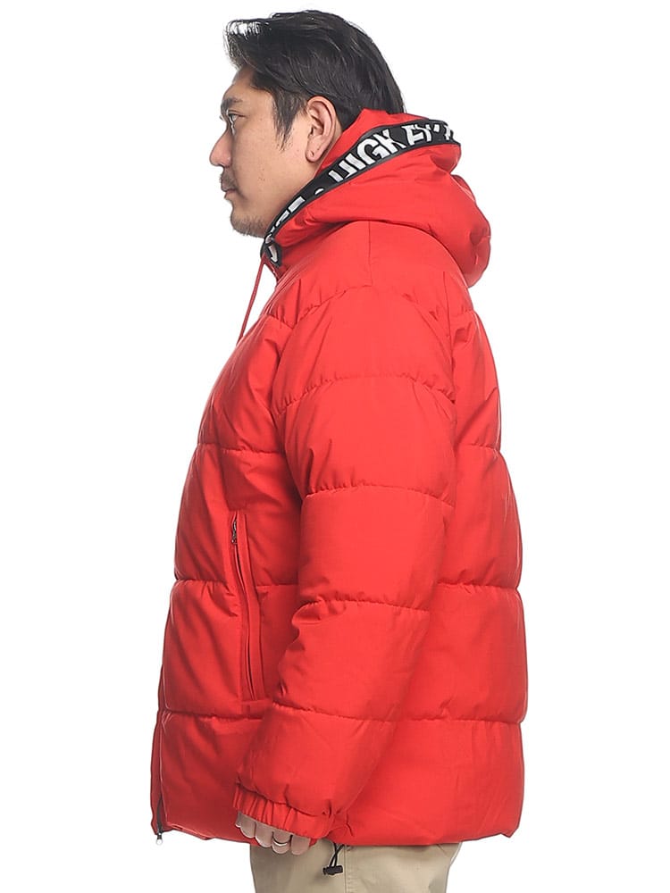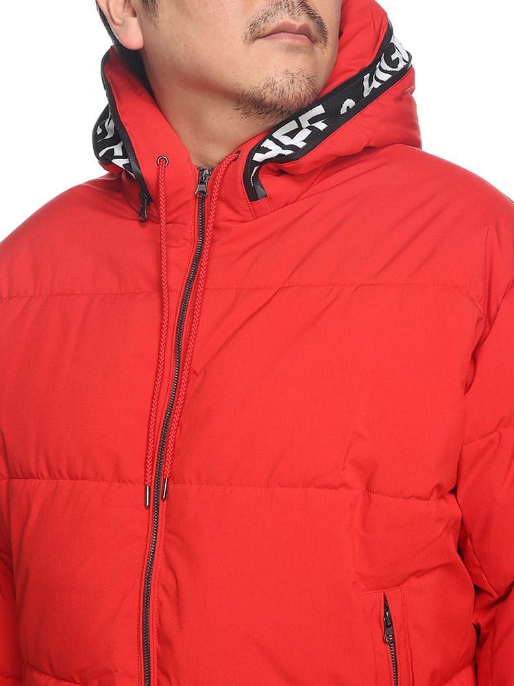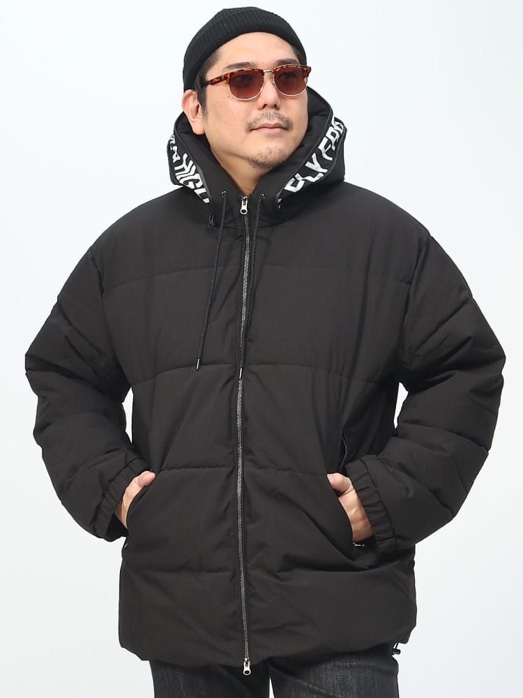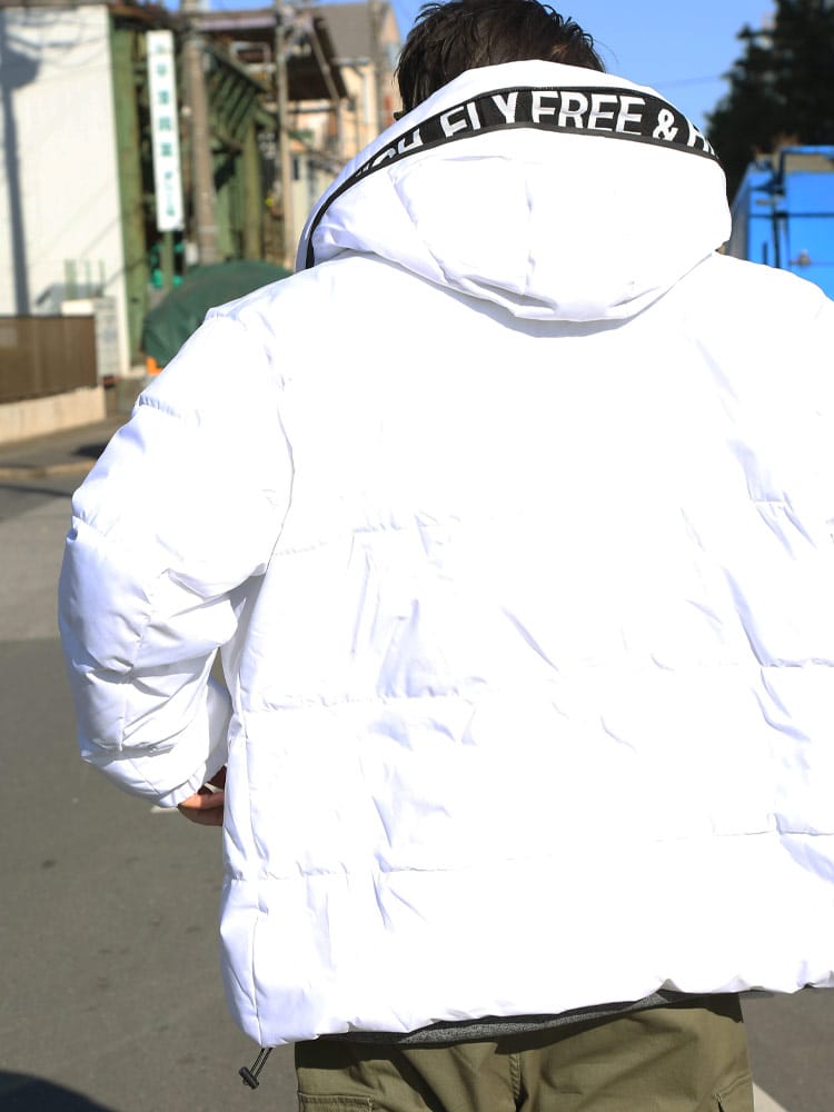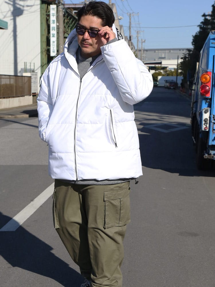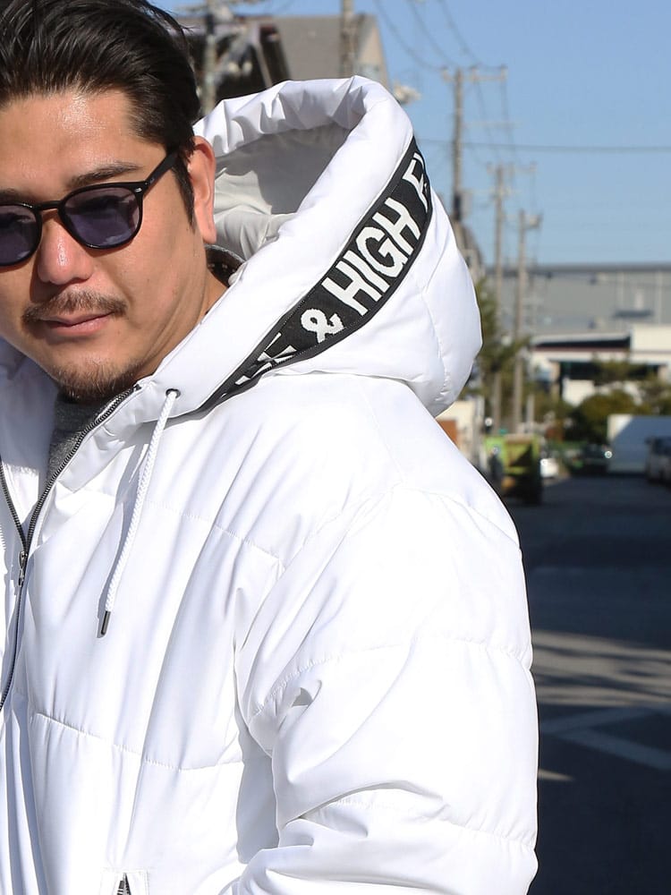 この中綿ジャケットは、撥水加工が施された耐久防水素材で作られており、雨や雪を効果的にはじきます。フード部分にはメッセージロゴデザインされており、フルジップクロージャーが使い勝手の良さを提供します。保温性に優れた中綿が寒い天候でも暖かさを保ち、防風機能も搭載されているため、風の強い日にも快適に過ごせます。機能的でありながらもファッション性を兼ね備えた、アウトドア活動に適したジャケットです。