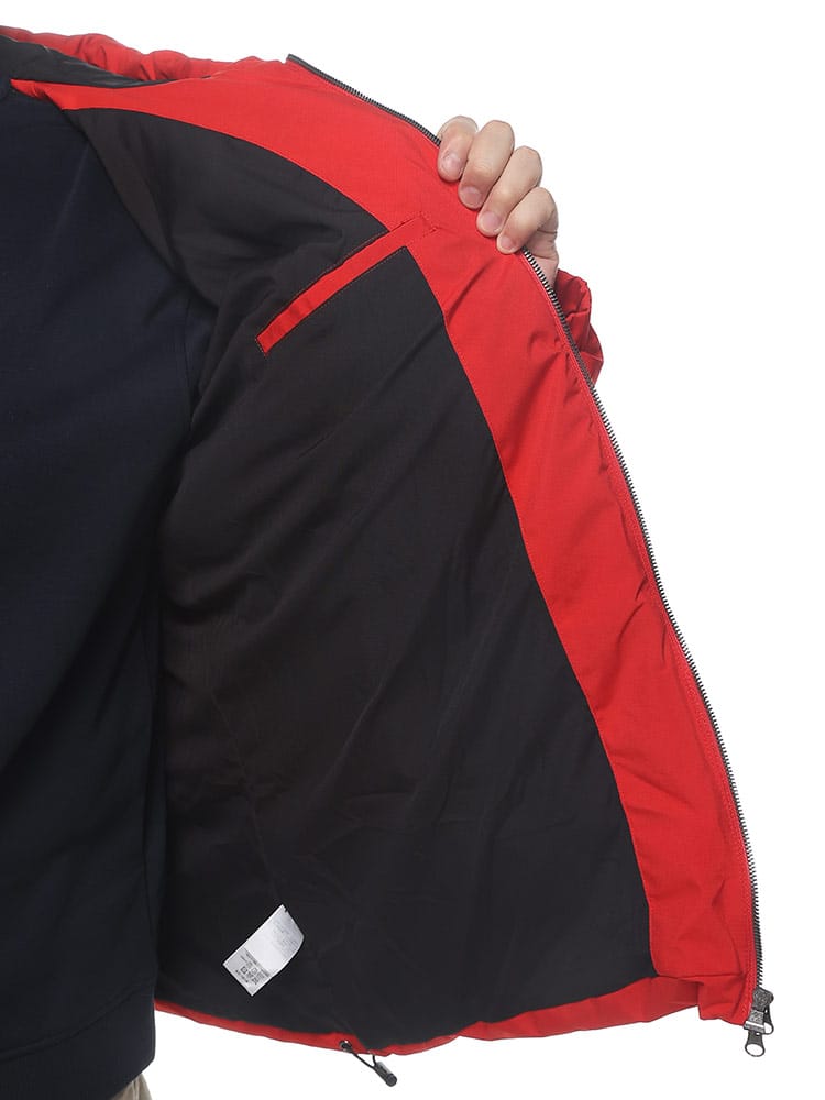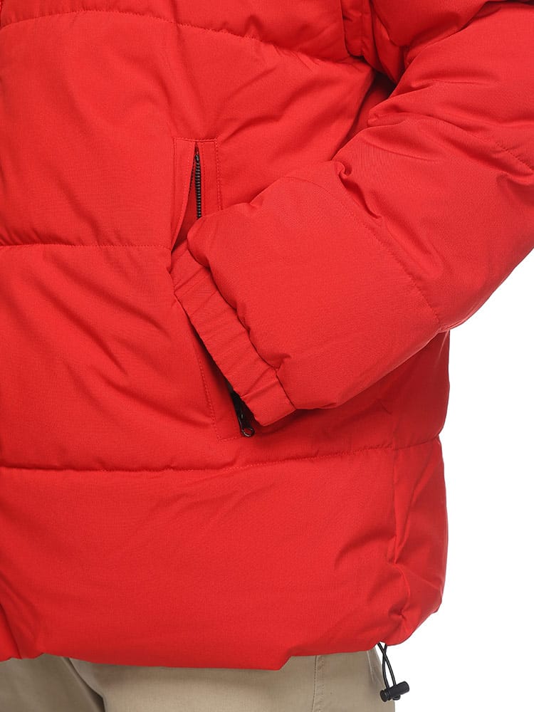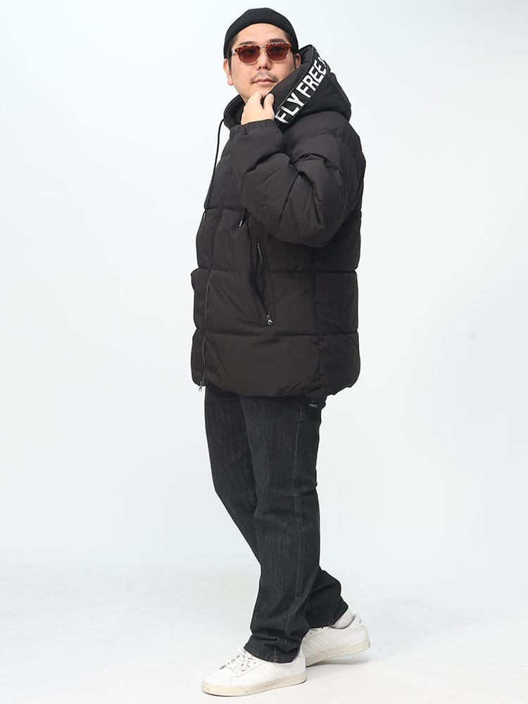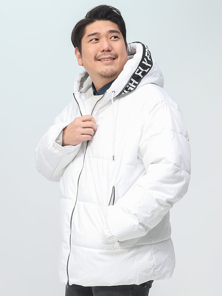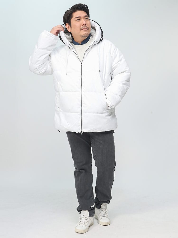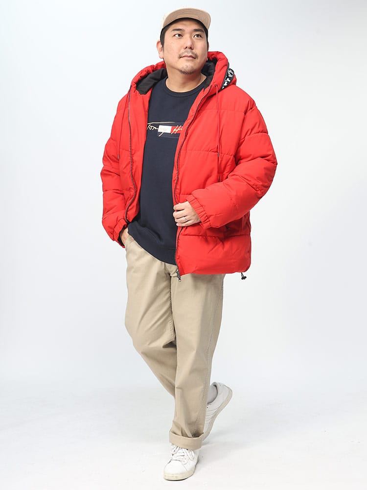 この中綿ジャケットは、撥水加工が施された耐久防水素材で作られており、雨や雪を効果的にはじきます。フード部分にはメッセージロゴデザインされており、フルジップクロージャーが使い勝手の良さを提供します。保温性に優れた中綿が寒い天候でも暖かさを保ち、防風機能も搭載されているため、風の強い日にも快適に過ごせます。機能的でありながらもファッション性を兼ね備えた、アウトドア活動に適したジャケットです。