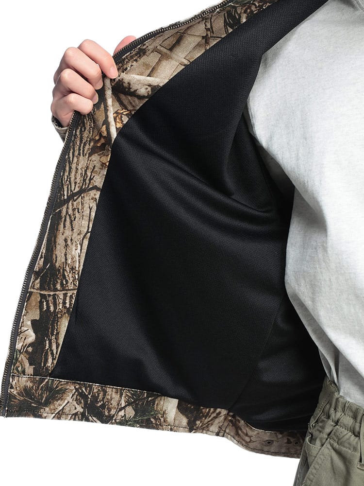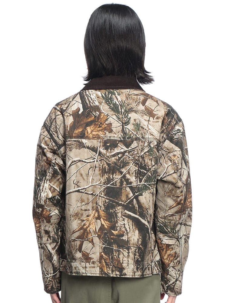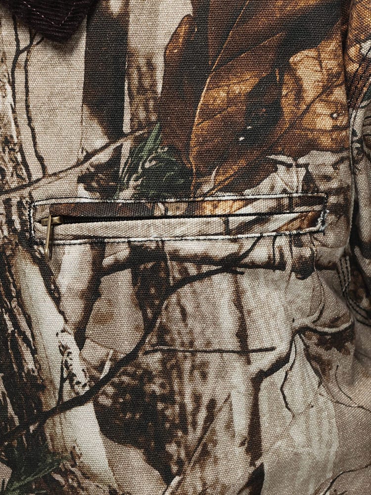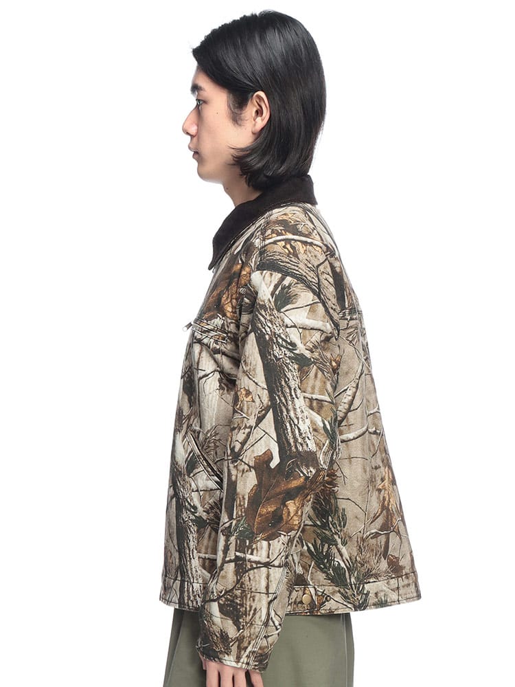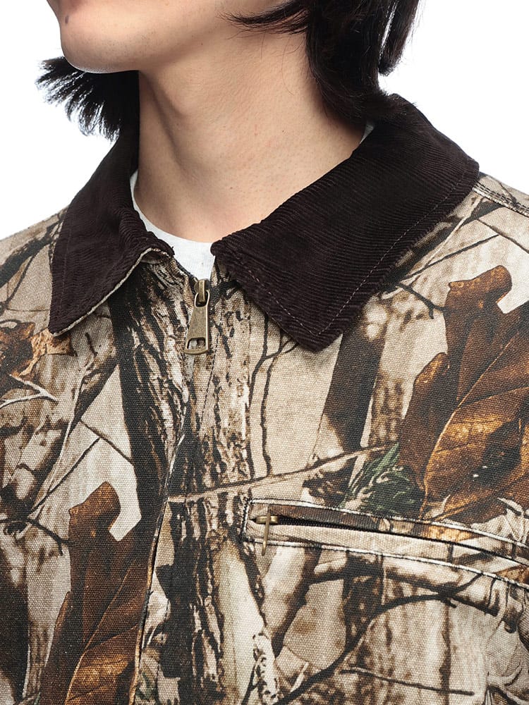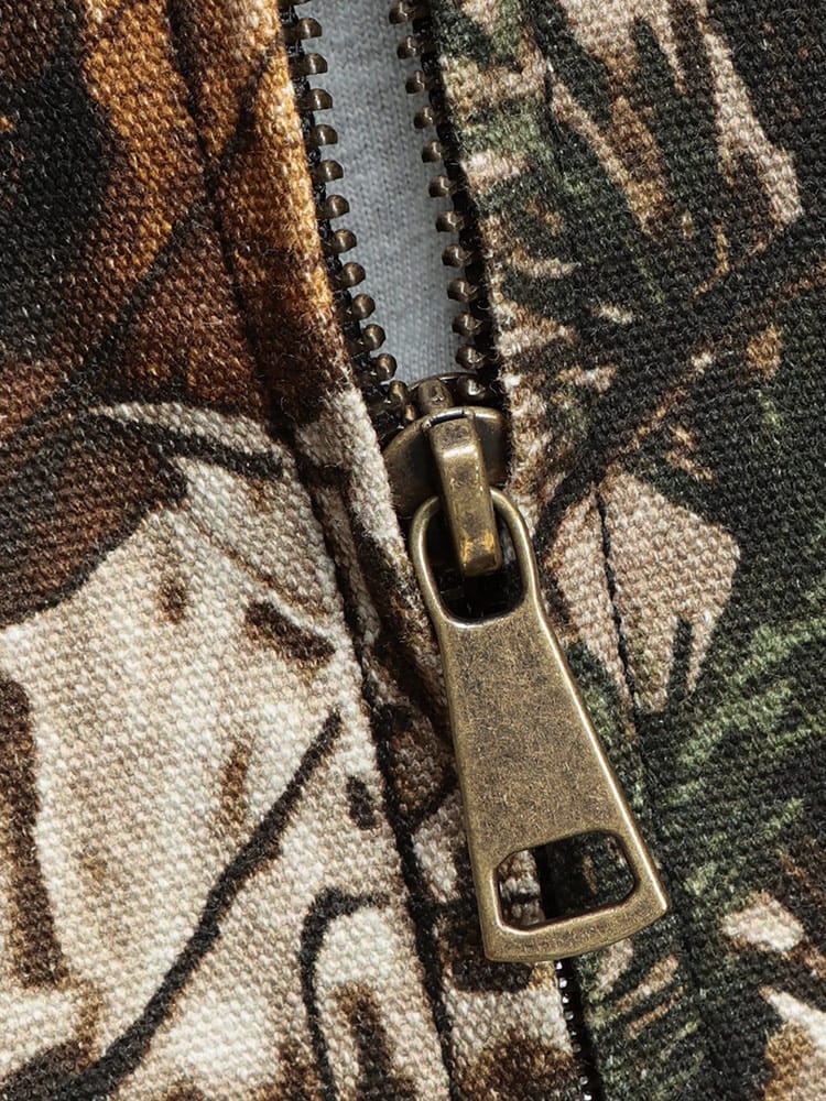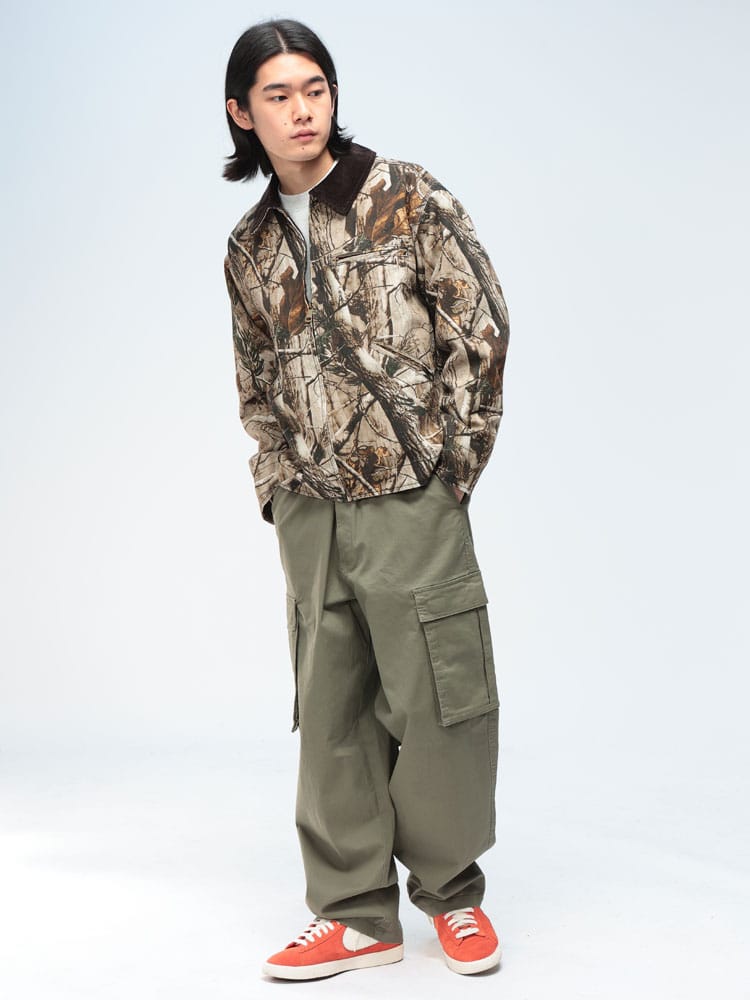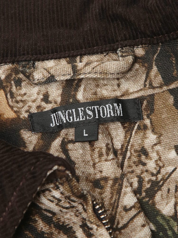 都市を纏う、カモフラージュ・ブルゾン。一瞬で視線を集める、JUNGLE STORMの迷彩柄フルジップジャケットが登場。ベーシックなブルゾン型に、大胆なカモフラージュ総柄をON。単なるアウターではなく、個性を主張するメインアイテムへと昇華させました。肌触りの良いコーデュロイ(コール天)の衿が、ハードな迷彩柄に温かみとクラシカルなアクセントをプラス。脱いだ際にも心地よい裏地メッシュ仕様は、長時間の着用でも蒸れにくく、秋から冬にかけての頼れる相棒となります。シングルジップと外側2つのポケットというミニマルなディテールが、総柄デザインを際立たせ、タウンユースに最適な洗練されたミリタリースタイルを完成させます。