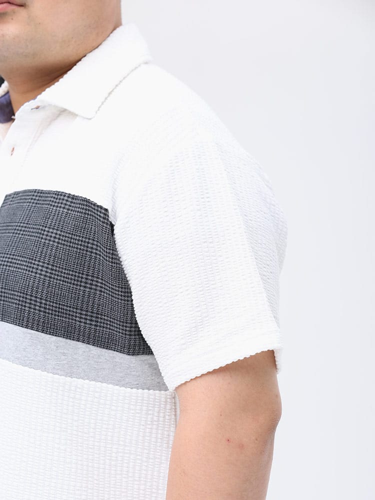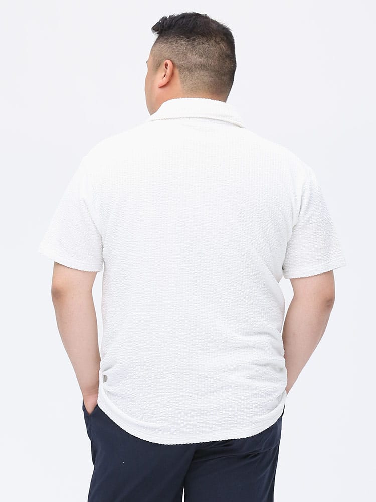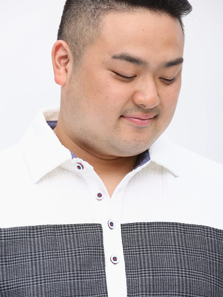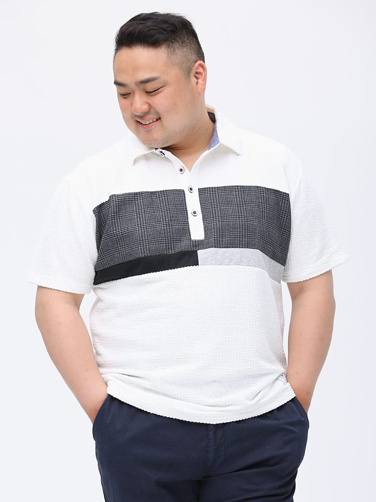 カットサッカー生地で仕上げたリッラクス感のある胸切替 半袖 ポロシャツです。胸の切り替えデザインがお洒落なアイテム。左裾にタグ付き。コットン配合生地を使用し、サラッとした肌触りです。大人のカジュアルスタイルにおすすめの一枚です。