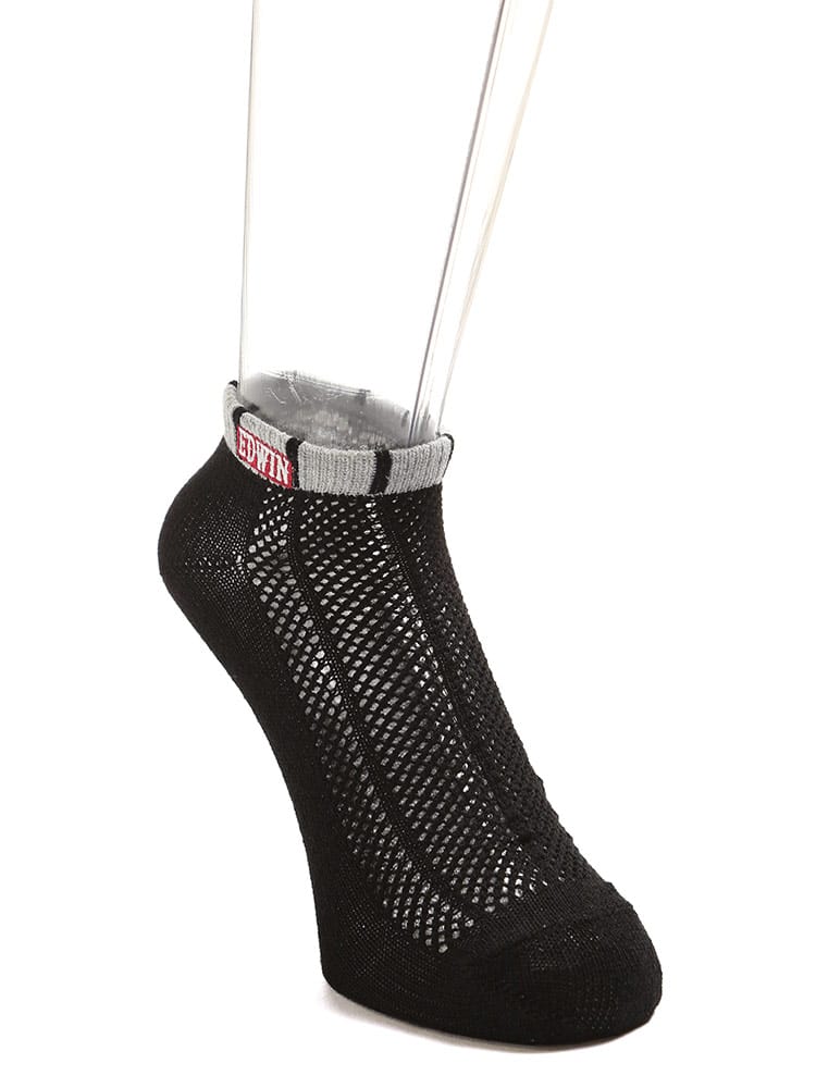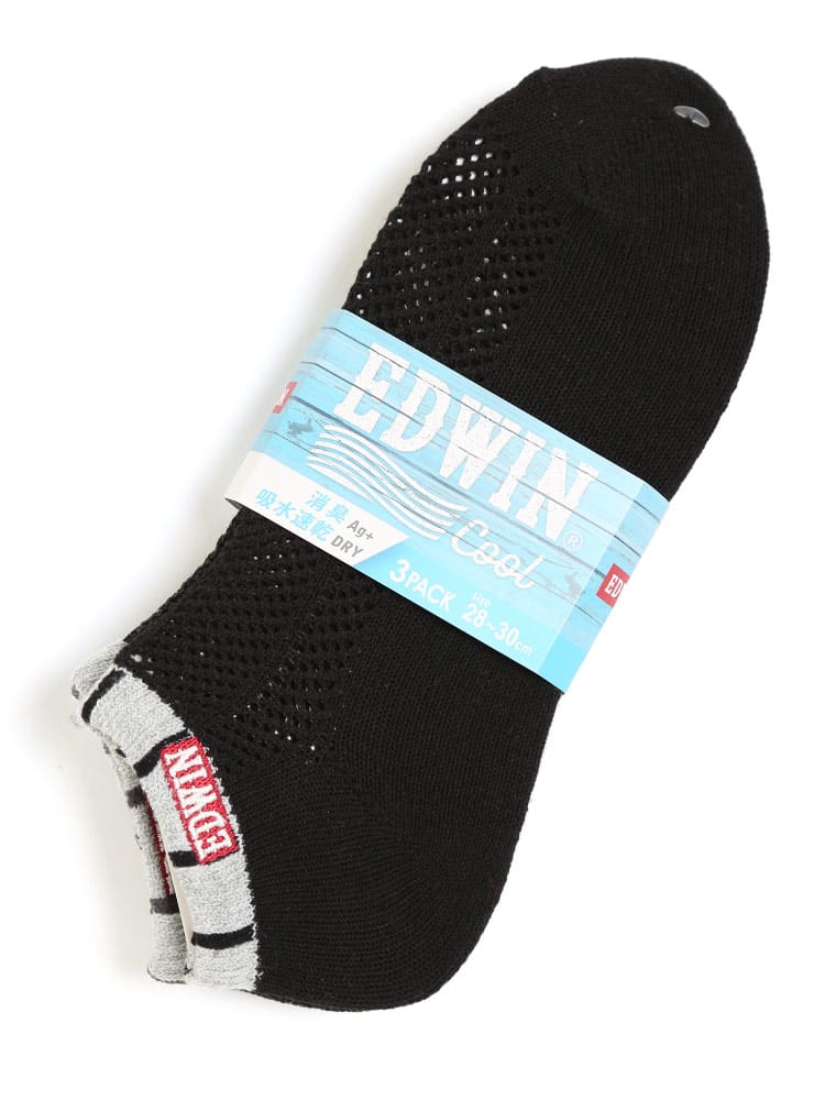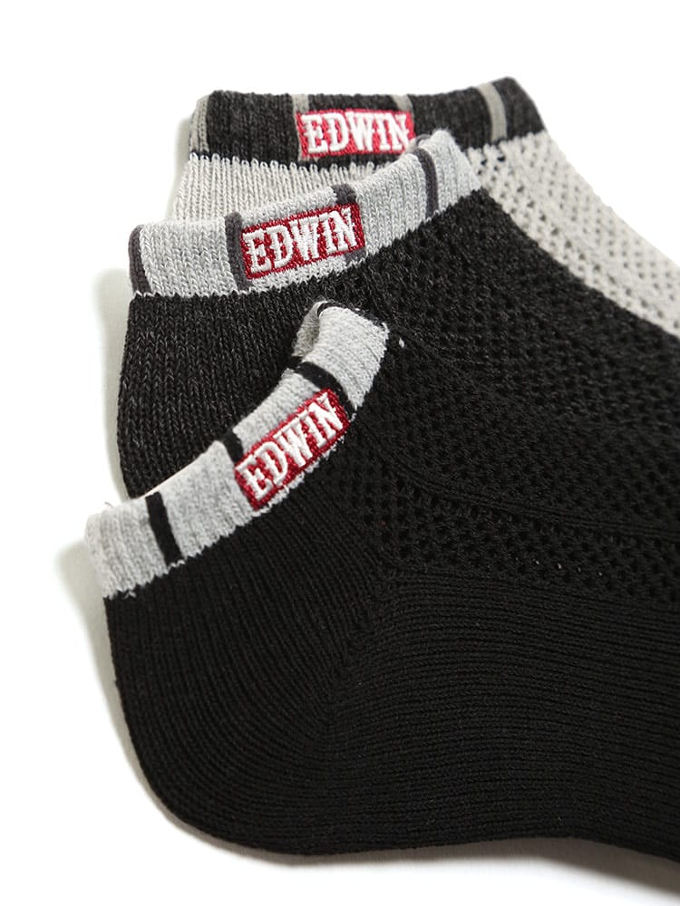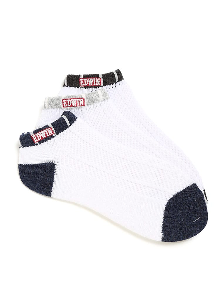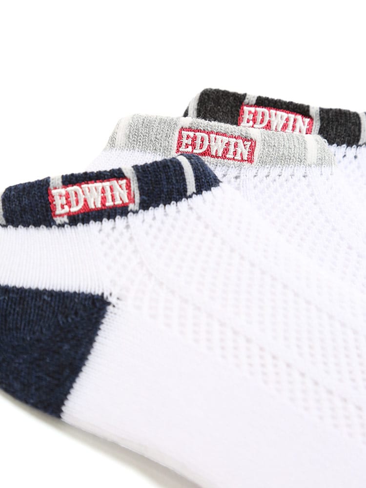スニーカーやカジュアルシューズに相性の良いEDWINのアンクル丈ソックスです。洗い替えに便利な3足セットでご用意。足の甲部分に大き目なメッシュを採用し、通気性が抜群です。吸汗速乾と消臭機能を追加しているので、快適な環境を持続してくれます。ワンポイントロゴ刺繍とマルチボーダーがオシャレ。使いやすいカラーバリエーションでどんなシューズとも相性抜群です。
