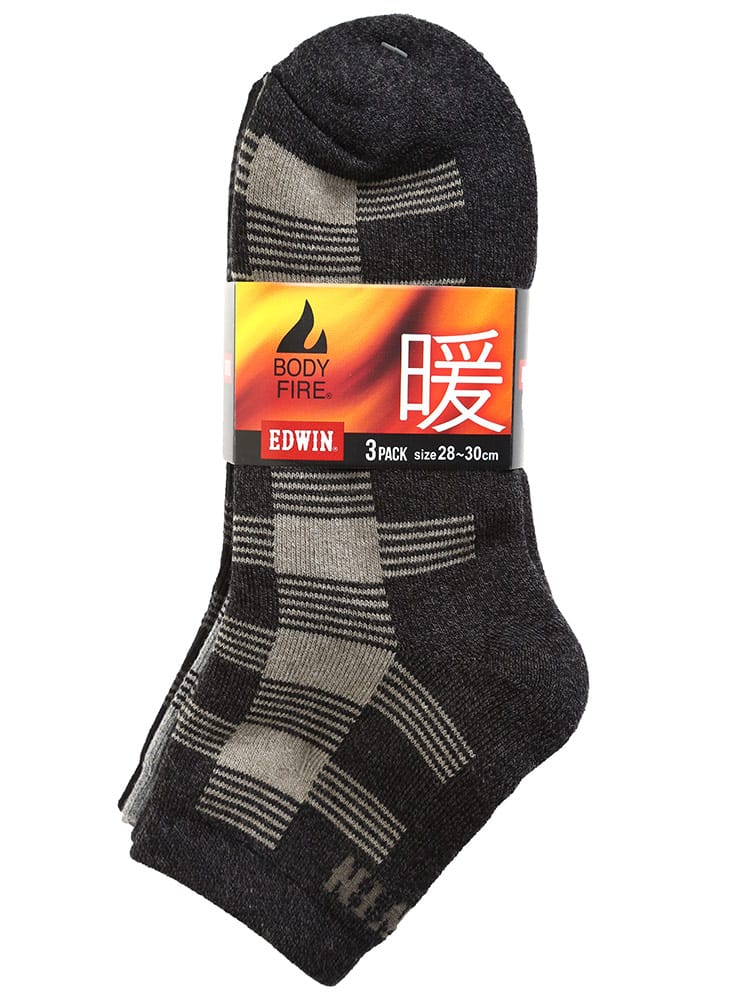 EDWINのBODYFIRE ソックス 3足セットです。チェック柄がカジュアルでお洒落なアイテム。暖かなBODY FIRE仕様。これからの寒い季節にぴったりのアイテムです。