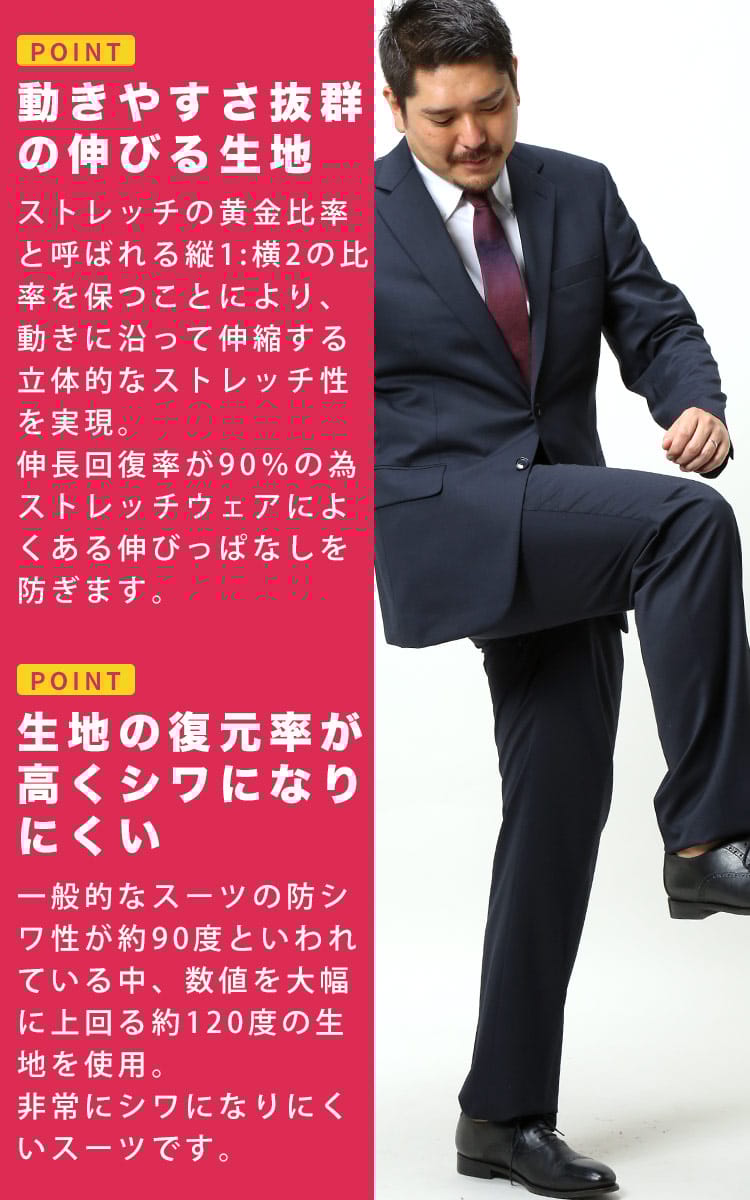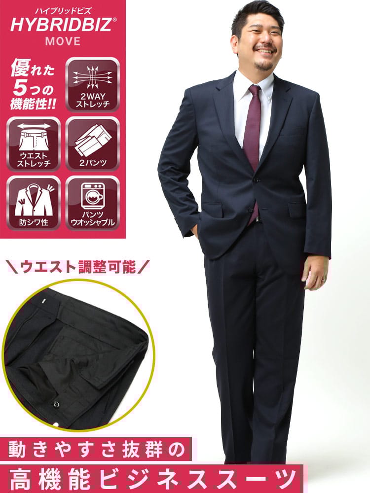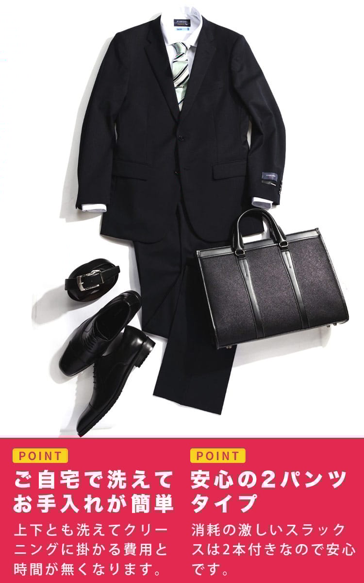 毛素材が混ざってできたハイブリッドビズのツーパンツスーツ。無地でツーパンツウォッシャブル対応なのでビジネスシーンにヘビロテが期待出来ます。薄手の生地で背抜きタイプの春夏仕様に。ストレッチも効いているので外回りのビジネスマンにはぴったりでぜひおすすめしたい一着。※裾は切りっぱなし