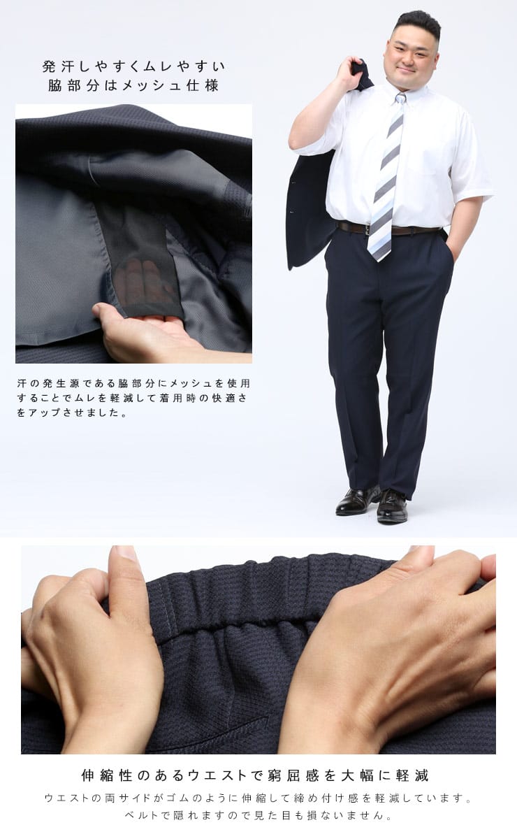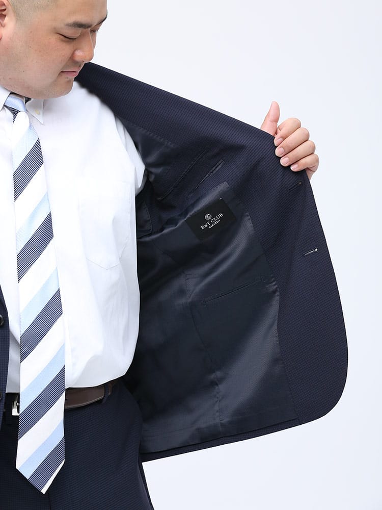 仕様 :外側ポケット数×7つ / 内側ポケット数×4つ / シングル2つボタン / 背抜き / セッパタイプ / 額縁なし / センターベント / ウエスト調節ゴム / ジップフライ / ノータック / 2パンツ / ウォッシャブル / COOLMAX