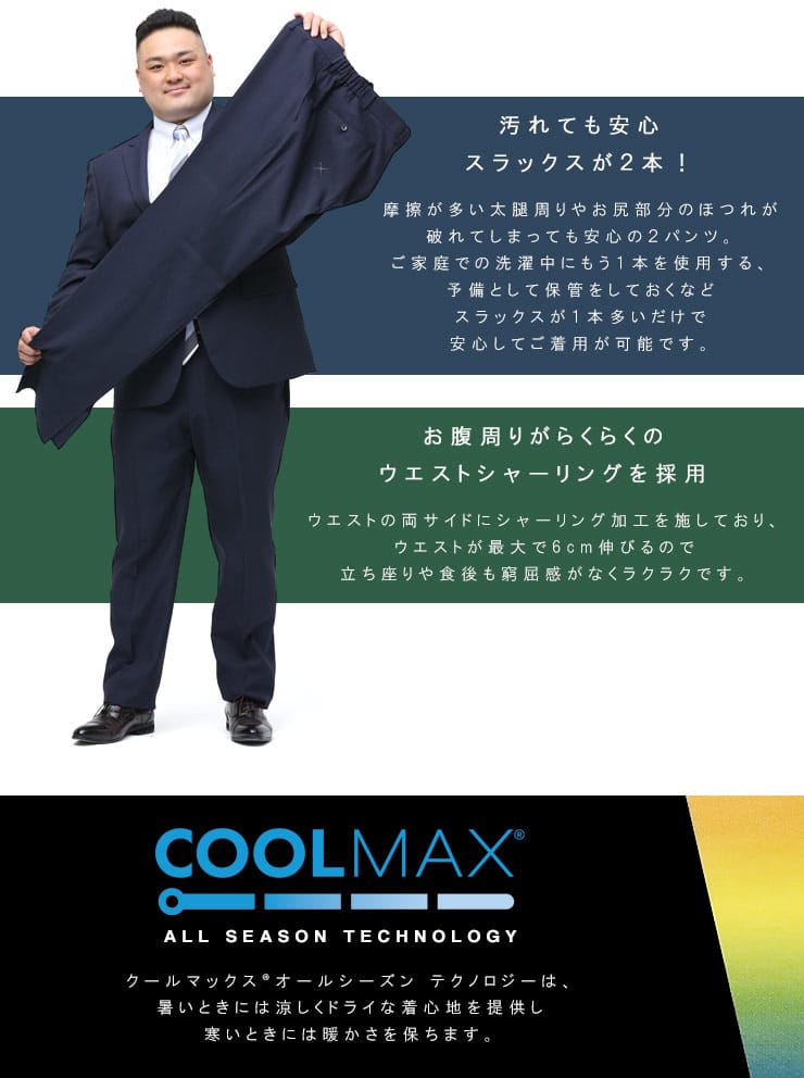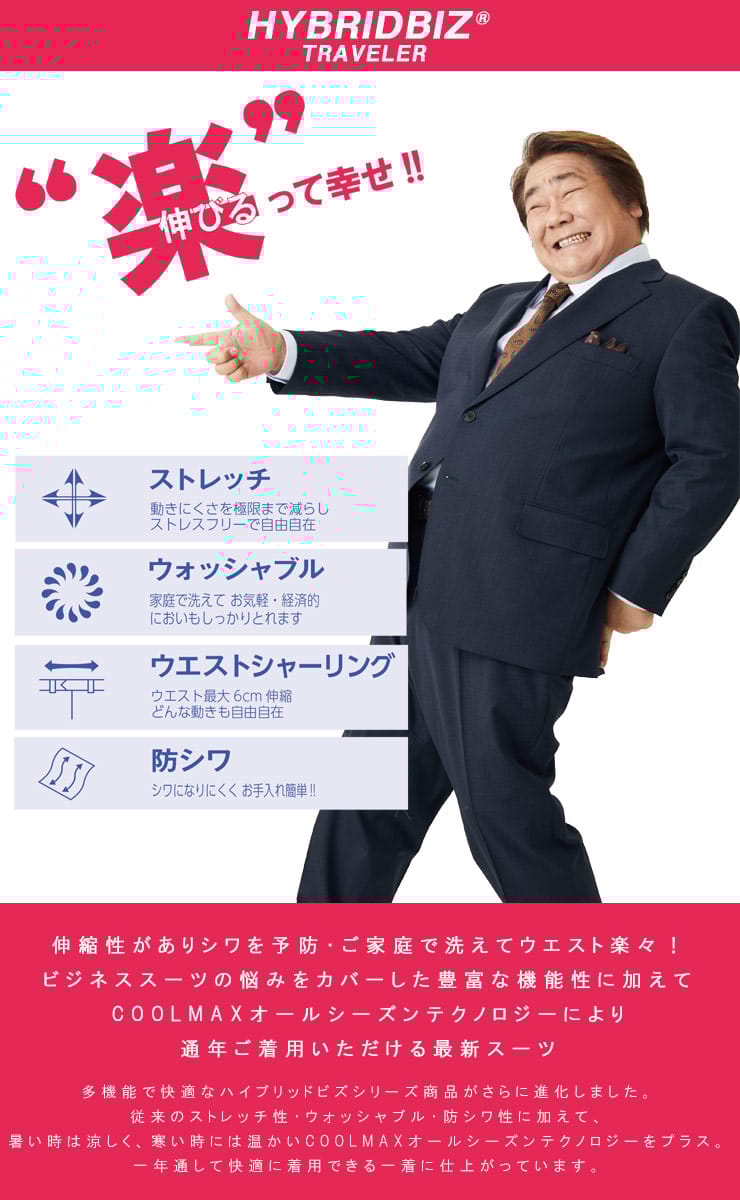 快適な着心地が魅力的なHYBRIDBIZのシングル 2ツ釦 ツーパンツ スーツです。COOLMAXオールシーズンテクノロジーで暑い時には涼しく、寒い時には暖かく、オールシーズンご着用いただけます。ジャケット背面はメッシュになっています。ご家庭で簡単にお手入れが出来る上下ウォッシャブル機能付き。パンツは毎日着るビジネスマンには嬉しい2本セット。
