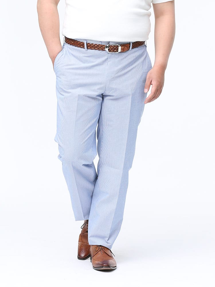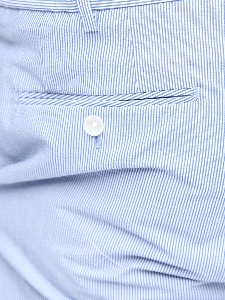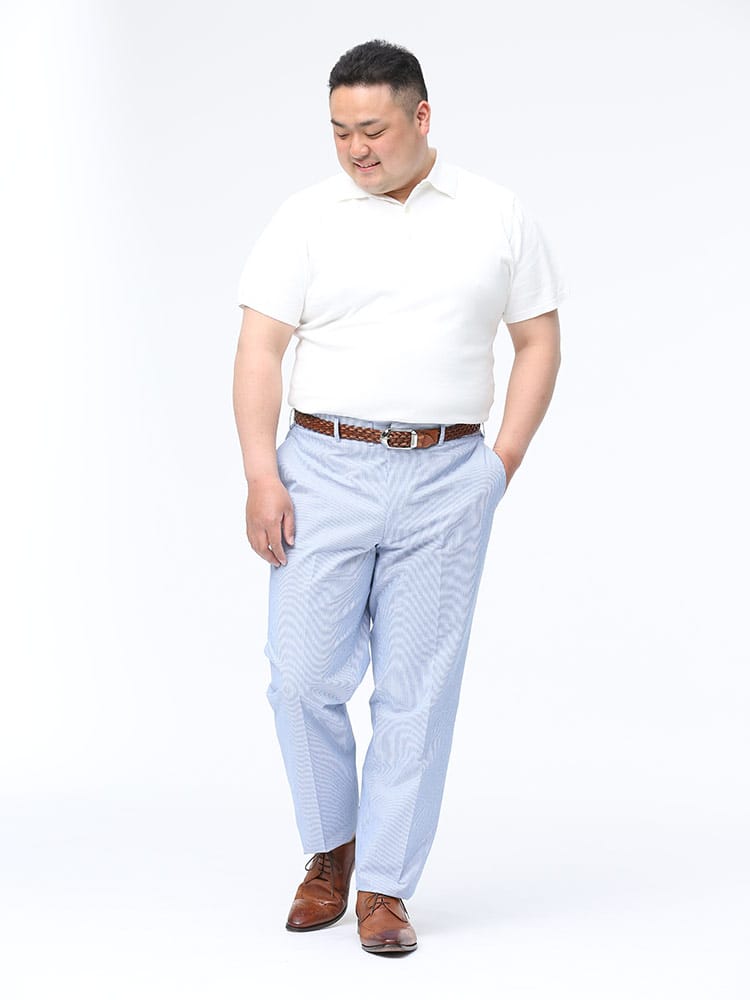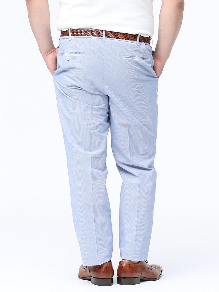 清涼感のある麻混のシアサッカー生地を使用したノータック パンツ。ストライプデザインが品のあるアイテム。ウエストはゴムでリラックス感のある穿き心地。スッキリとしたノータックでビジカジスタイルにマッチする一本。